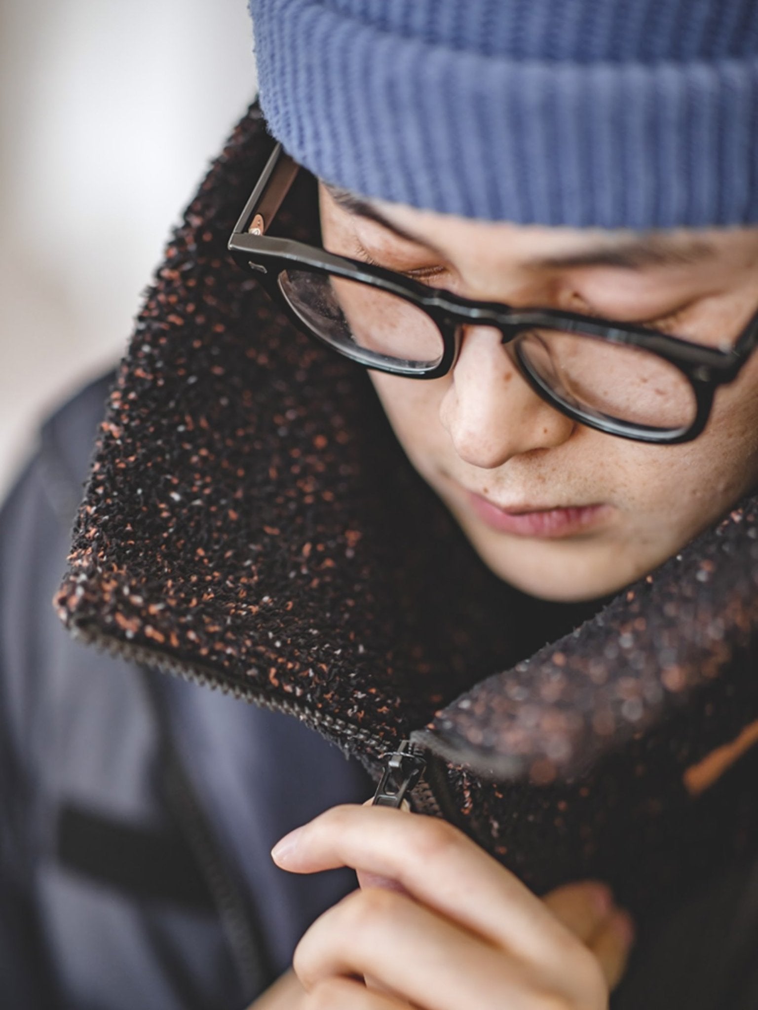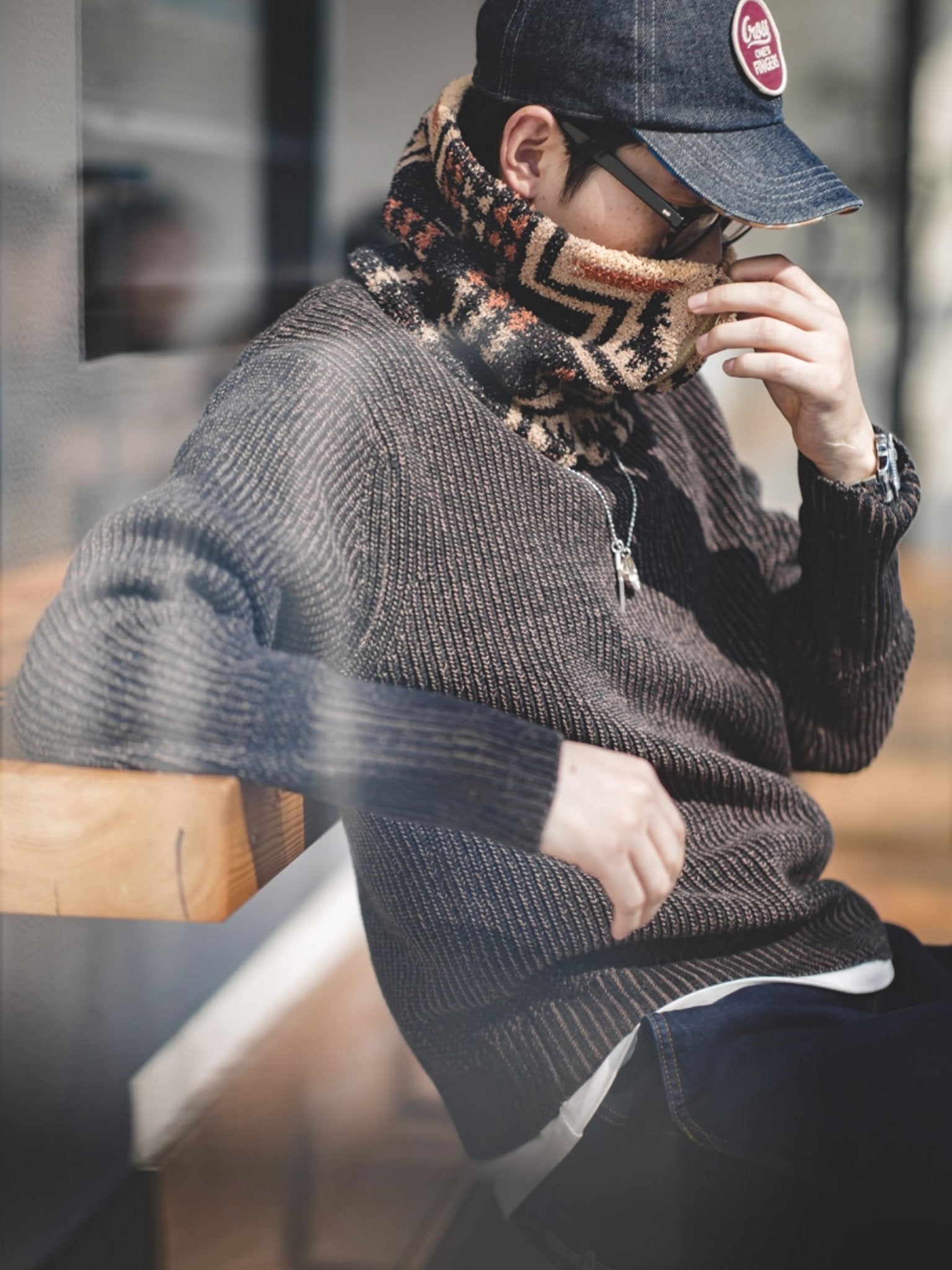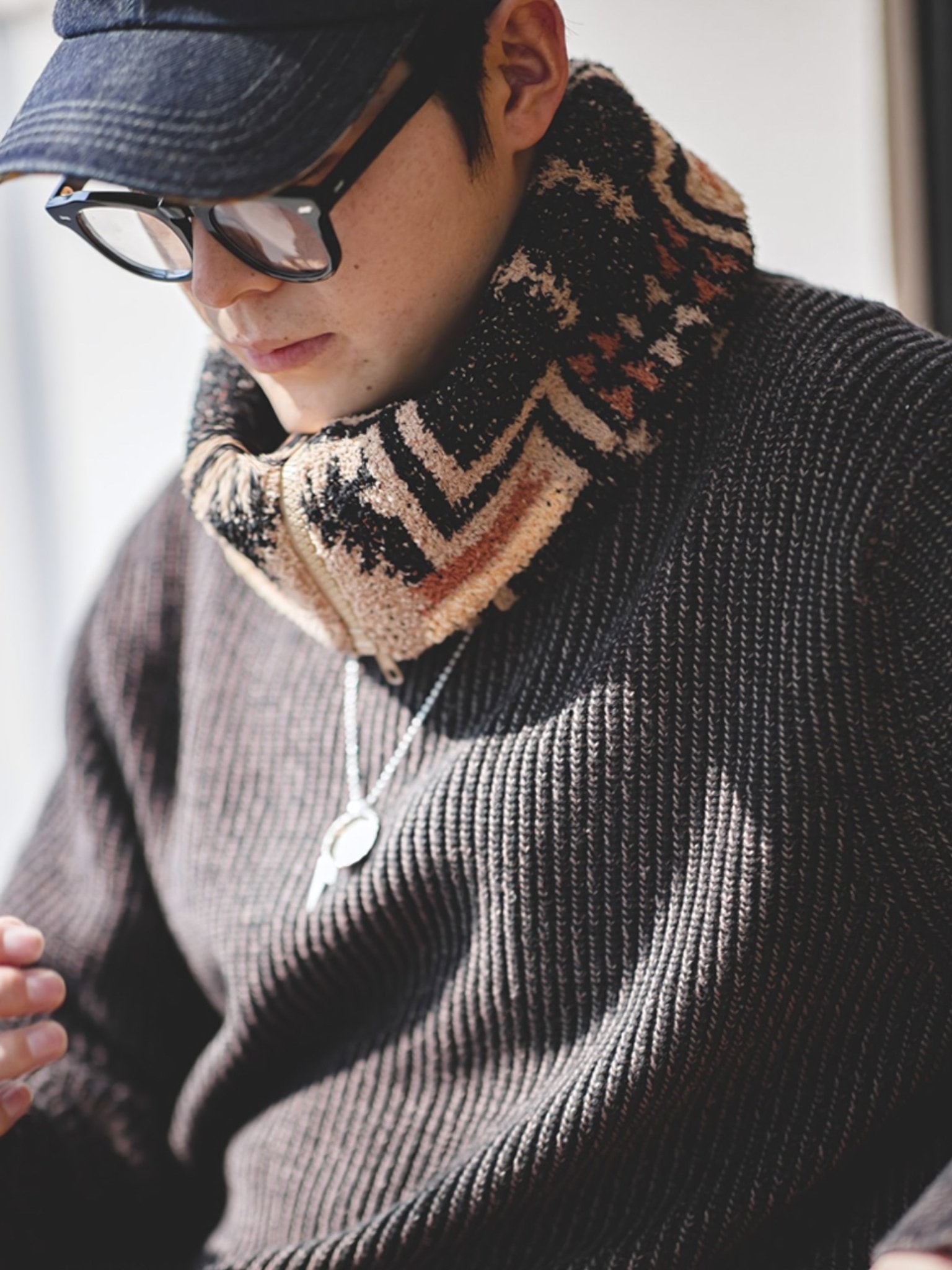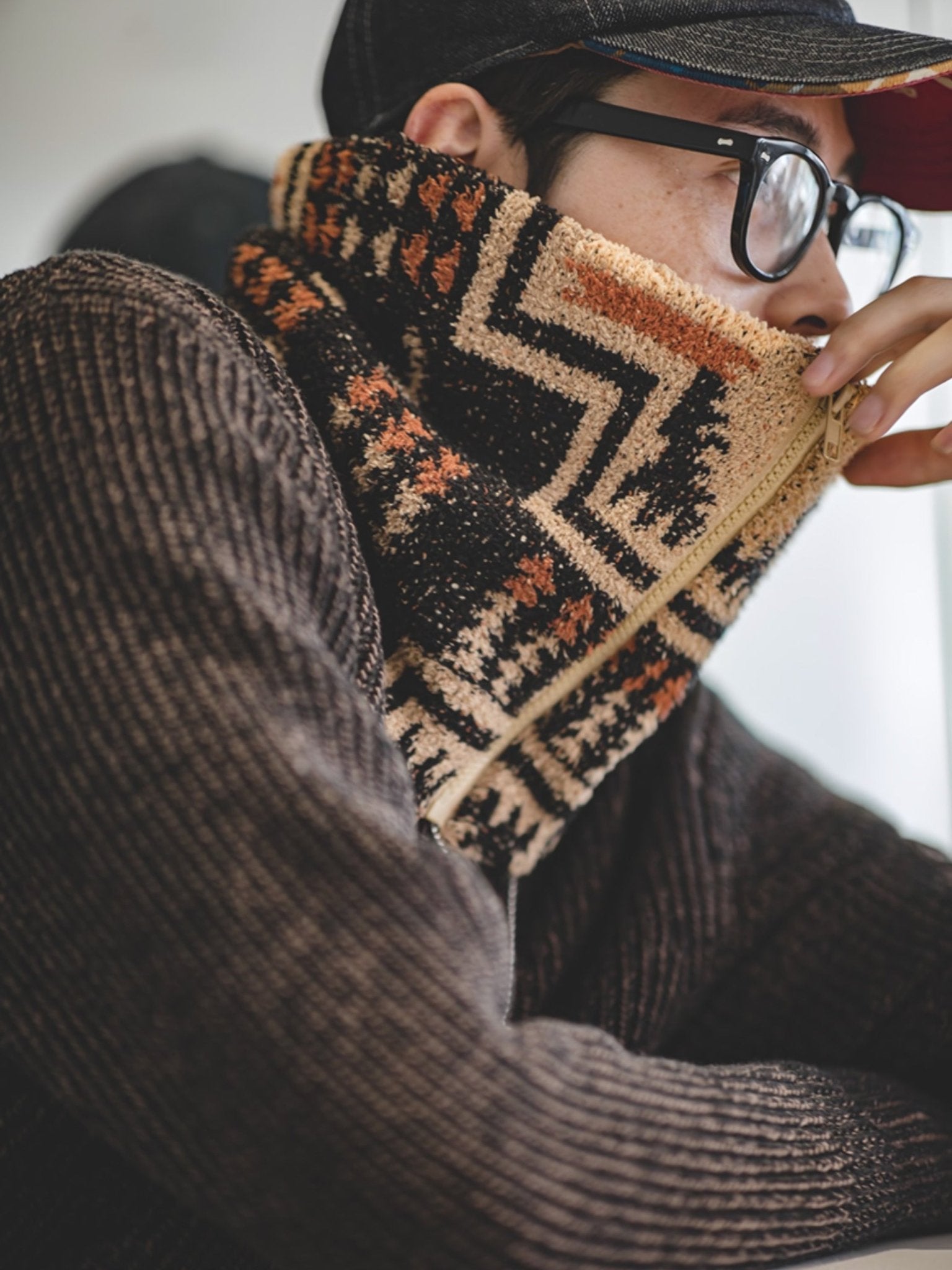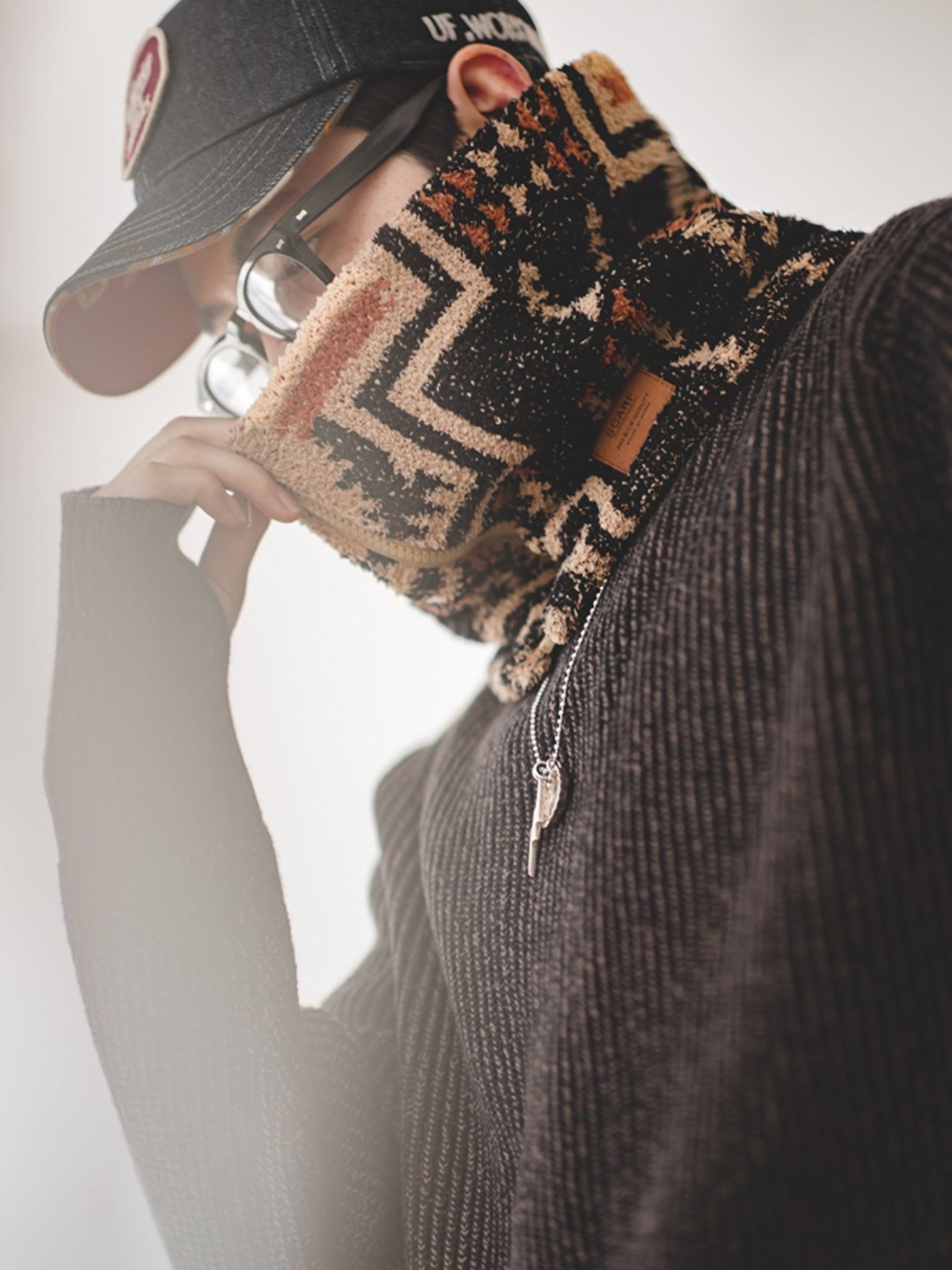 このアイテムは2つの異なるデザインから選べるのが魅力です。「ナバホ柄」はネイティブアメリカンの伝統的なモチーフを取り入れたデザインで、美しいテキスチャーと星座をイメージした星々が施されています。首元をしっかり包み込む大きなサイズで、冬の寒さから保護します。ジップタイプのデザインは着脱が簡単で、暖かみと存在感があります。