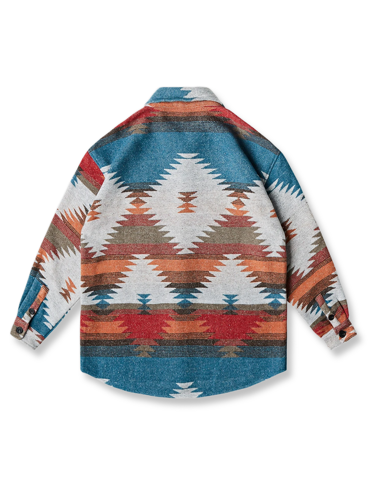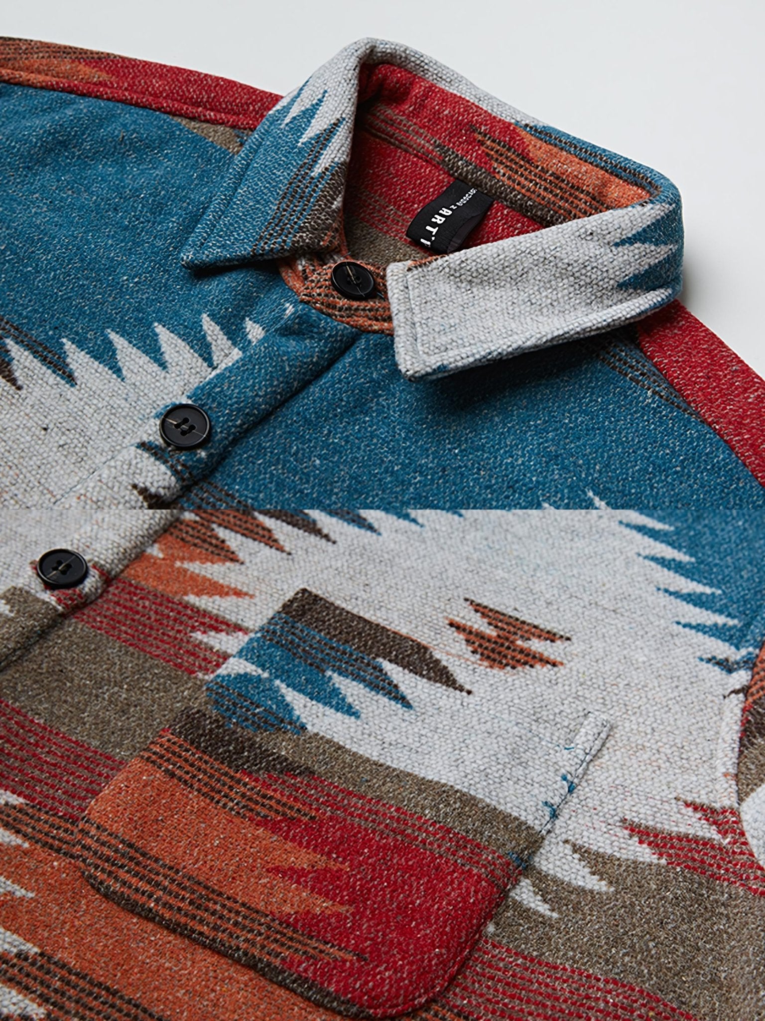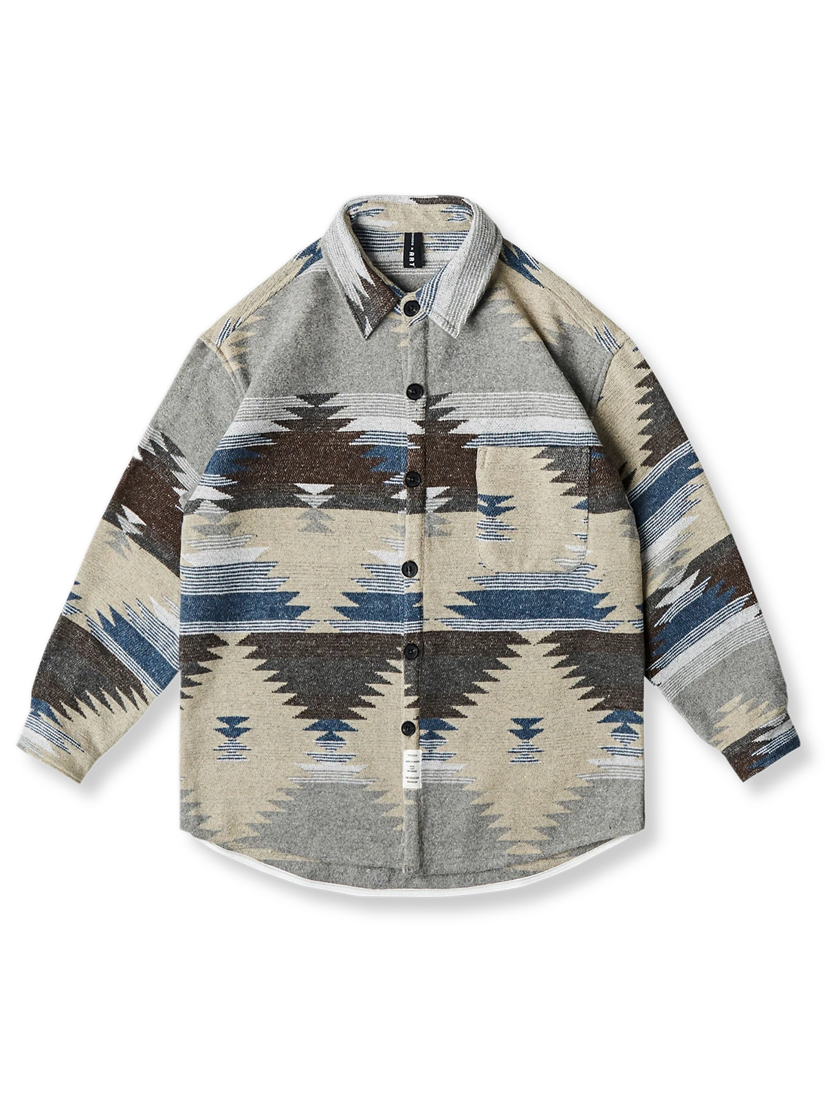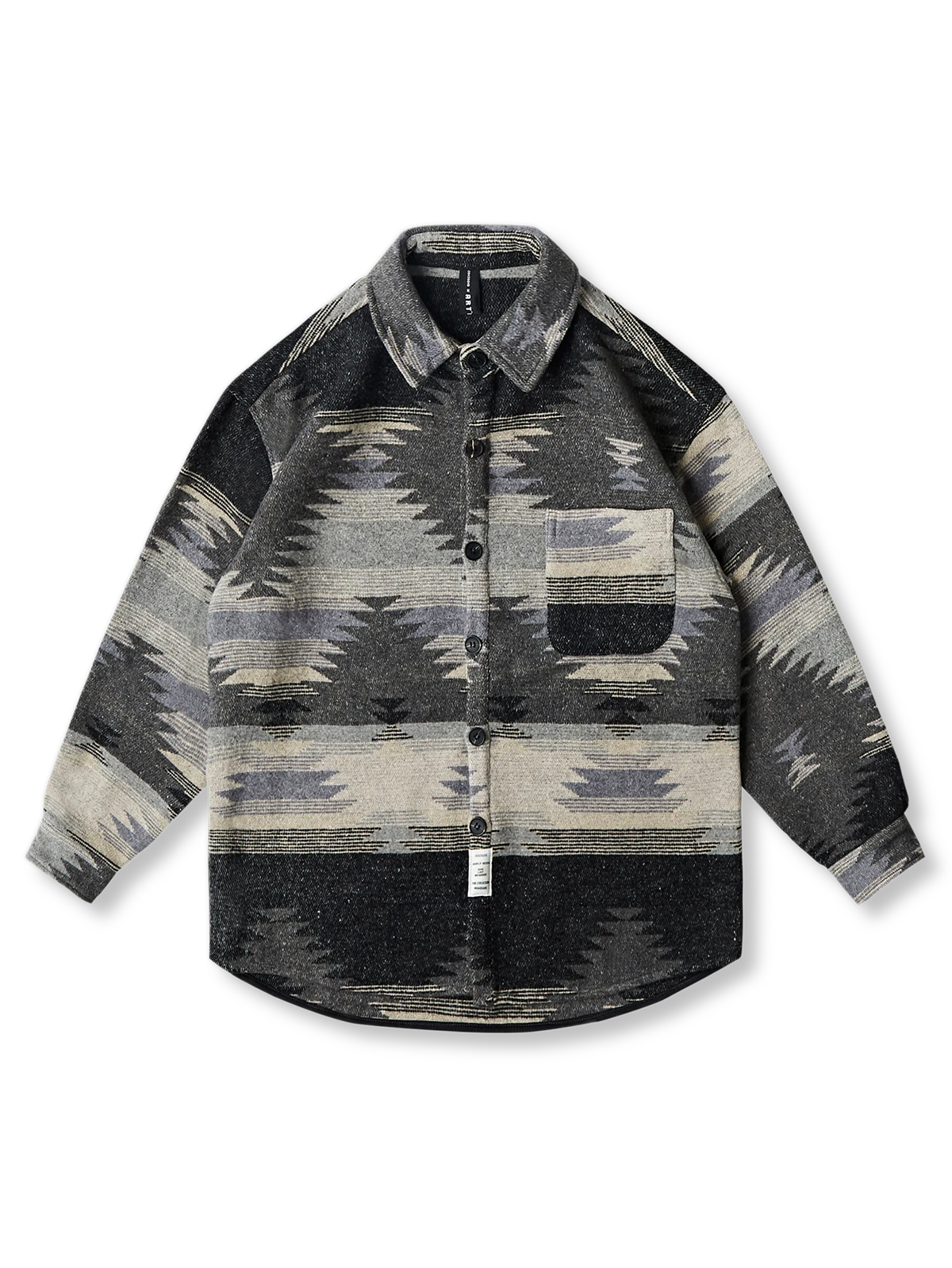 このシャツは、アメリカ南西部の先住民族であるナバホ族の伝統的な織り柄を特徴としています。裏表を反転させたような凹凸感が際立つエスニック柄が、アイテムの魅力です。胸には1つのポケットが配置されており、独特なデザインを引き立てています。