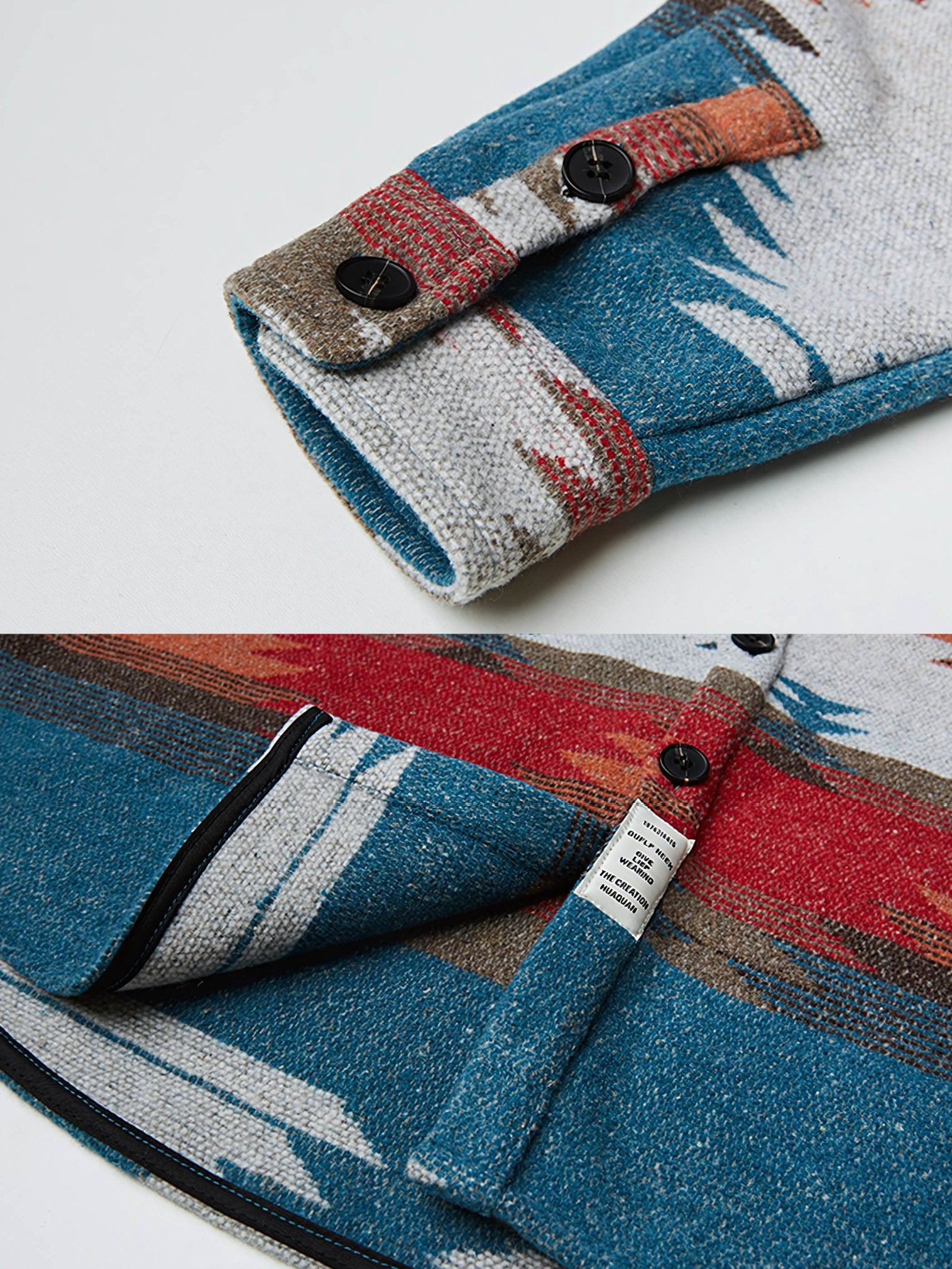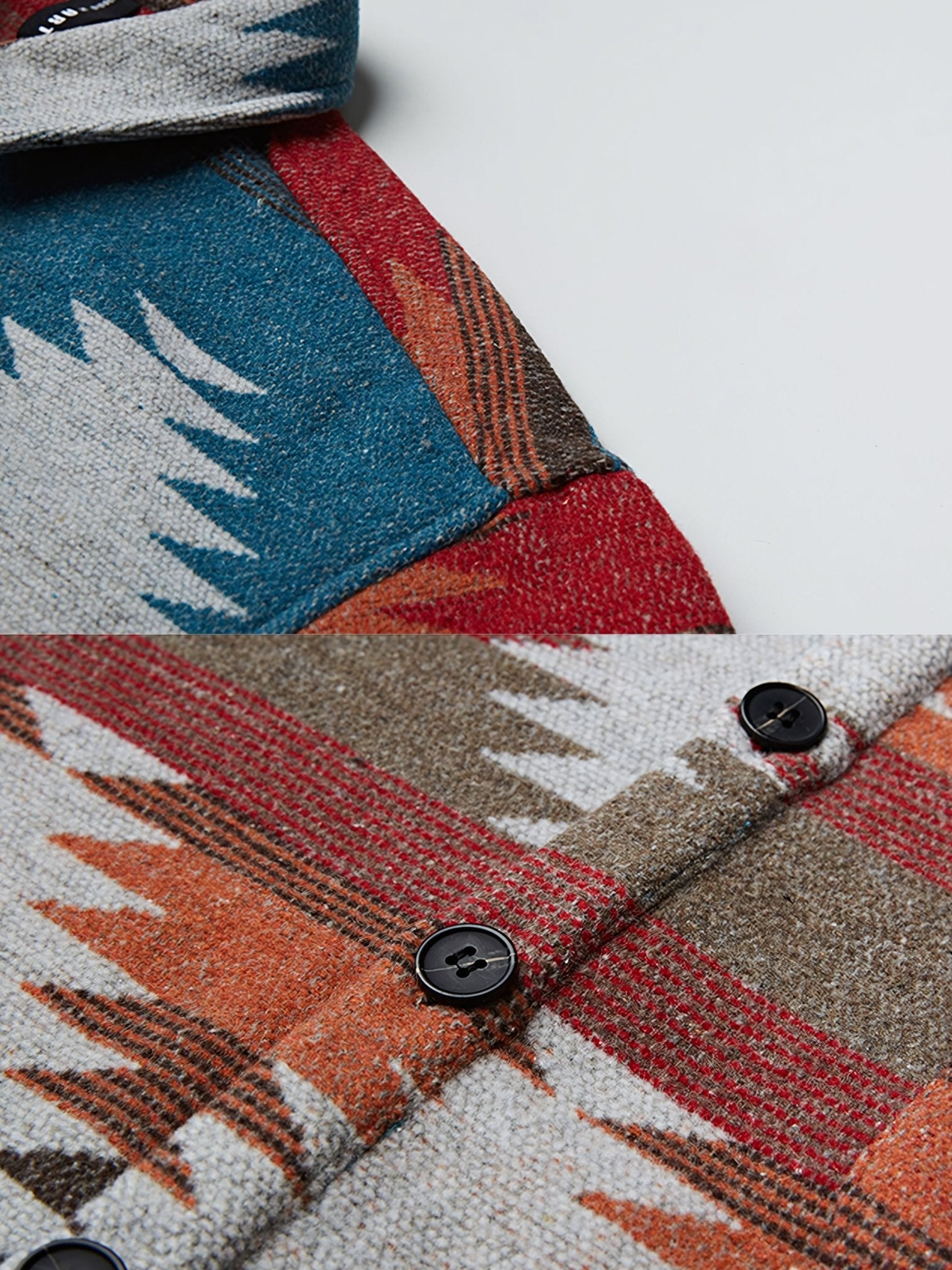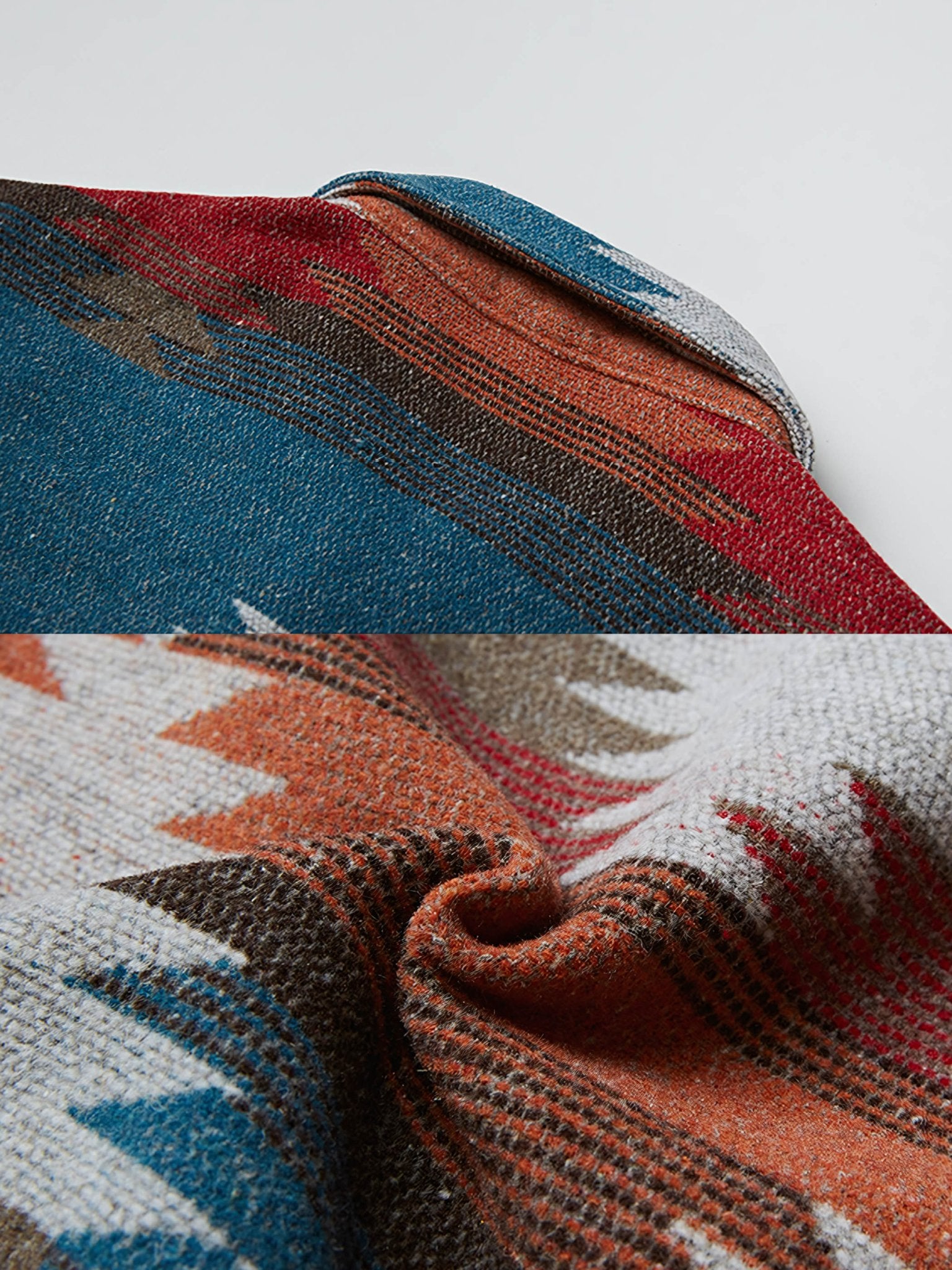 アイテムはナバホ族の伝統的な織り柄を再現するために、高品質のポリエステルとウールの組み合わせ素材が使用されています。これにより、暖かさと軽さ、丈夫さが同居した独特の素材が生み出され、洗練されたエスニックスタイルを提供します。