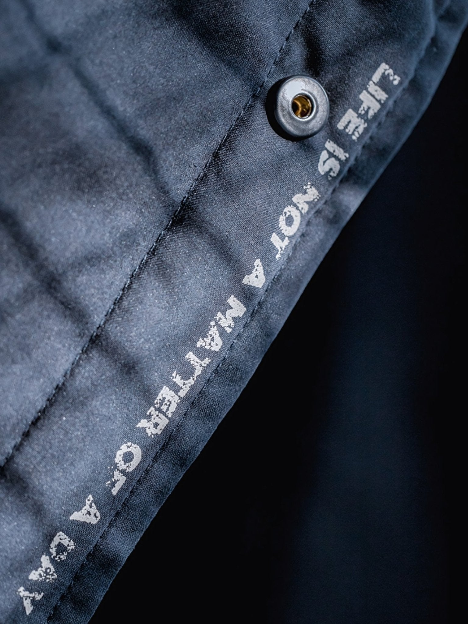 正面のファスナーと袖口にはカスタムボタンが使用され、片手で簡単に着脱できます。ファスナーの下には、裏地に "LIFE IS NOT A MATTER OF A DAY" と書かれたスチールプレートの印刷があり、このダウンジャケットに独特のデザインを加えています。