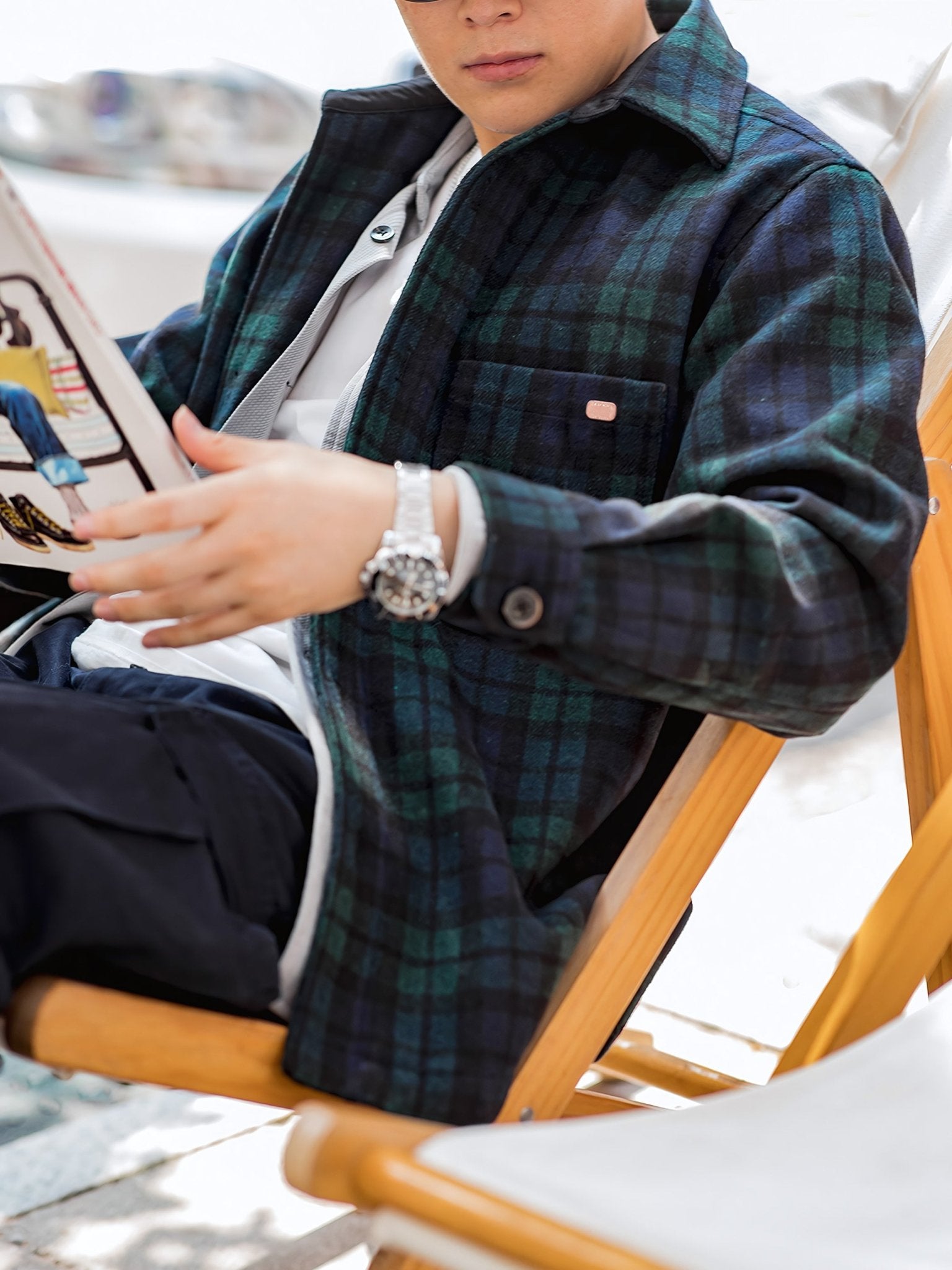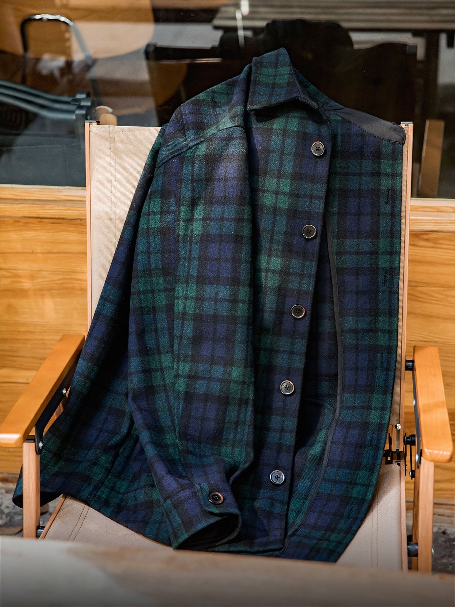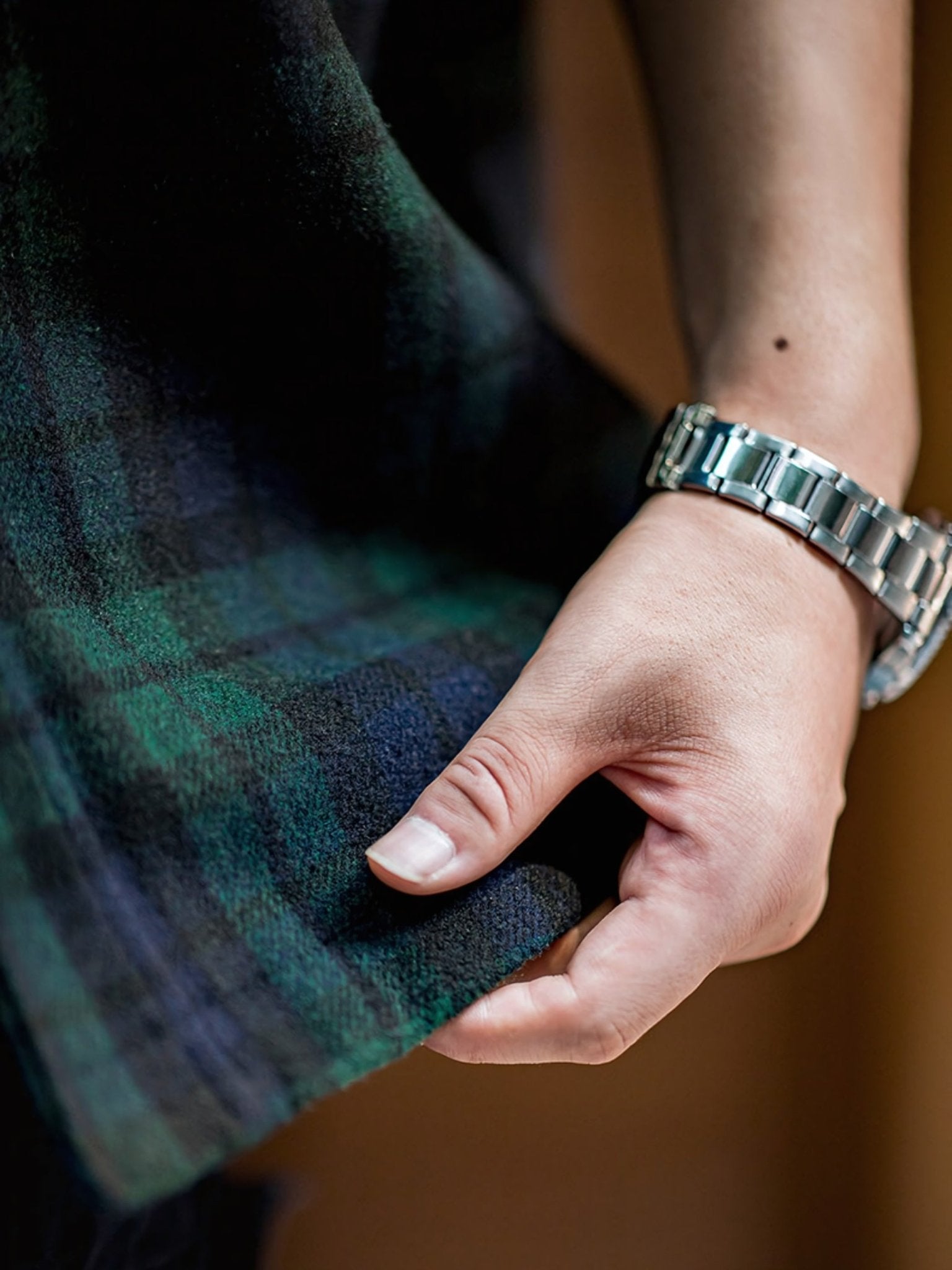 このアイテムは、青地に緑と黒の格子模様で統一された、全体的に暗めの配色を持っています。シンプルでありながら、洗練された印象を与えるデザインです。裾は緩やかな曲線を描いたカーブヘム仕様で、タックインでもアウトでも違和感なく着用できます。