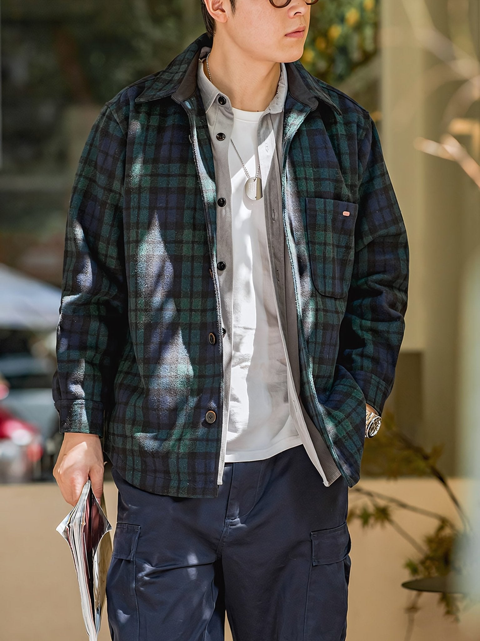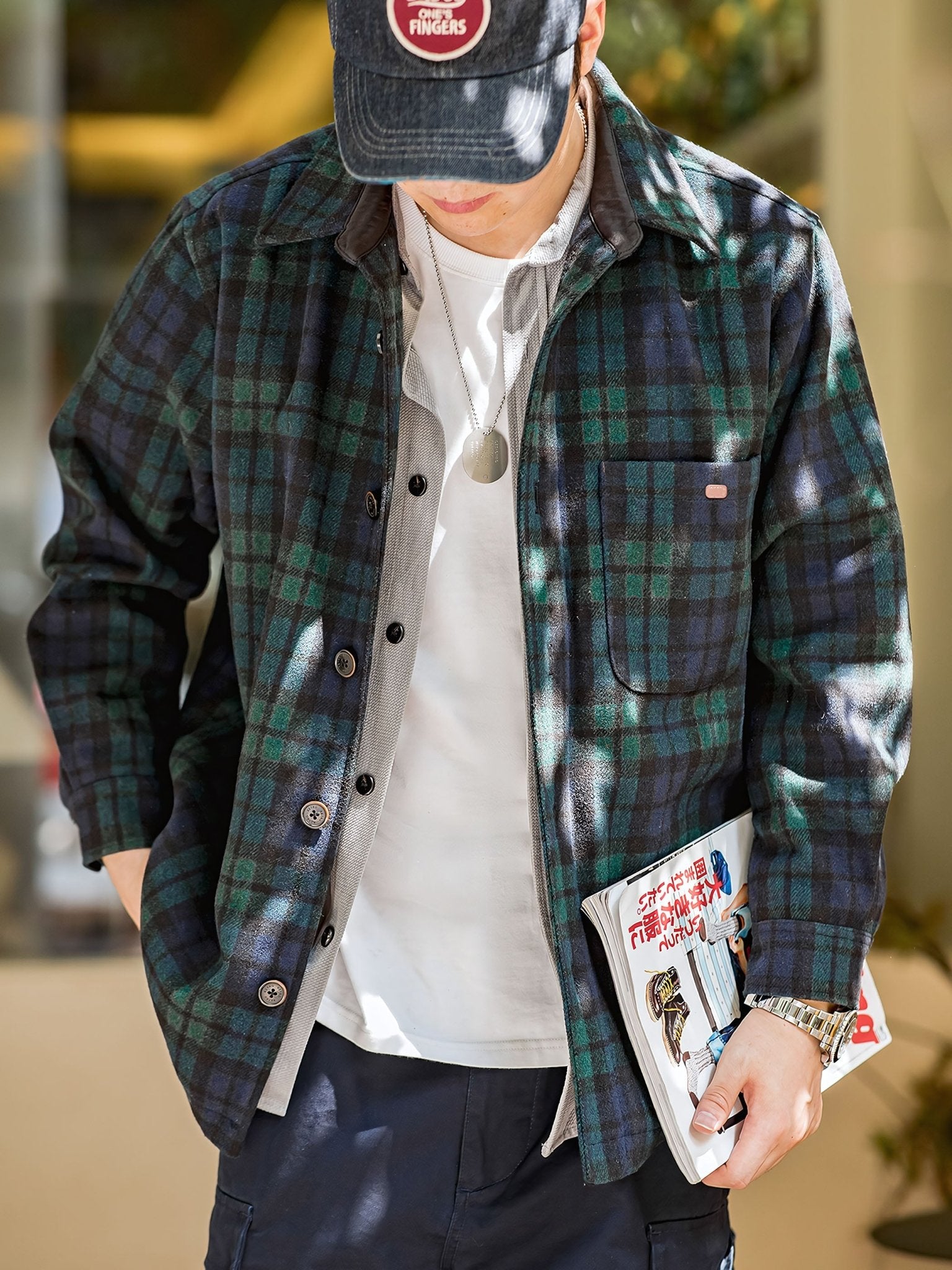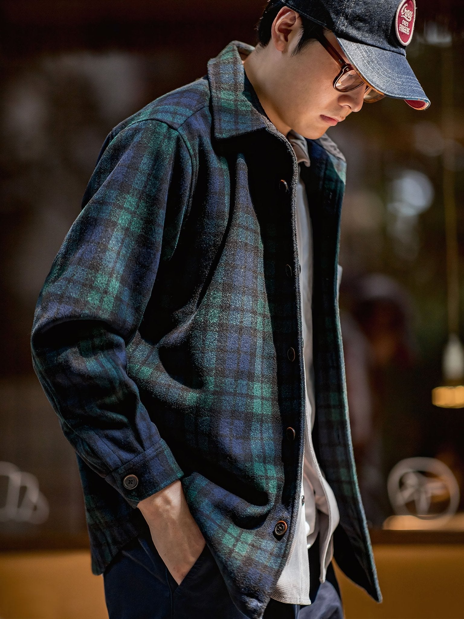 このアイテムは、青地に緑と黒の格子模様で統一された、全体的に暗めの配色を持っています。シンプルでありながら、洗練された印象を与えるデザインです。裾は緩やかな曲線を描いたカーブヘム仕様で、タックインでもアウトでも違和感なく着用できます。