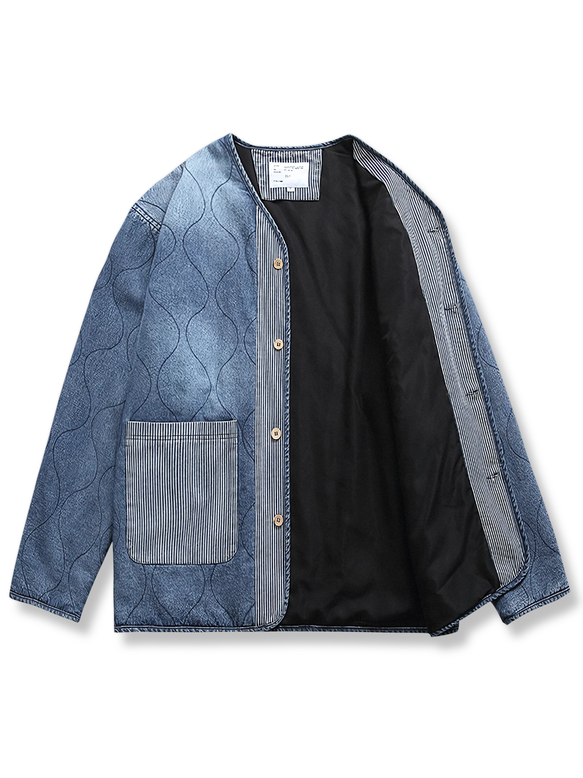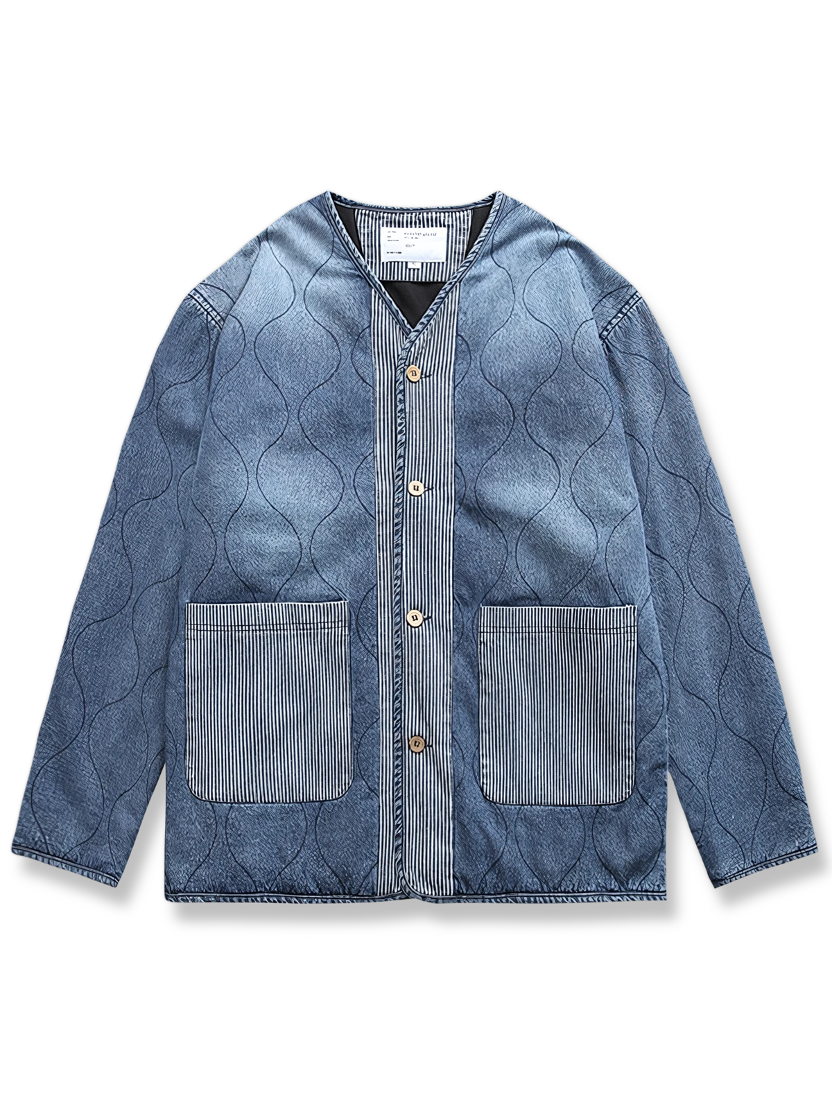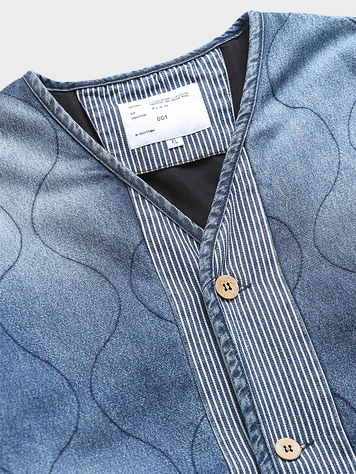 このデニムジャケットは、ひょうたんのキルティング技術と自然なグラデーションの色落ちデザインを組み合わせており、伝統的な手法と現代ファッションの融合を示しています。キルティングは伝統工芸から派生し、色落ちグラデーションは現代の自然な美学を表現しています。