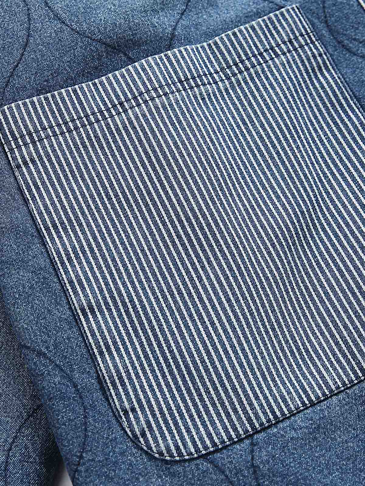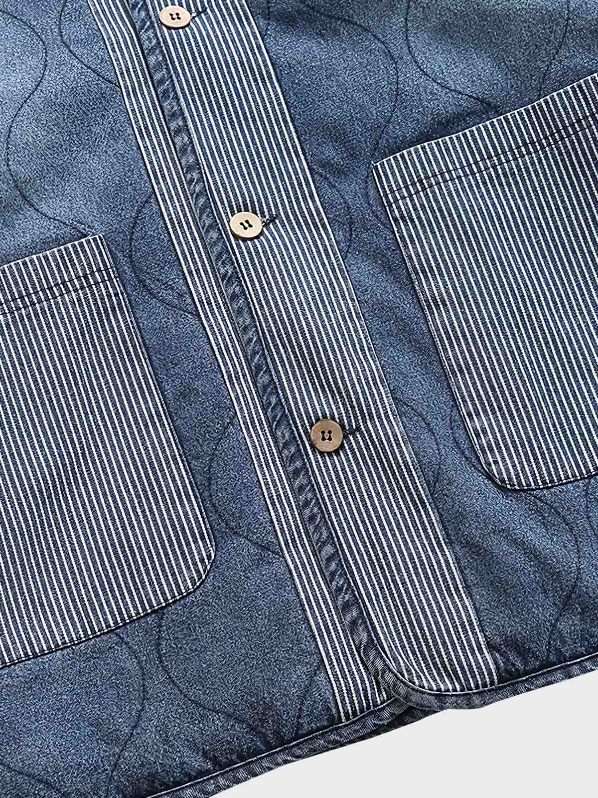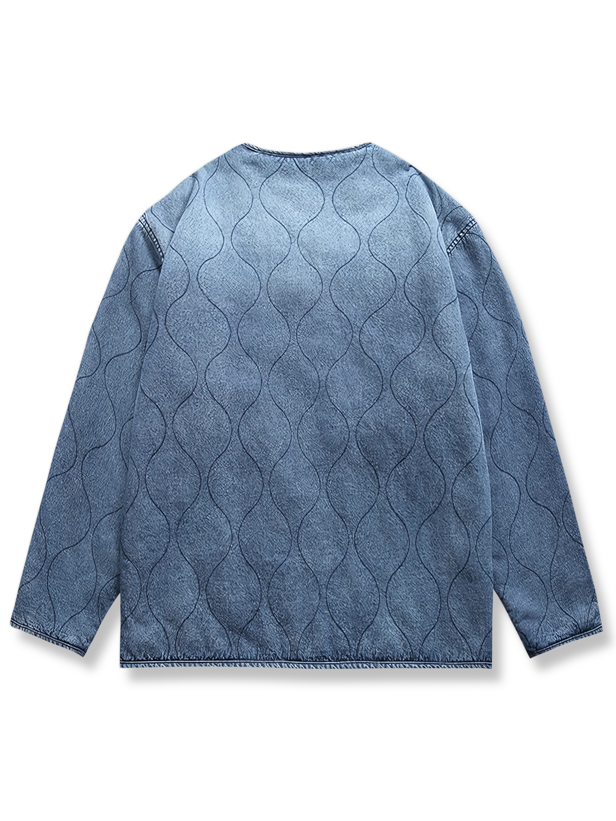 このデニムジャケットは、ひょうたんのキルティング技術と自然なグラデーションの色落ちデザインを組み合わせており、伝統的な手法と現代ファッションの融合を示しています。キルティングは伝統工芸から派生し、色落ちグラデーションは現代の自然な美学を表現しています。