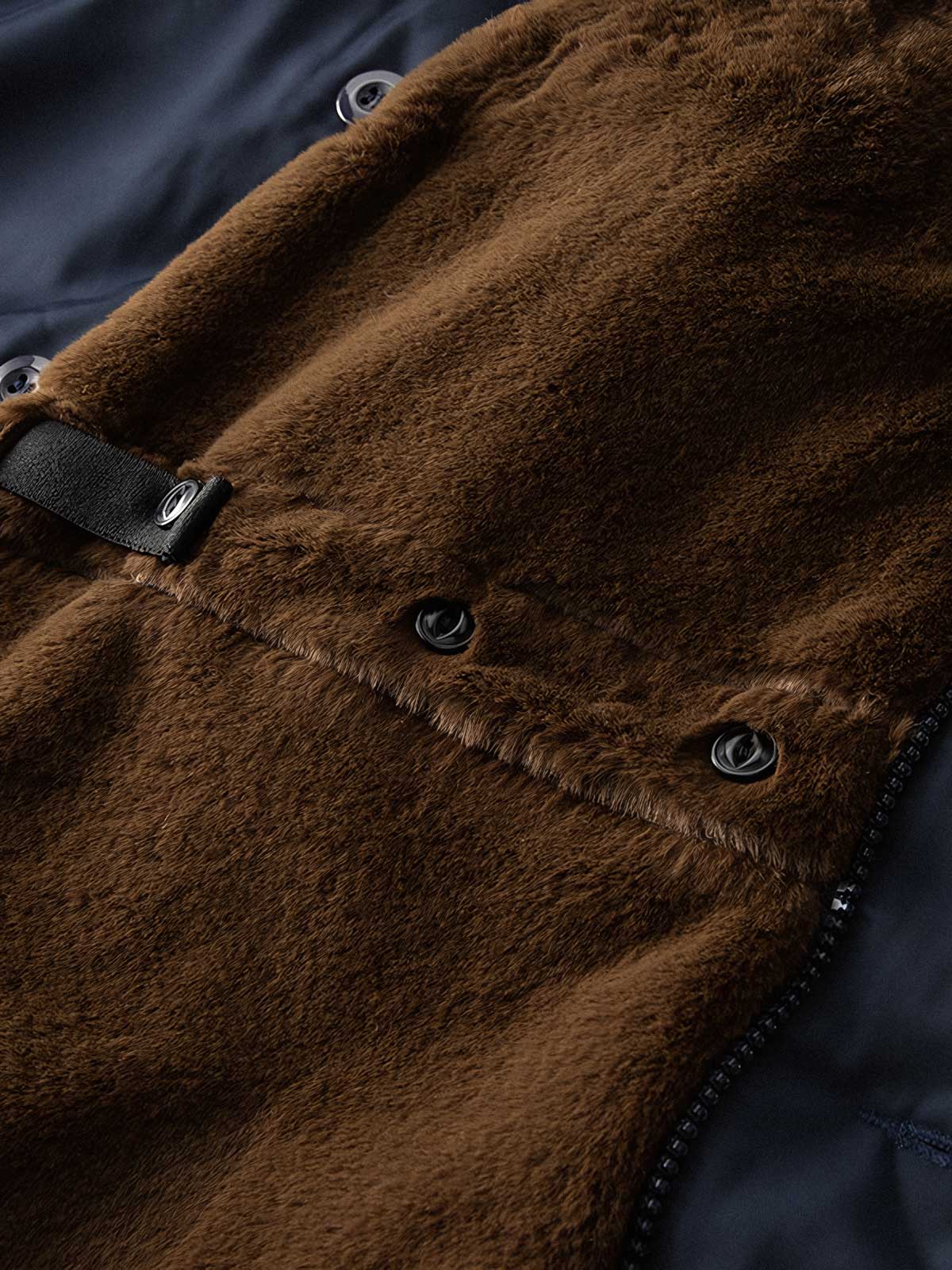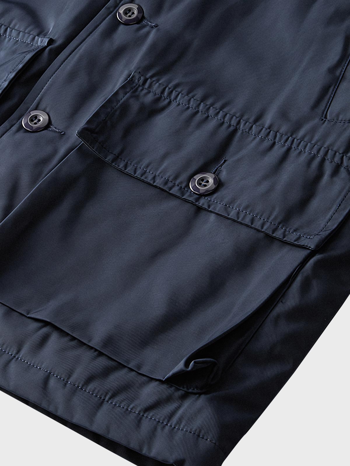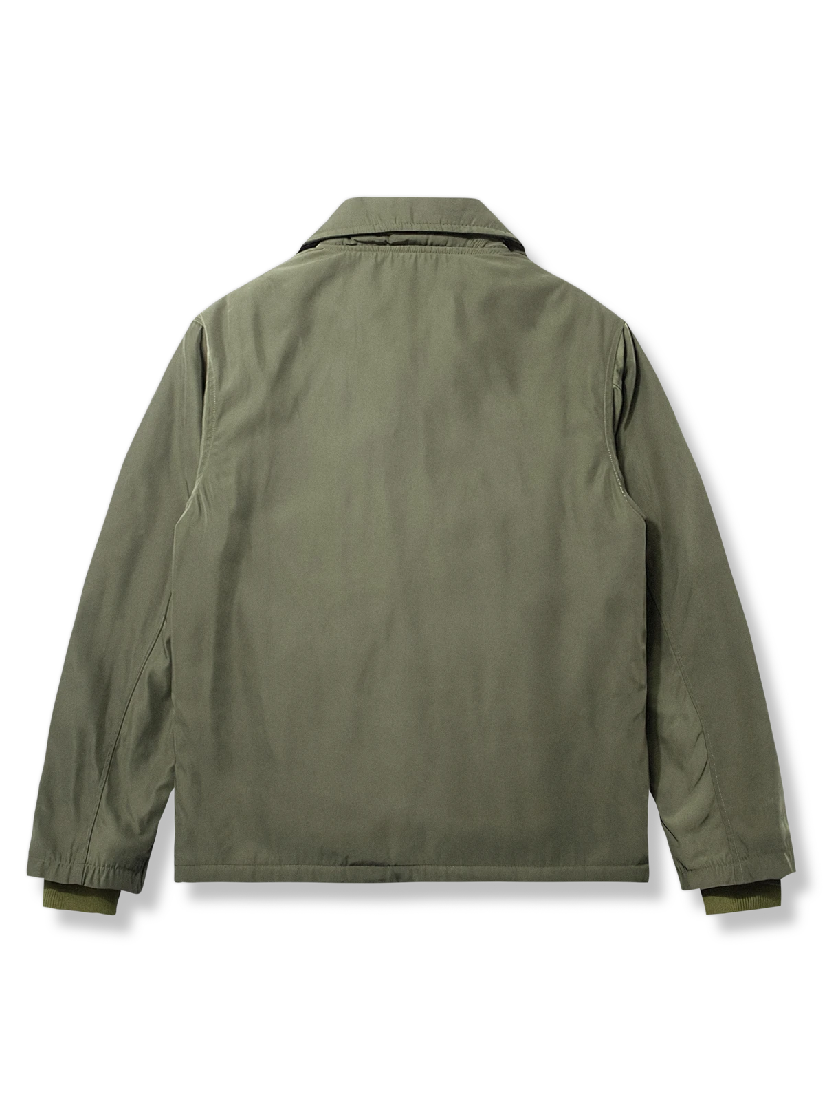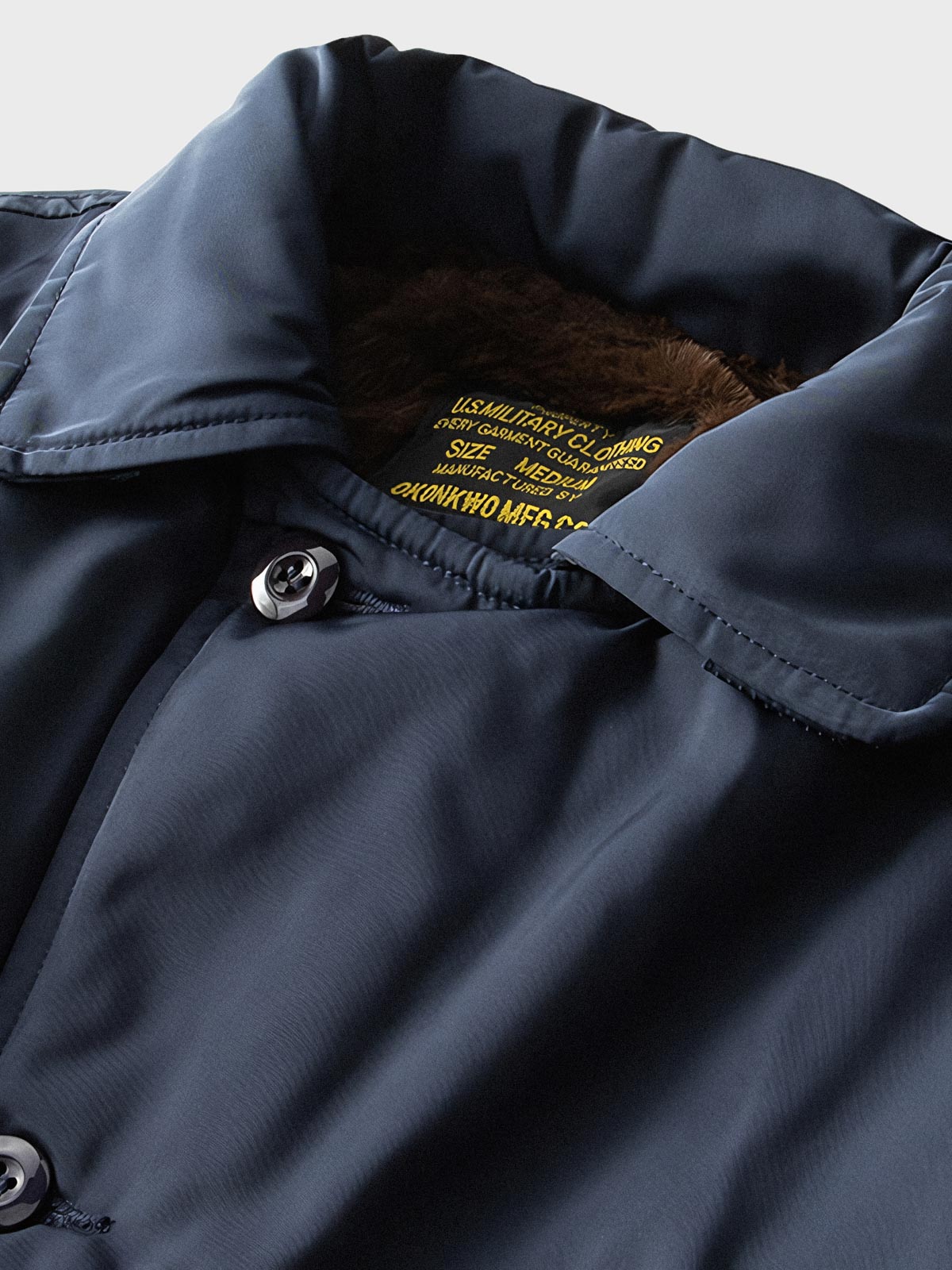 耐久性のあるポリエステルとウール素材を使用し、厳しい気候にも耐える作りです。実用的なフロントポケットとボタンのデザインは、ミリタリー感を強調しています。