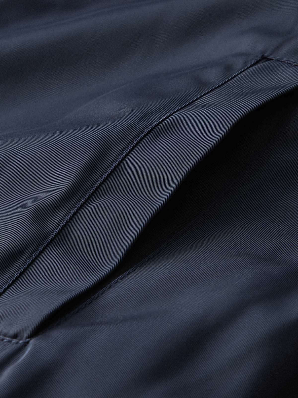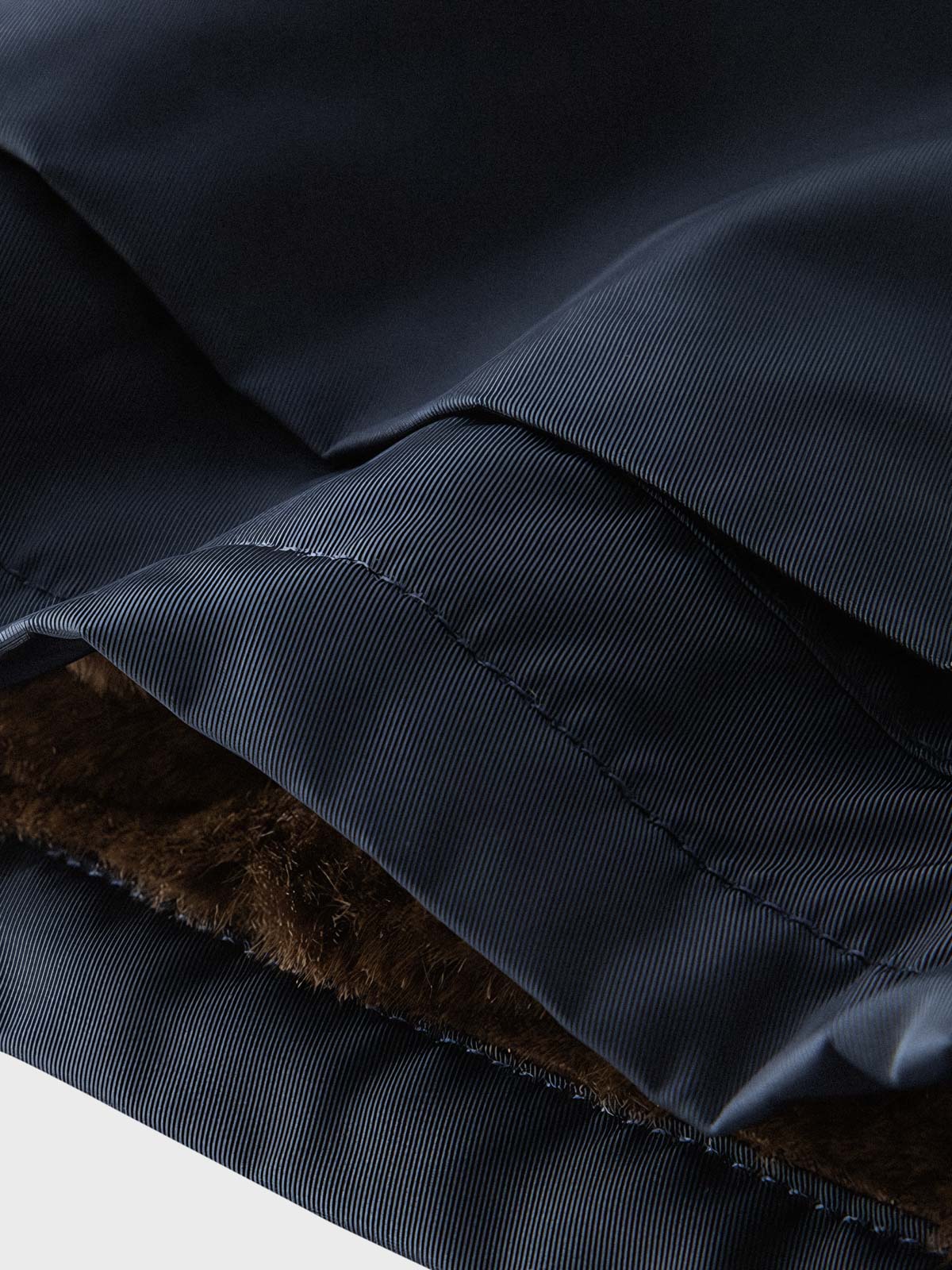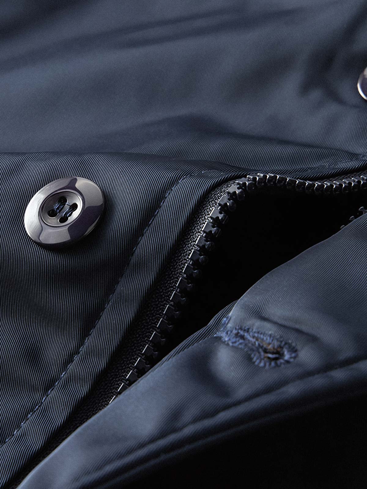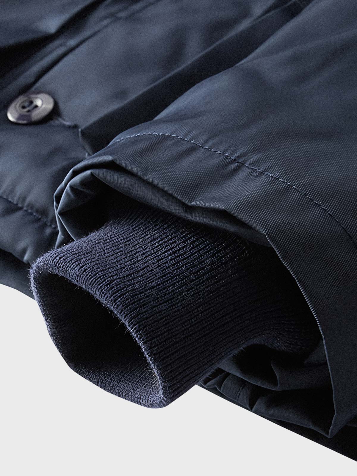 耐久性のあるポリエステルとウール素材を使用し、厳しい気候にも耐える作りです。実用的なフロントポケットとボタンのデザインは、ミリタリー感を強調しています。