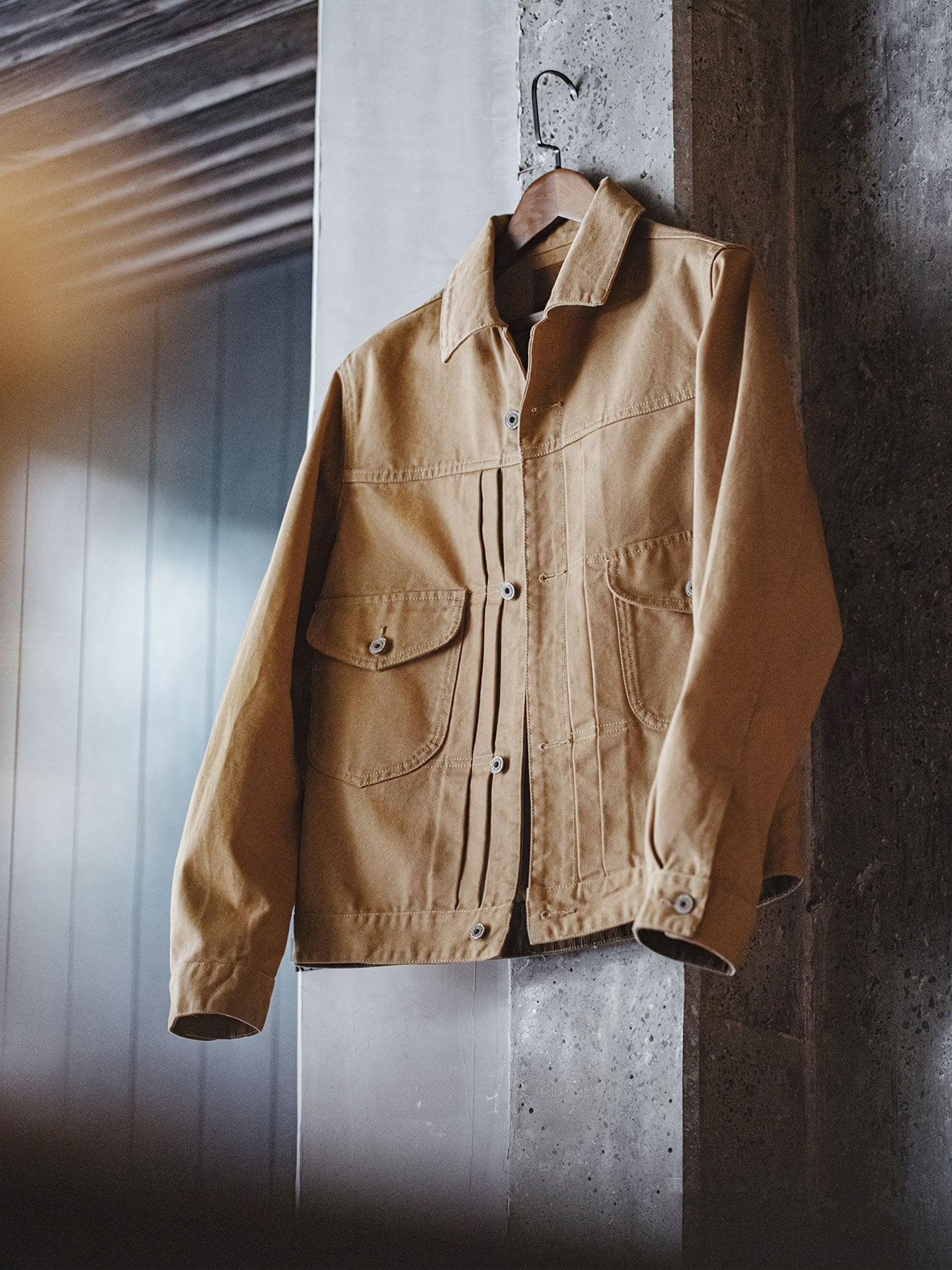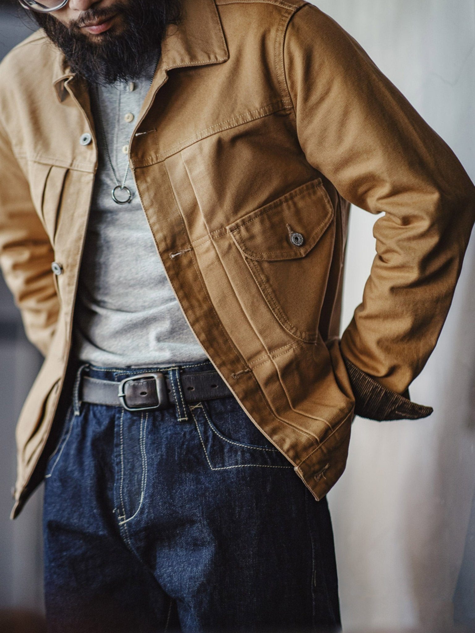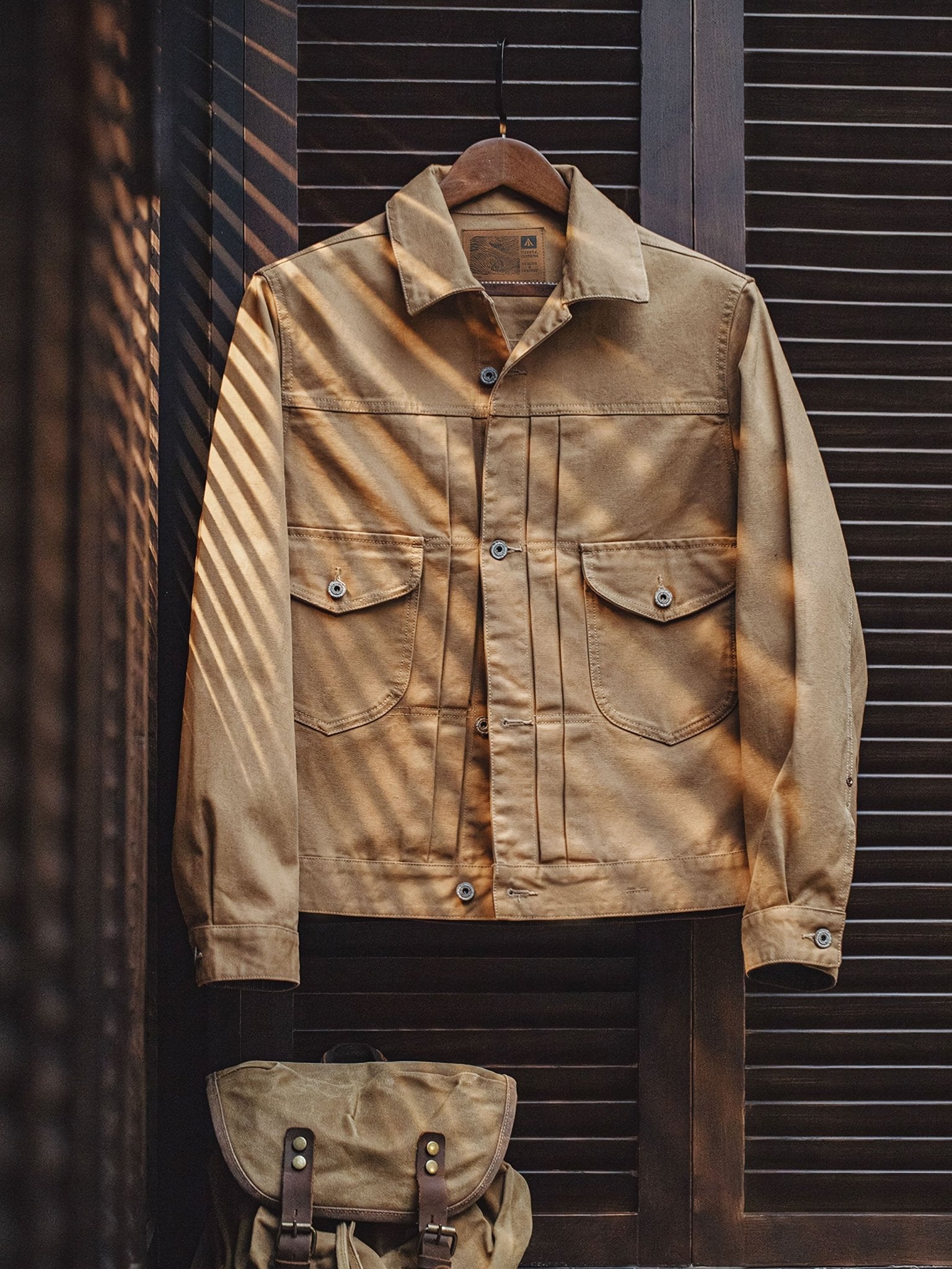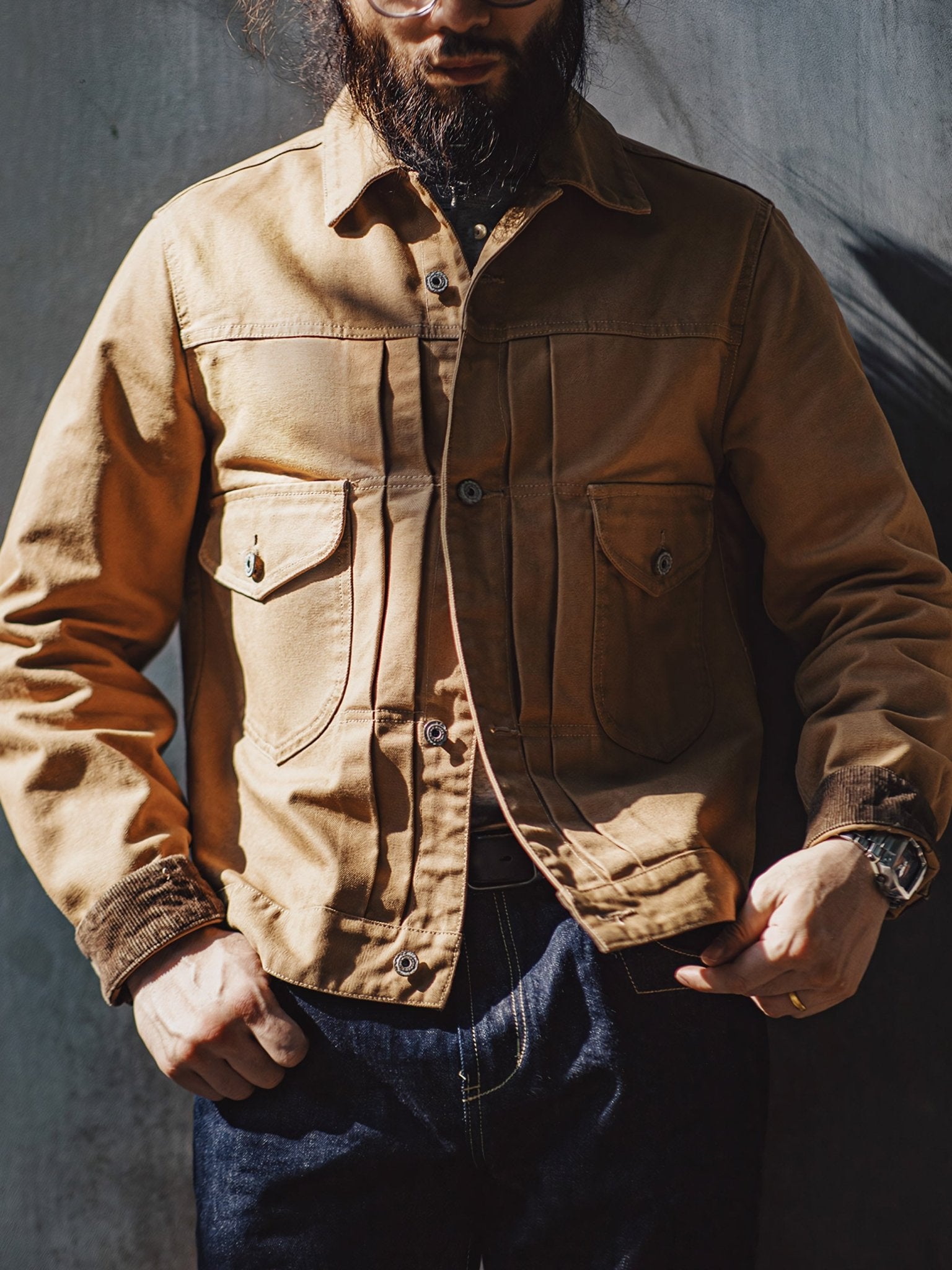 特徴的なダブルチェストポケット、立体的なプリーツ、そして後ろのアコーディオンプリーツがデザインされ、肩の動きがしやすくなっています。パリのボタンでクラシックなコントラストステッチが施され、シャープでスッキリとした襟のデザインも特徴的です。