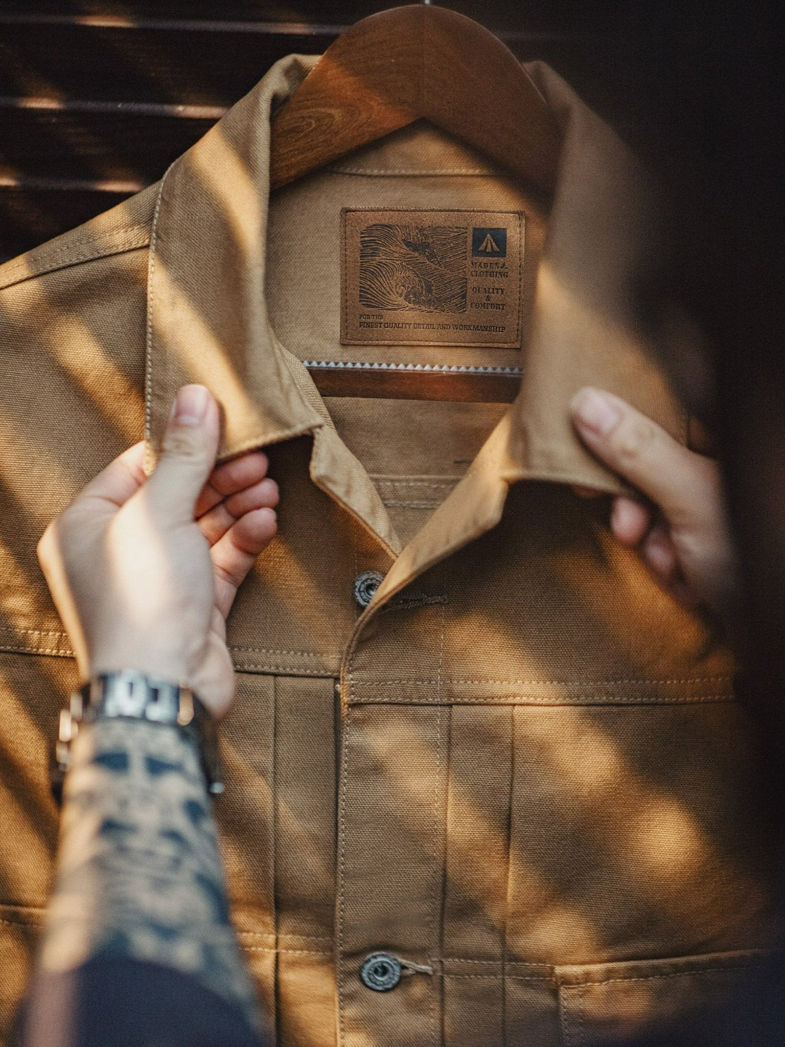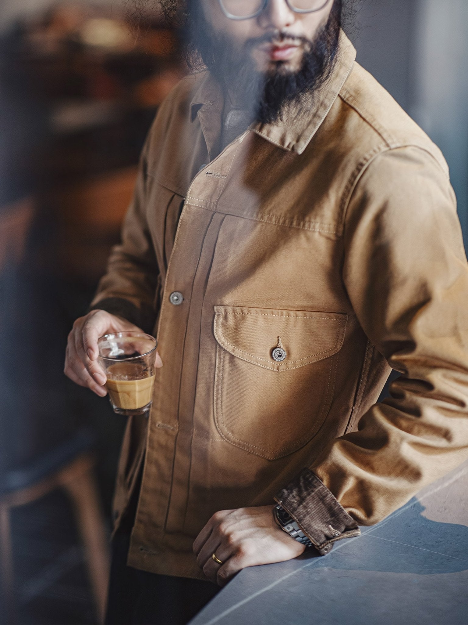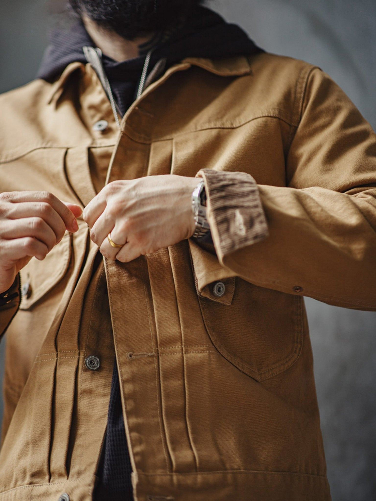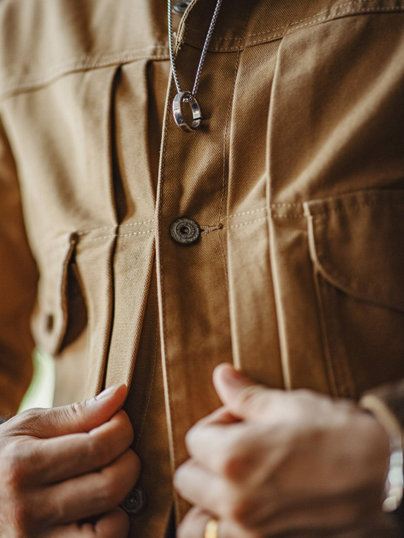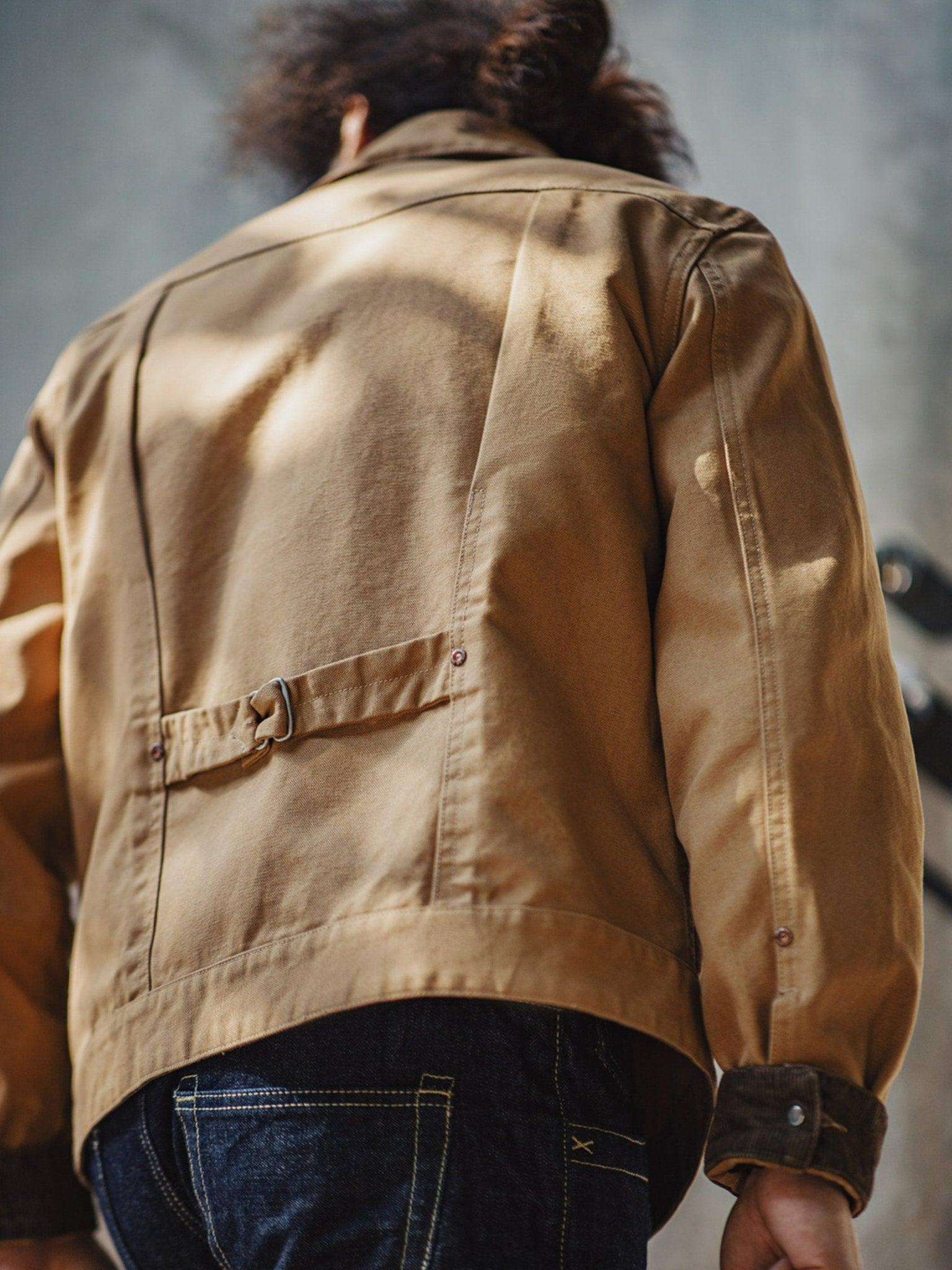 特徴的なダブルチェストポケット、立体的なプリーツ、そして後ろのアコーディオンプリーツがデザインされ、肩の動きがしやすくなっています。パリのボタンでクラシックなコントラストステッチが施され、シャープでスッキリとした襟のデザインも特徴的です。