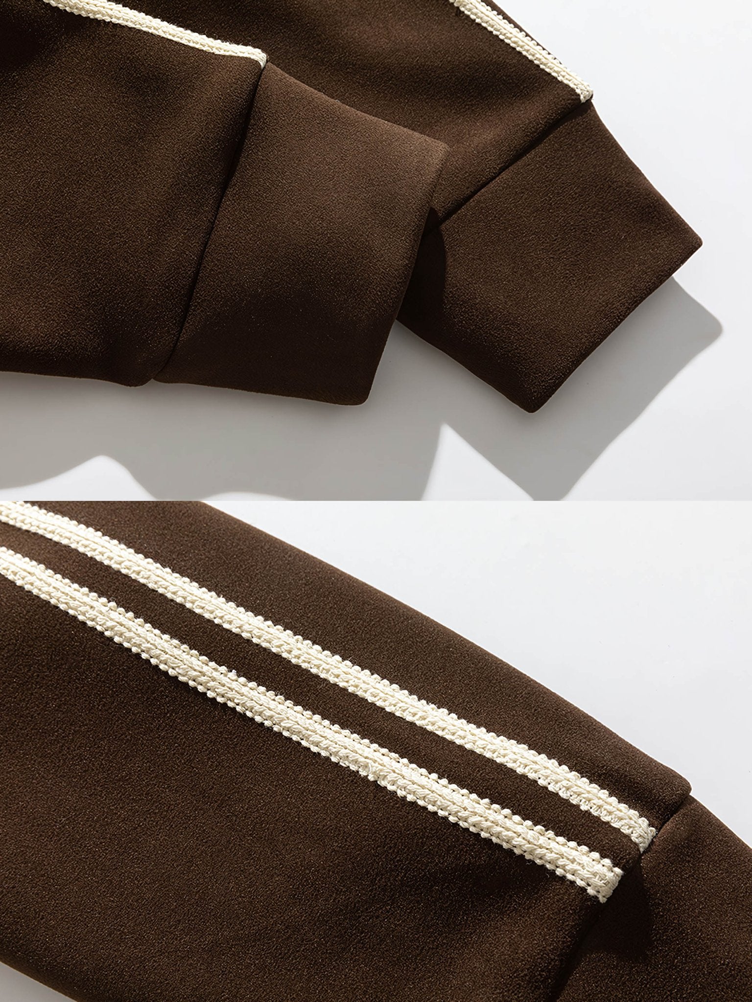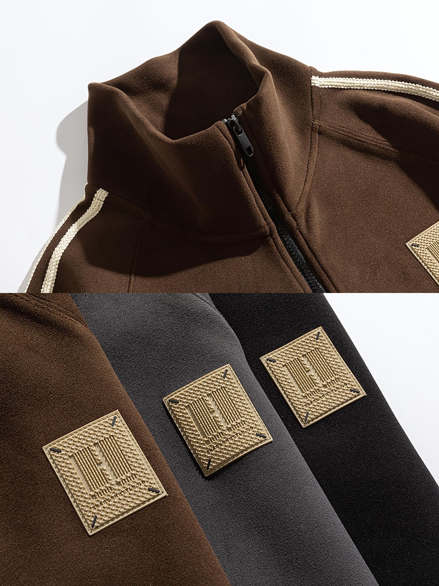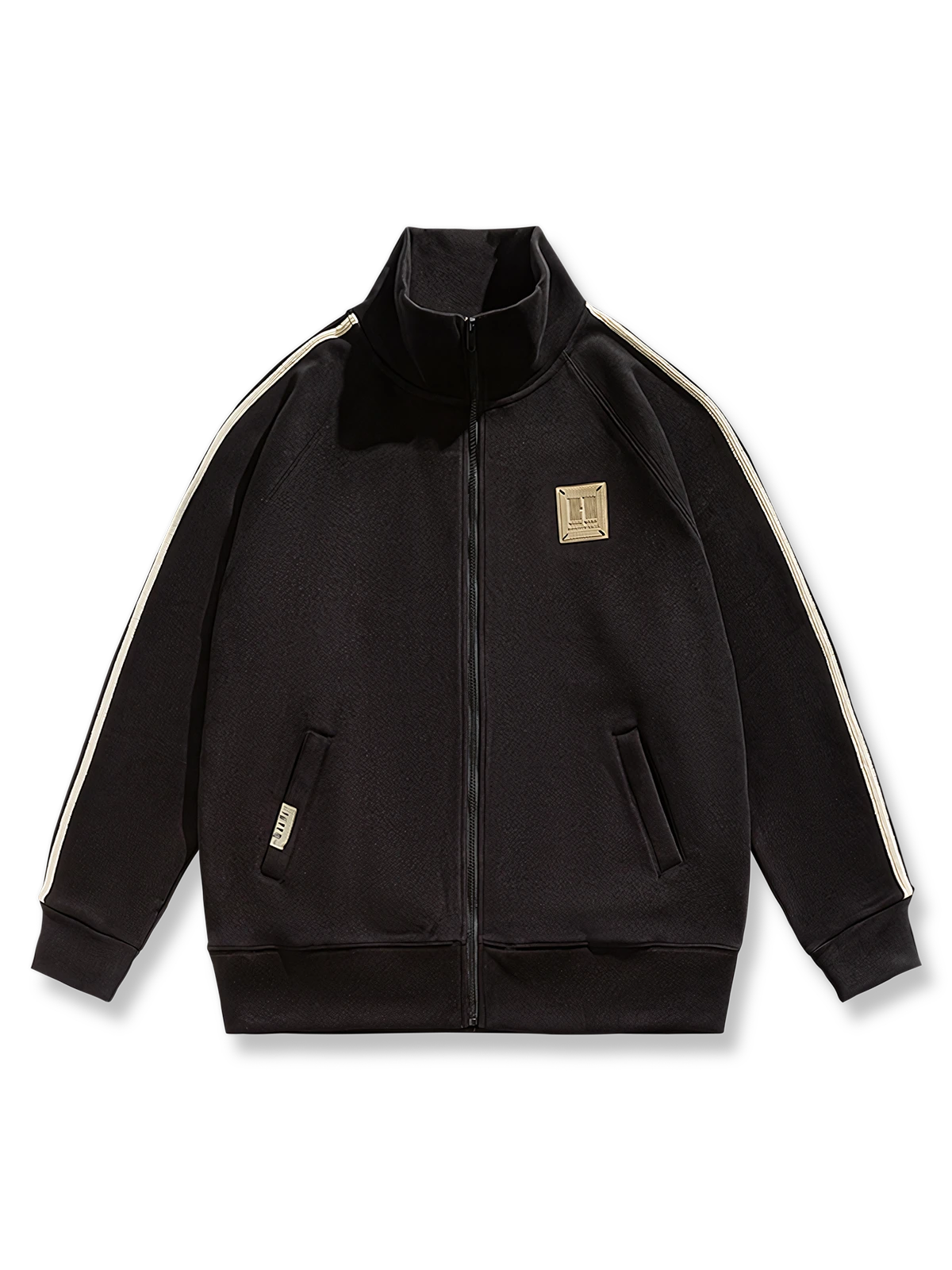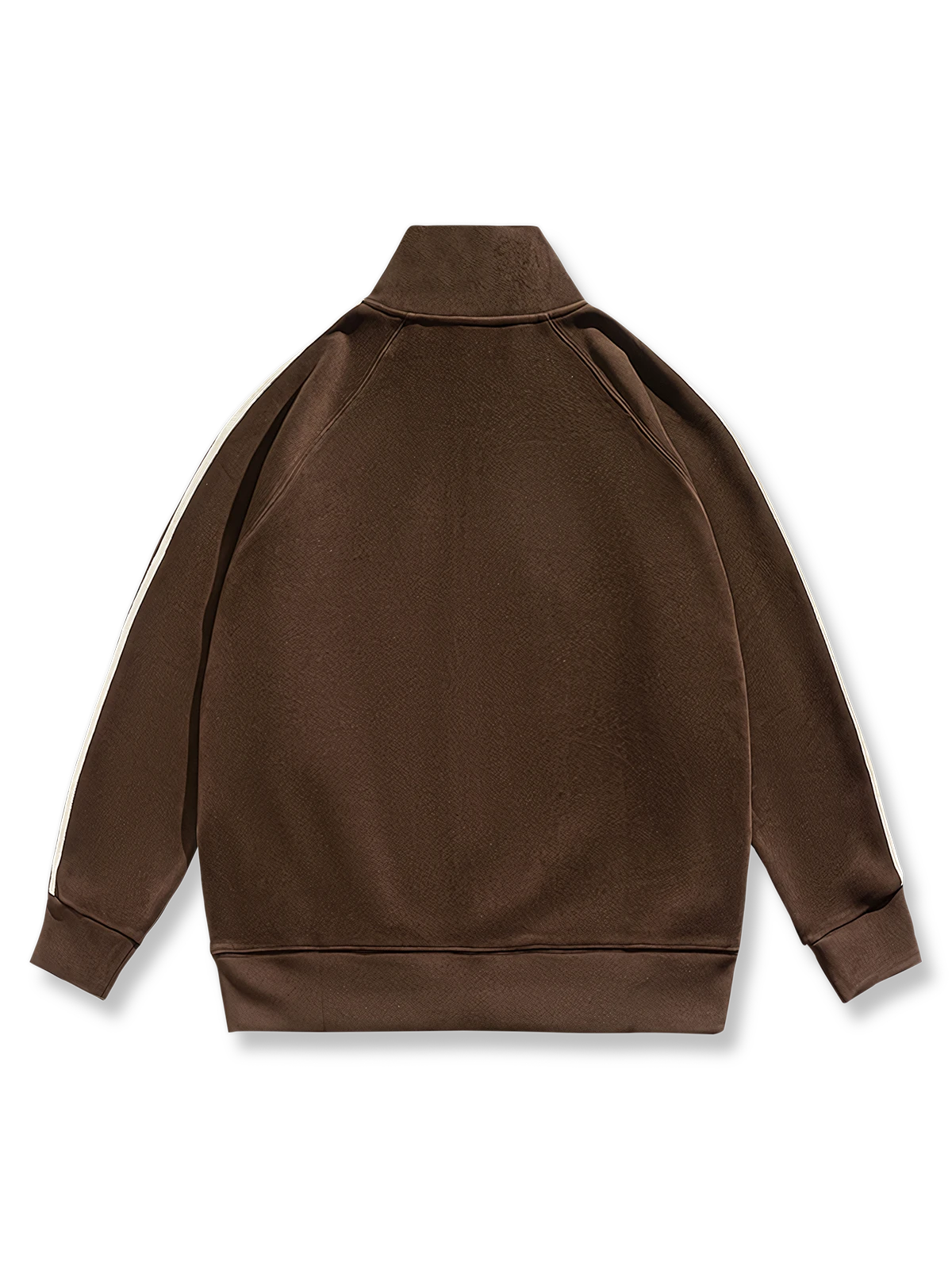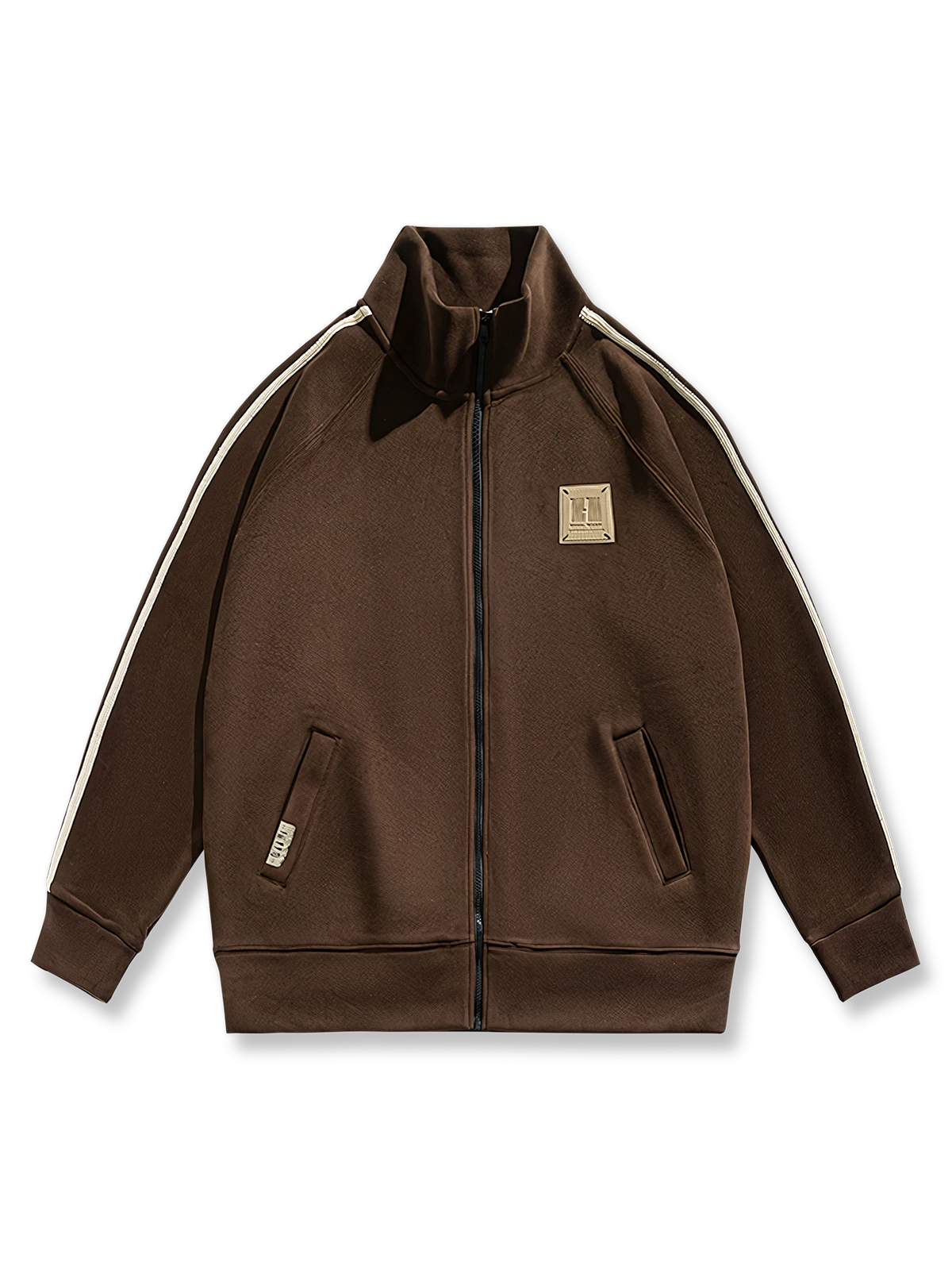 後ろから見たシルエットも有能でクールな印象を与えます。 袖のラインもスポーティーな印象を与えます。 前立てのファスナーを全開にするとスタンドカラーになり、レトロなラバーワッペンなどレトロなディテールが満載でカジュアルに着やすいデザインです。