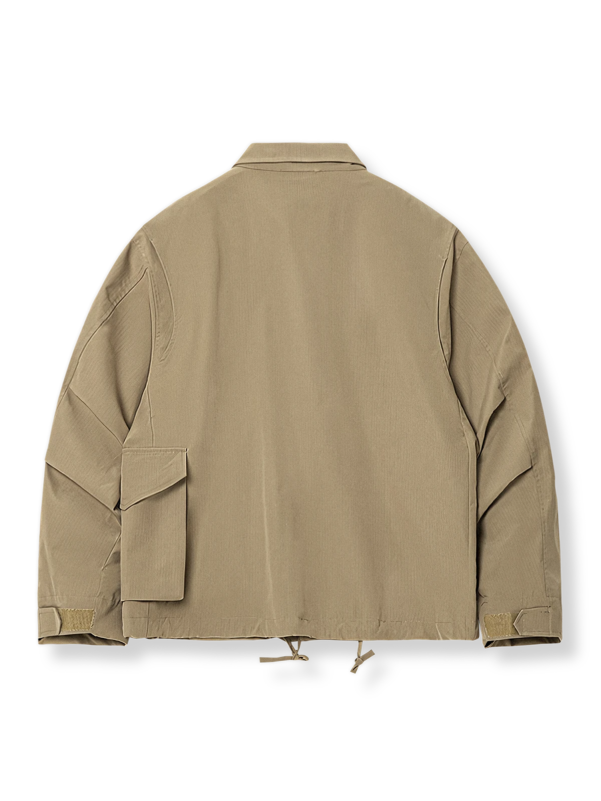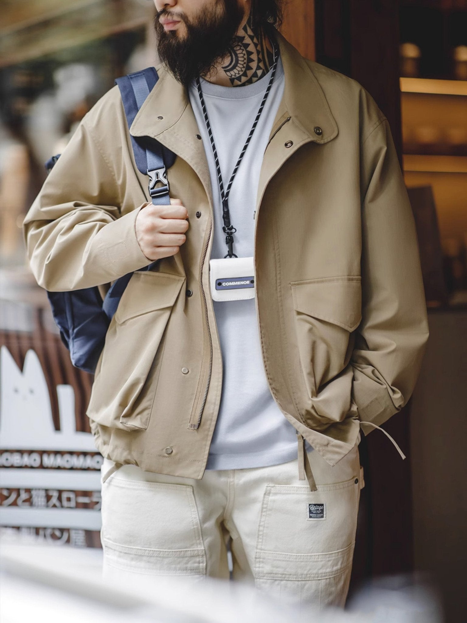 素材にはポリエステル100%を選び、カーキ色を基調としています。このジャケットはレトロな要素と実用性が巧みに融合され、独自のファッションスタイルを表現しています。