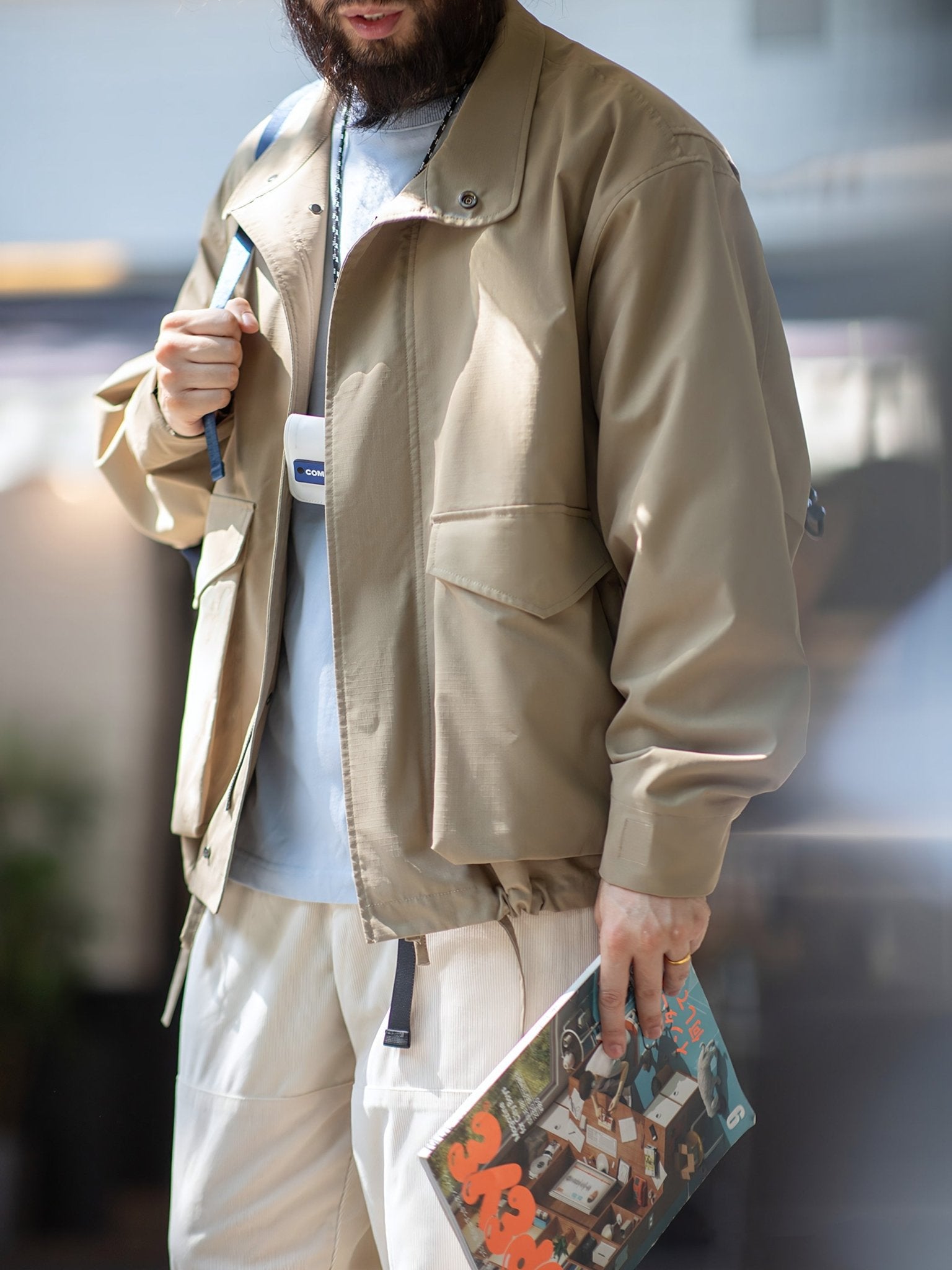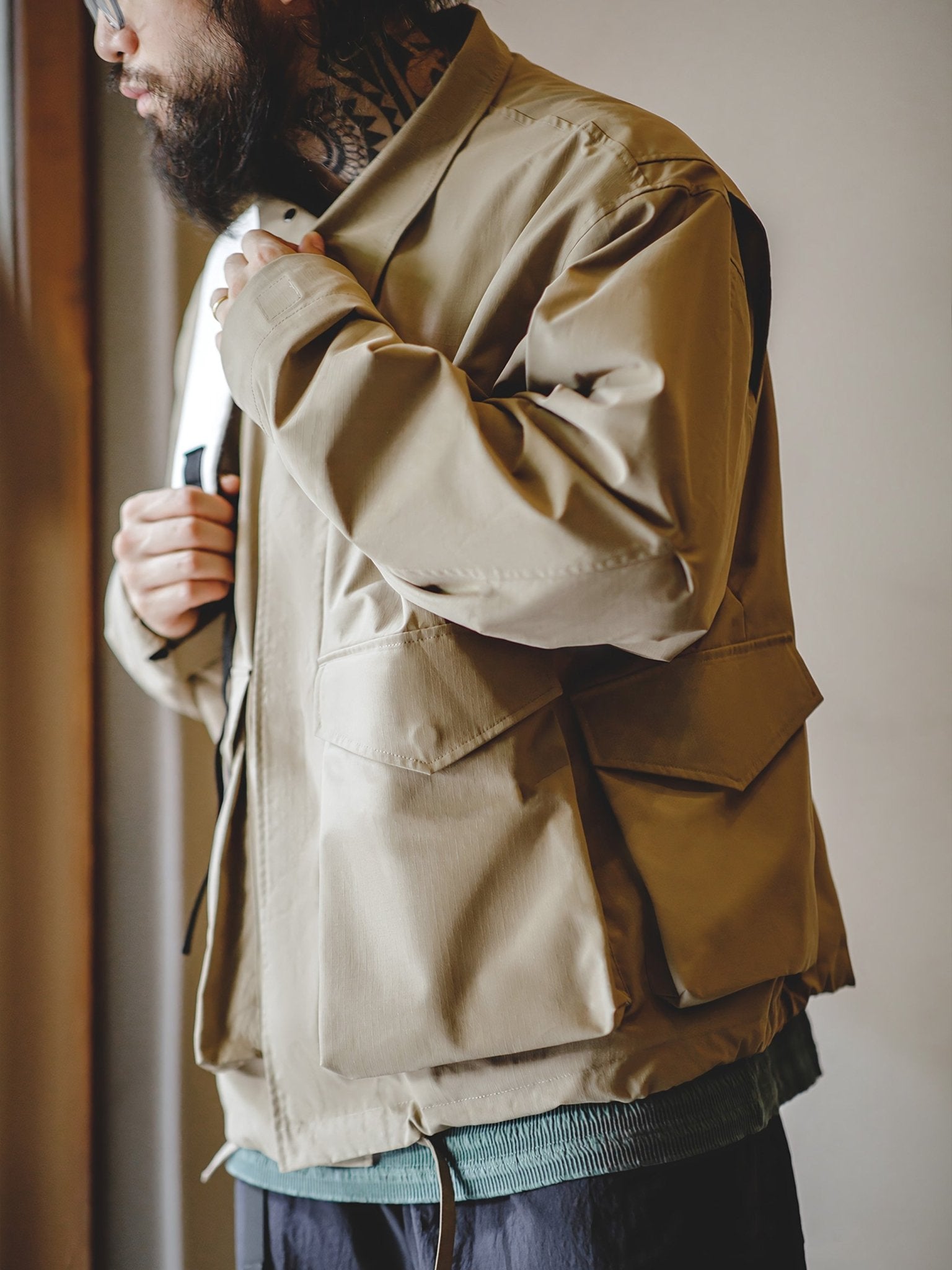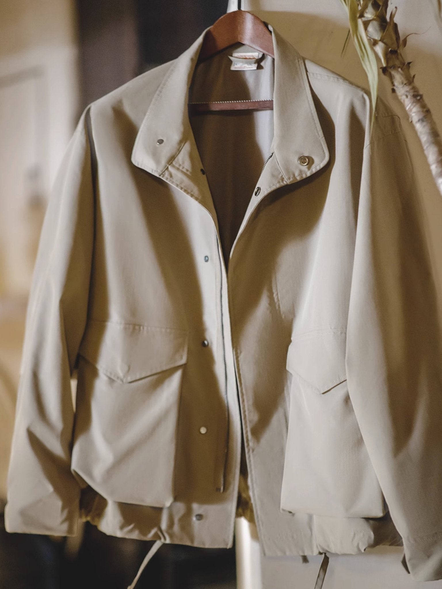襟を半分に折り返してセミハイネックにすることもでき、裾には調節可能なコードが付いており、開閉はボタンとジッパーのデザインを採用しています。