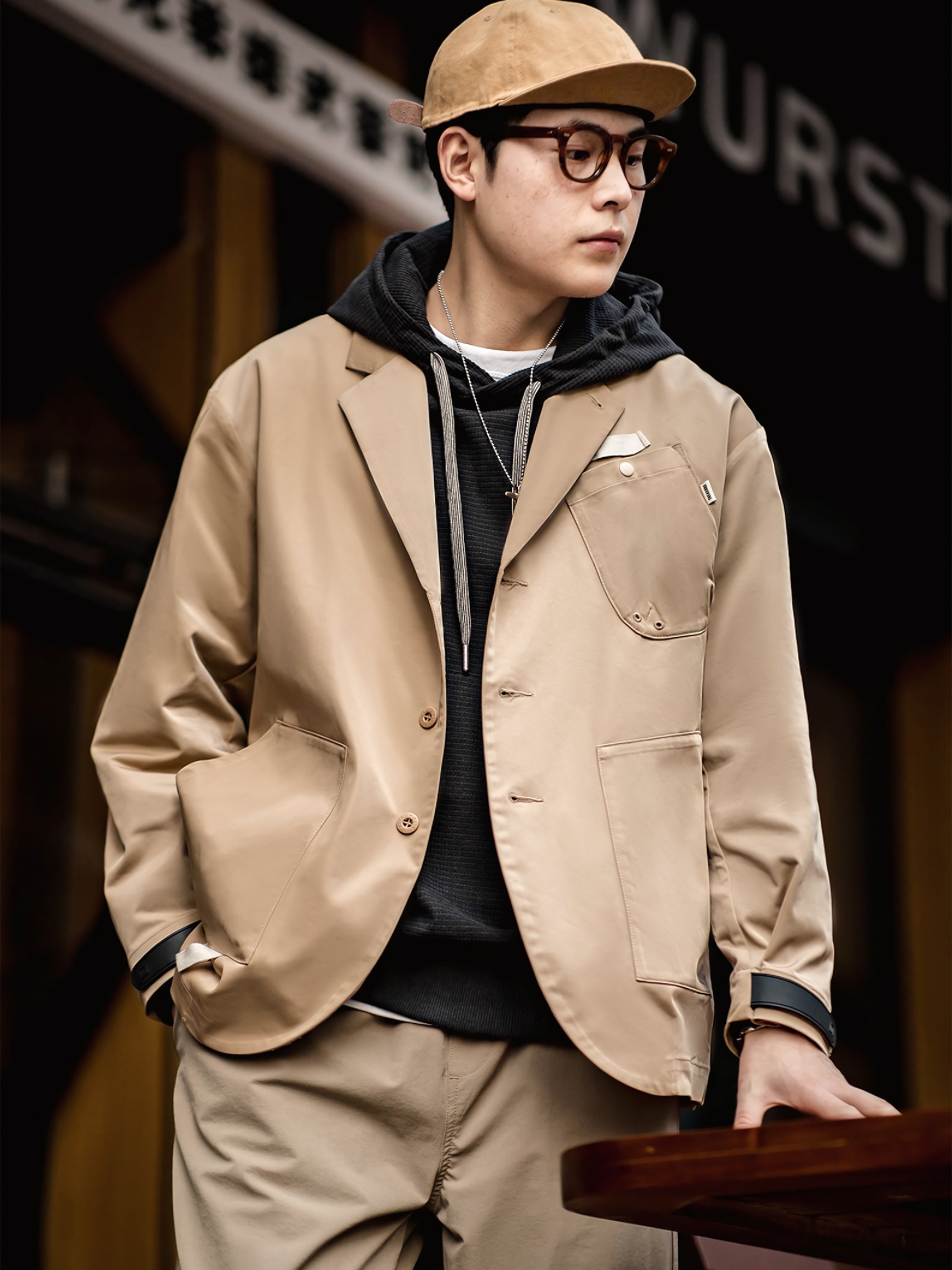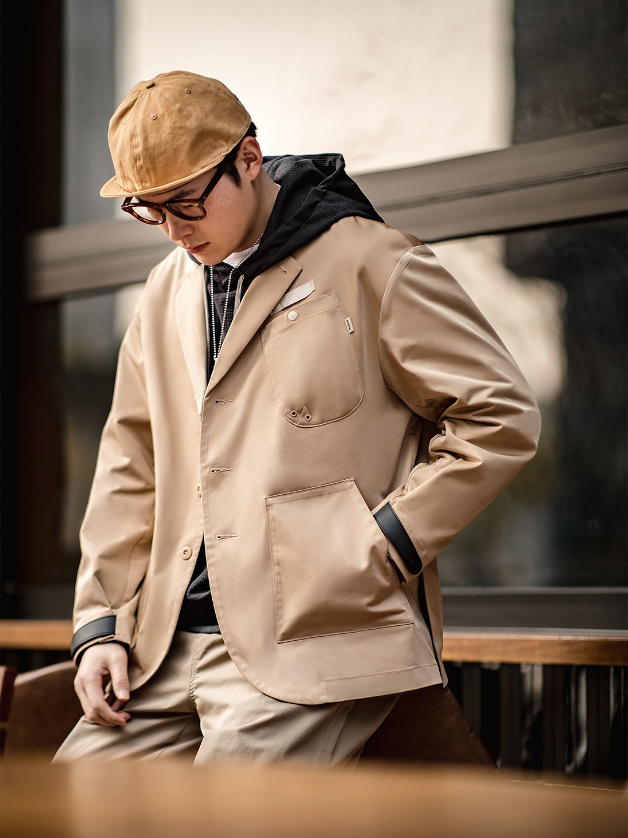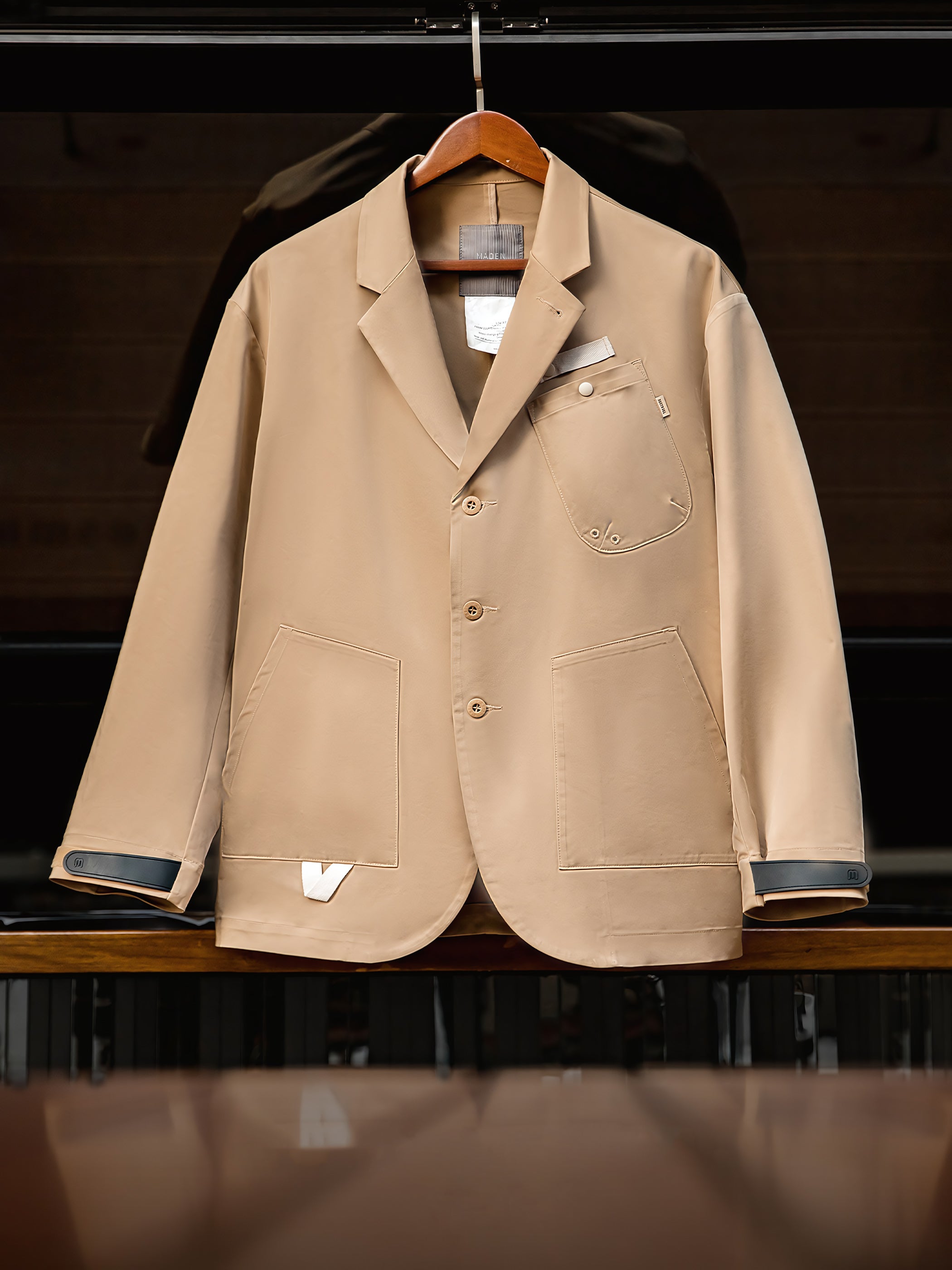 このジャケットは、ノッチドラペル(切り欠かれたV字型の襟)が特徴のデザインです。この襟の形状は、フォーマルな優雅さを演出し、シャツやネクタイの選び方に制約を与えません。また、フロントには大きなパッチポケット3つがあり、手ぶらで出歩ける便利さを提供しています。