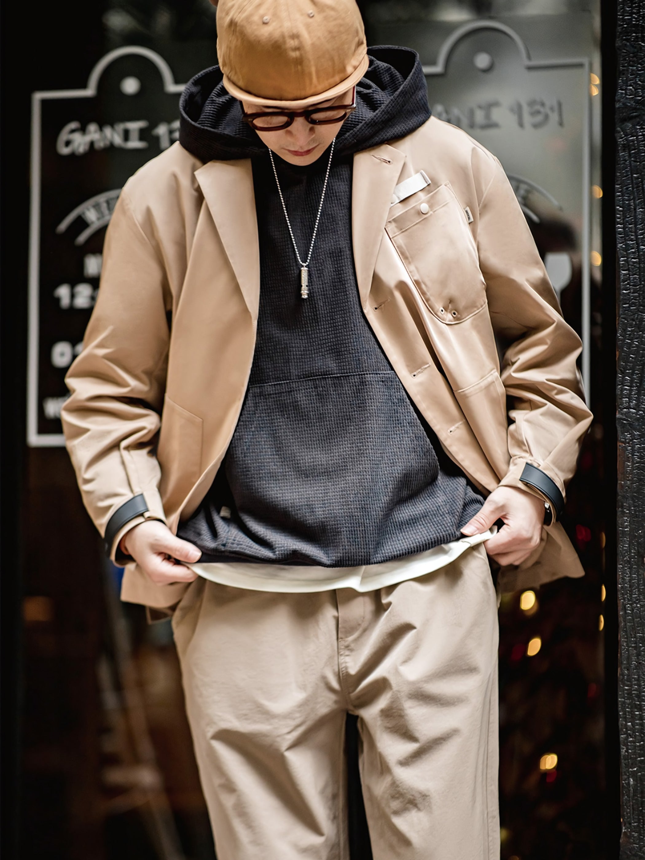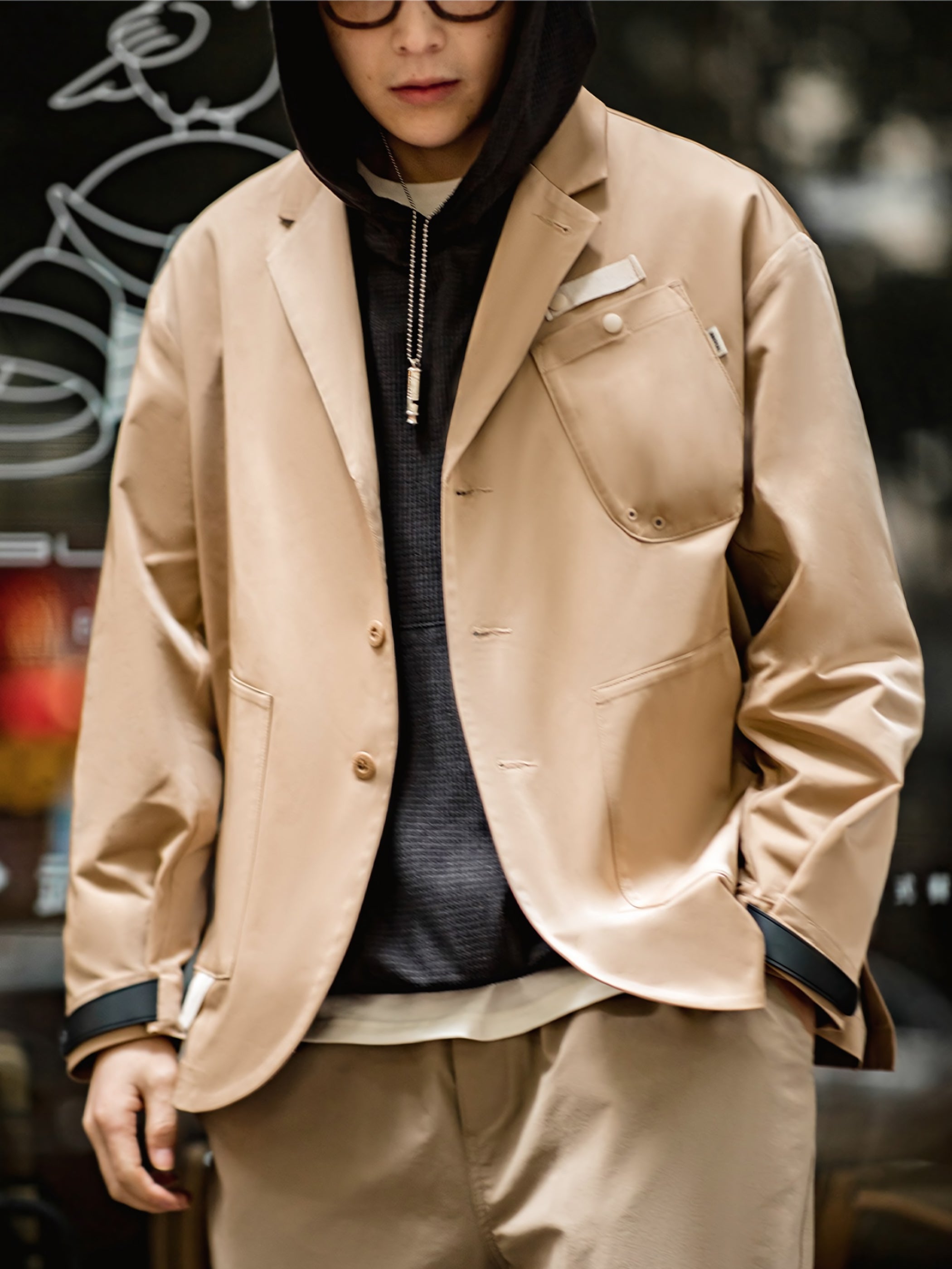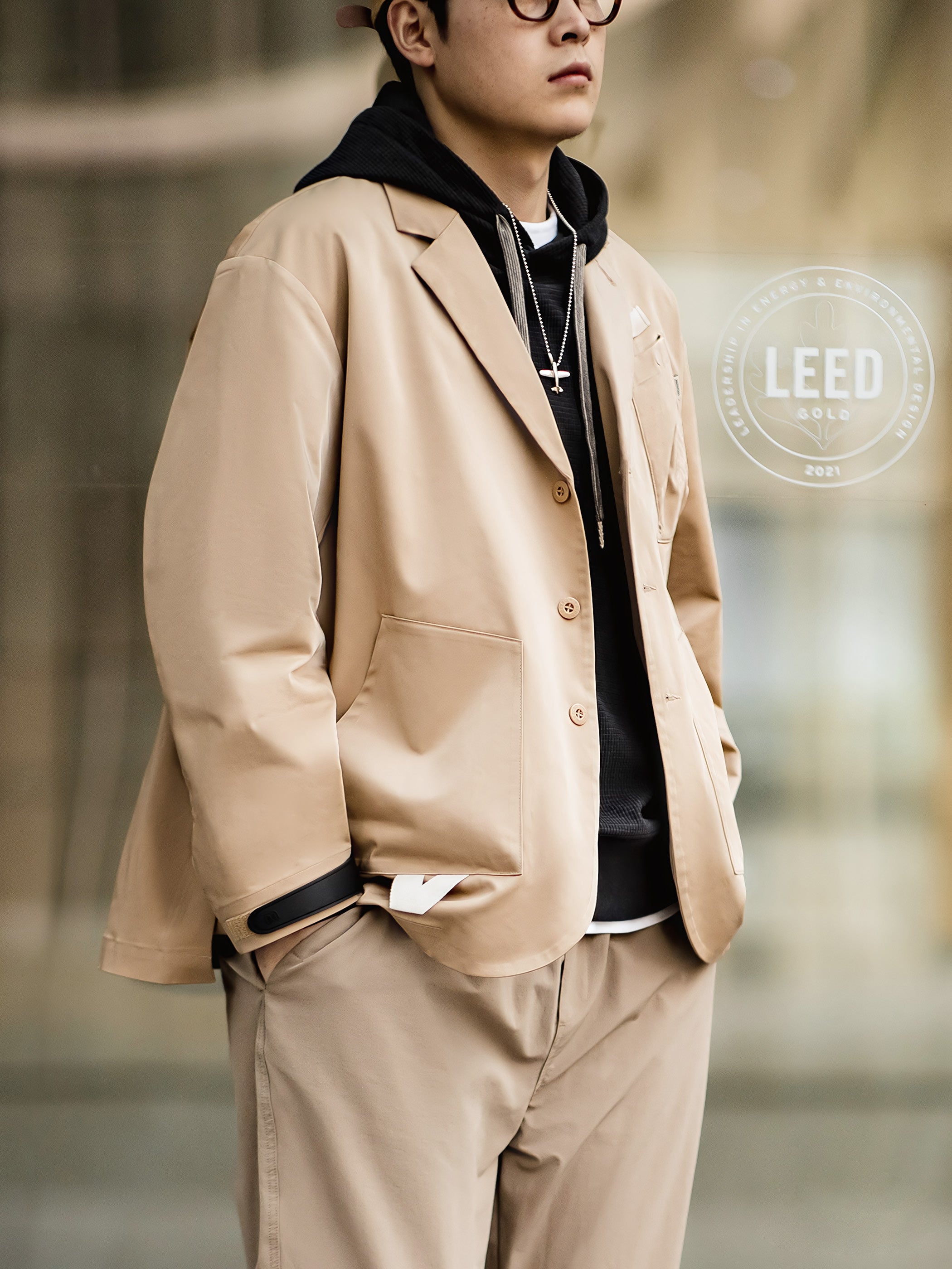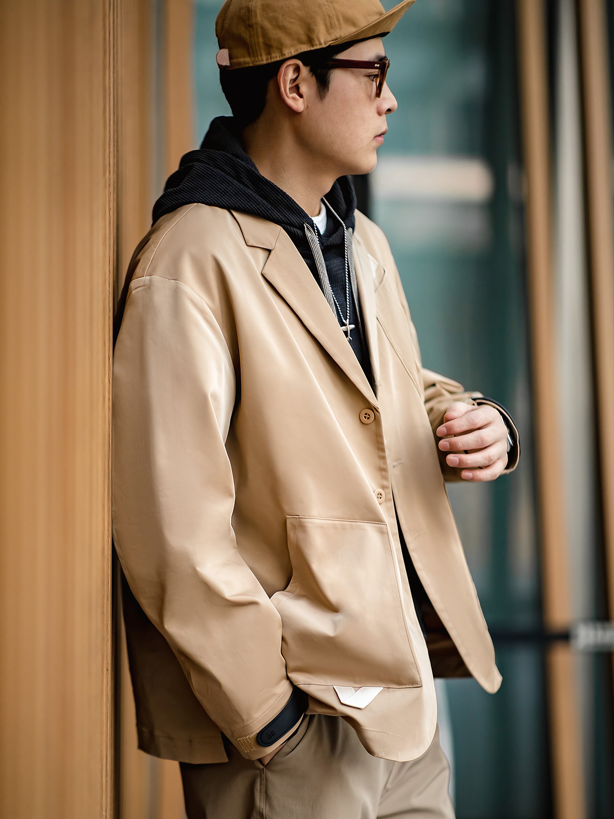 3つのボタンと幅広なシルエットは、ワイルドで男らしい雰囲気を醸し出しています。
