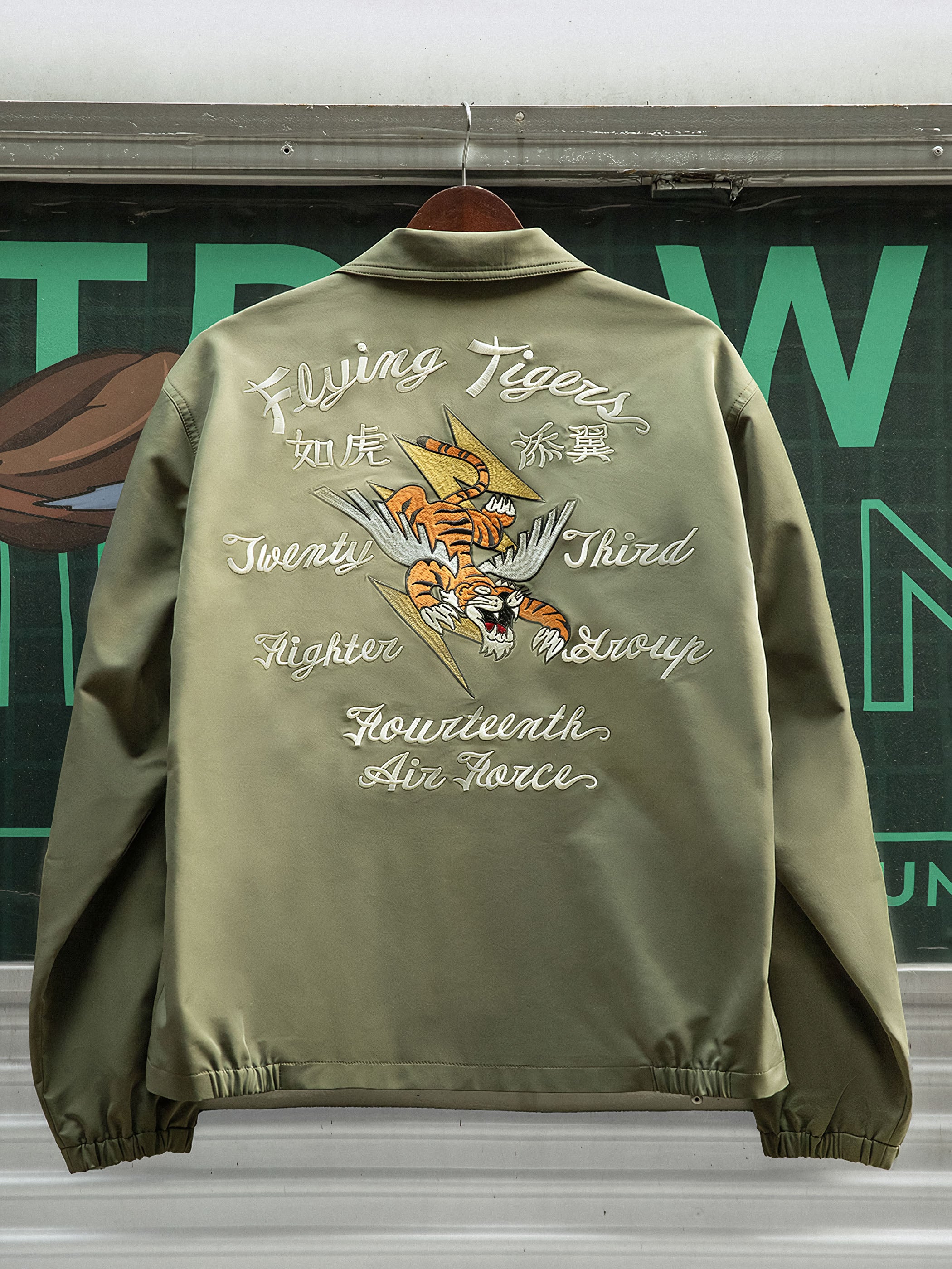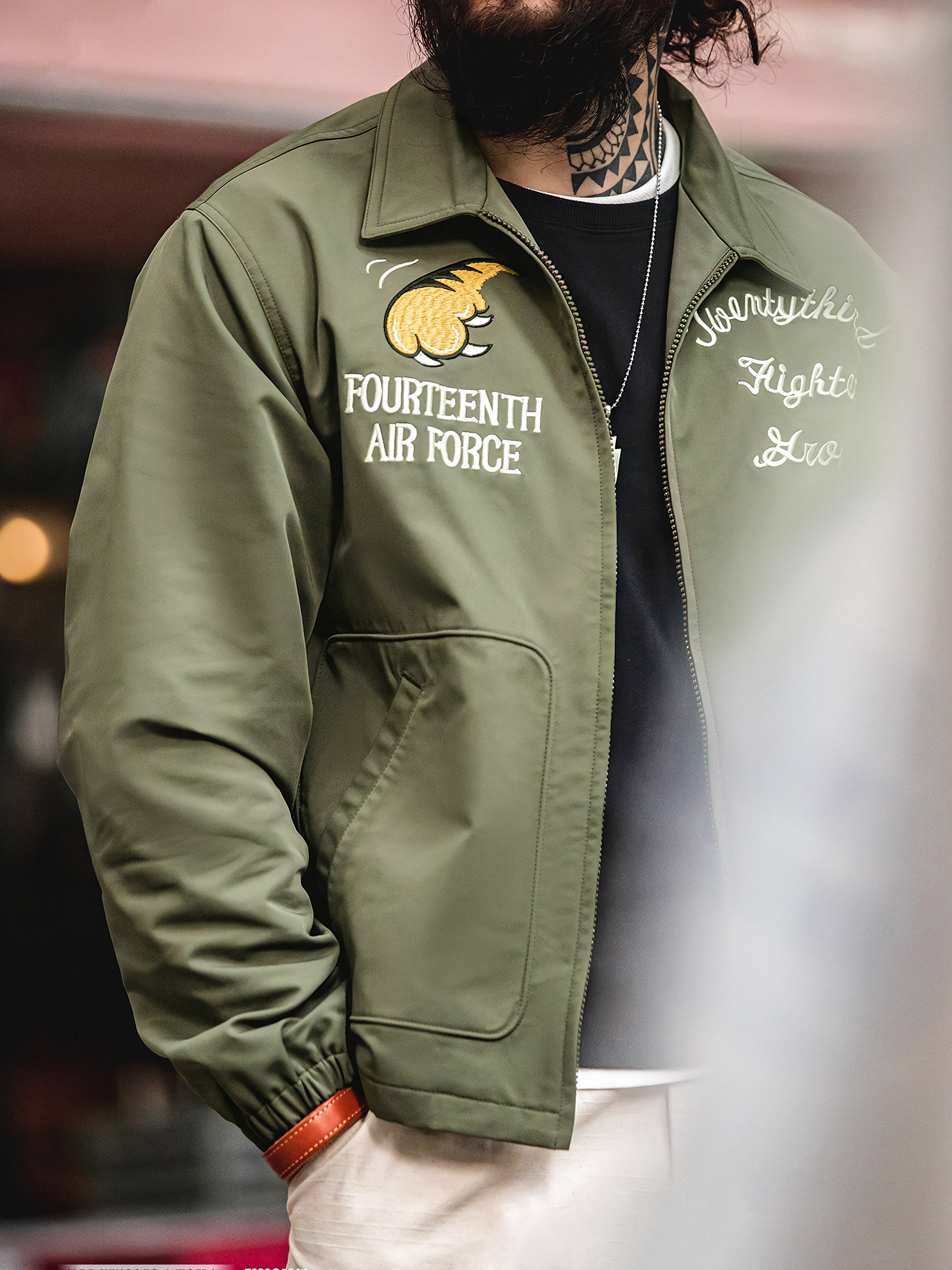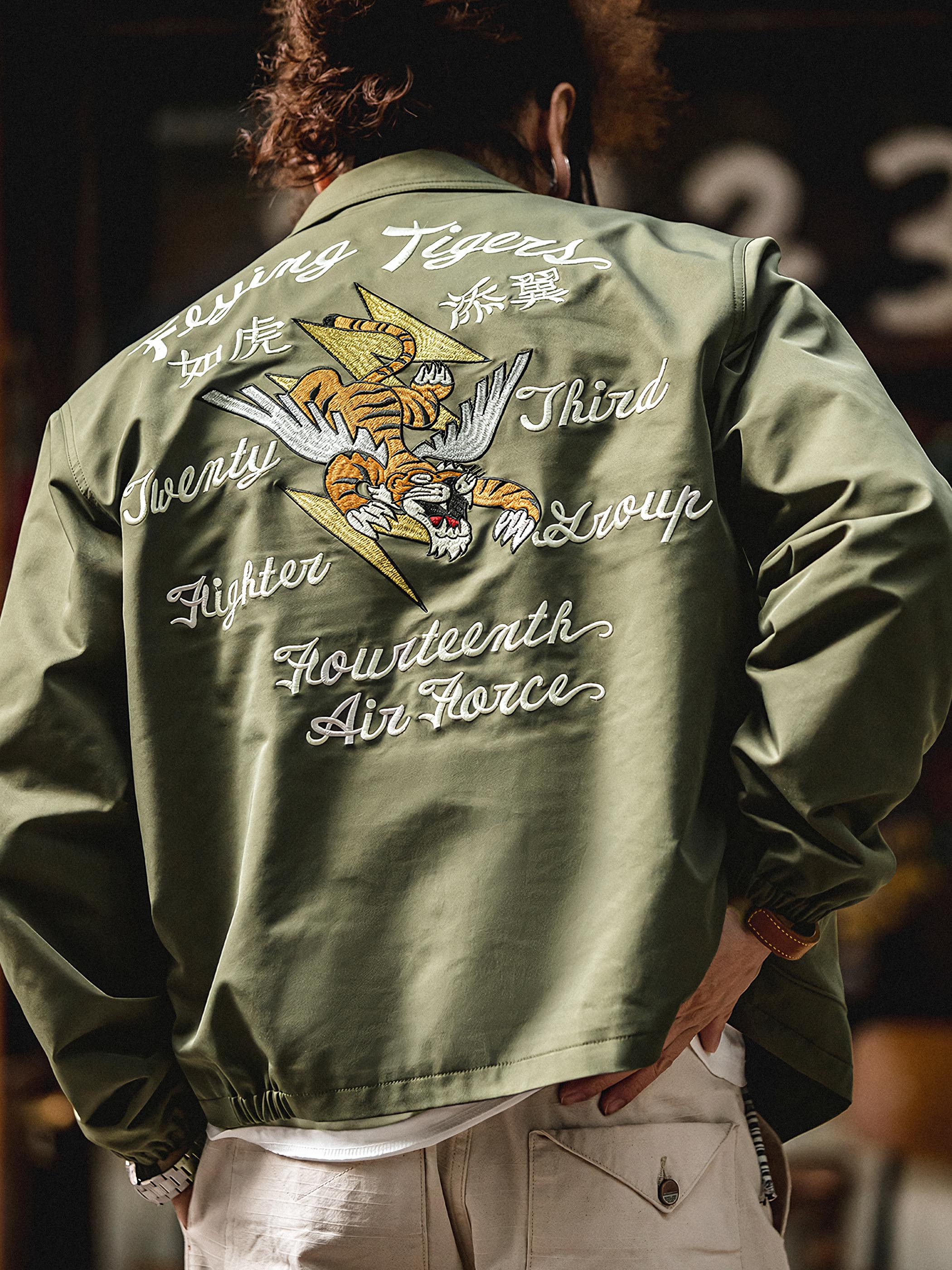 M2フライトジャケットは、パイロットスタイルをデザインのインスピレーションにしており、背面には目を引く飛虎のデザインが施されています。これにより、軍事的な雰囲気と歴史的な要素が際立ちます。ジャケットの前面にはタイガークローのデザインがあり、全体的なデザインに個性とダイナミズムを与えています。
