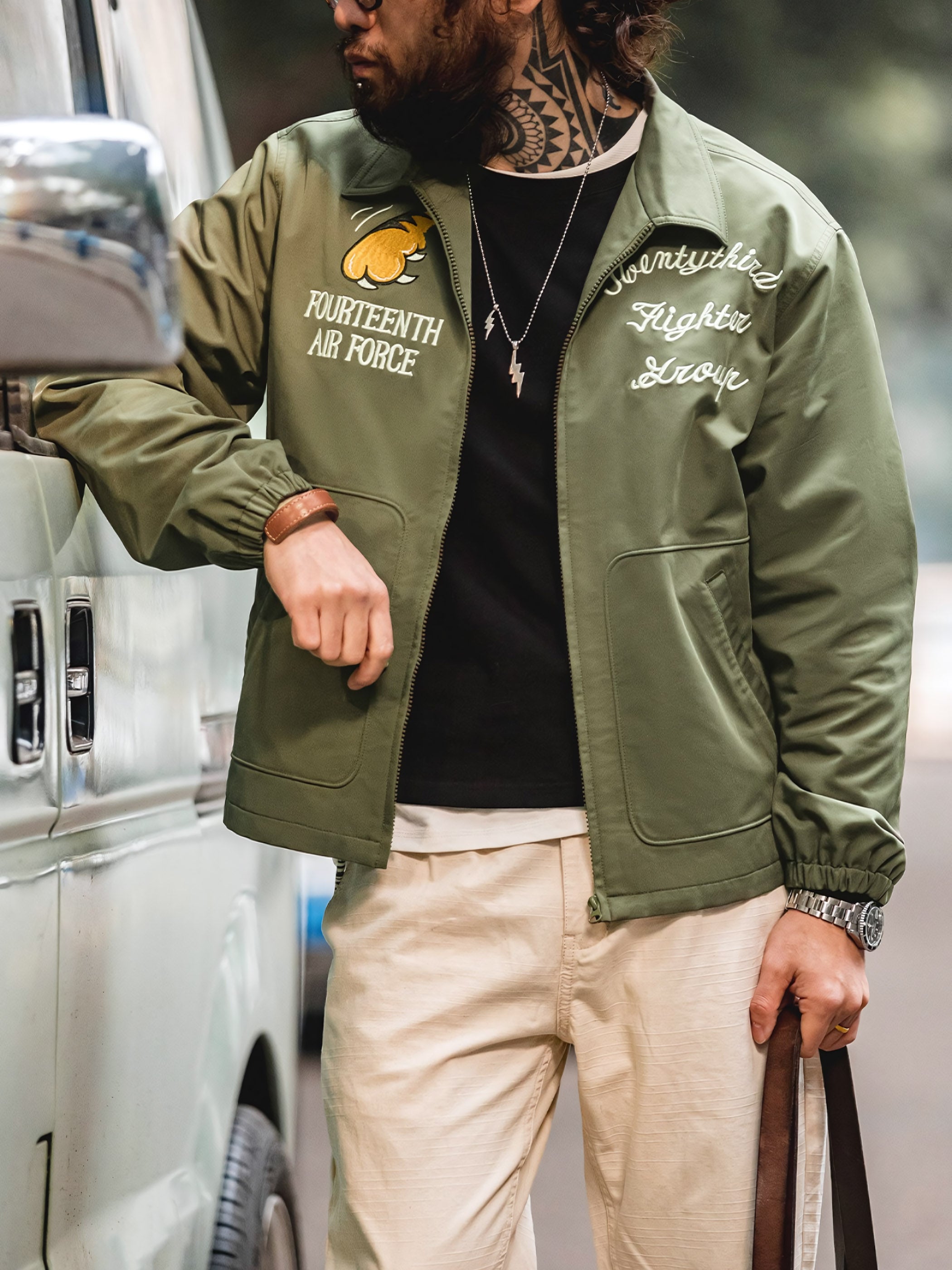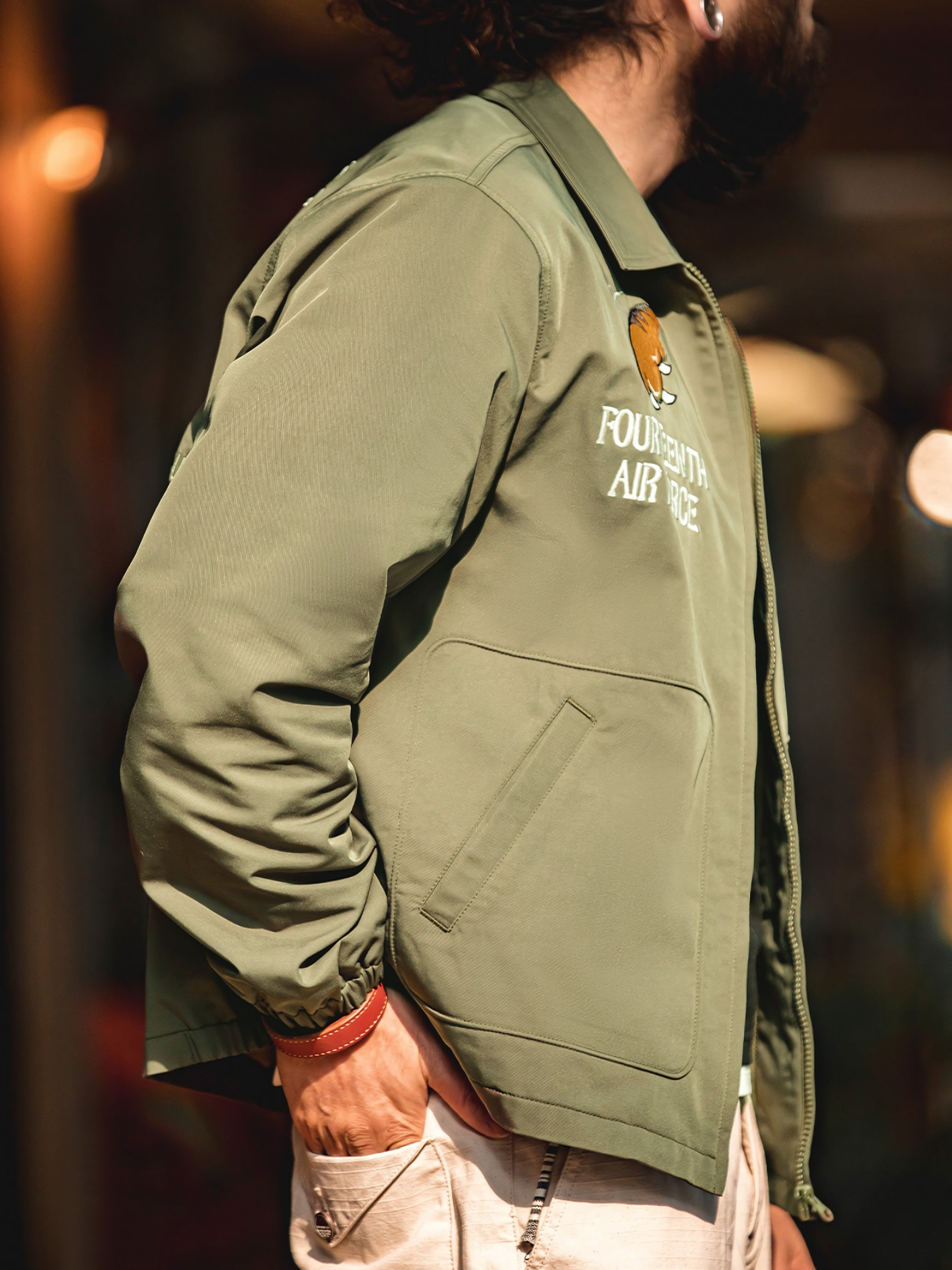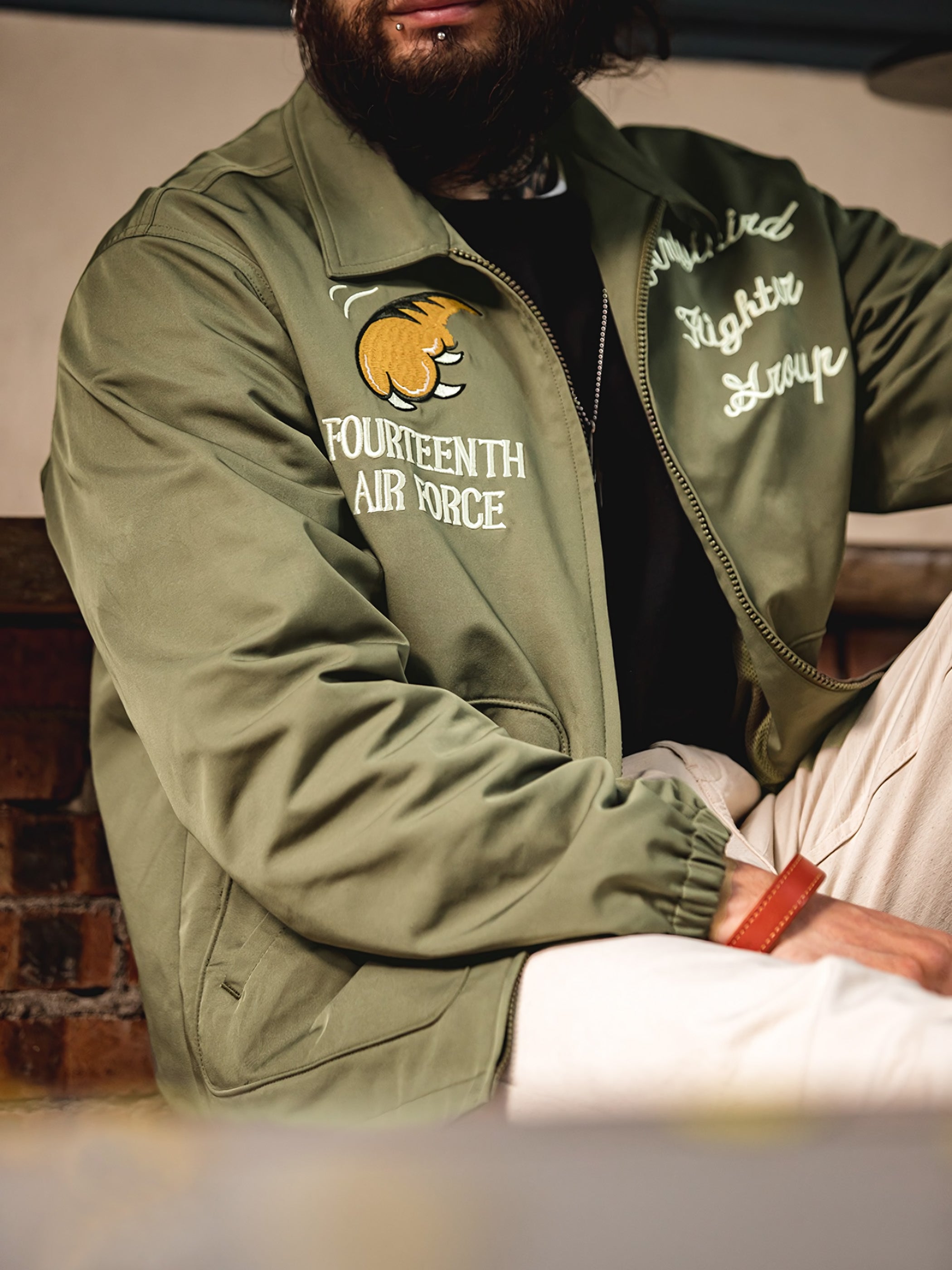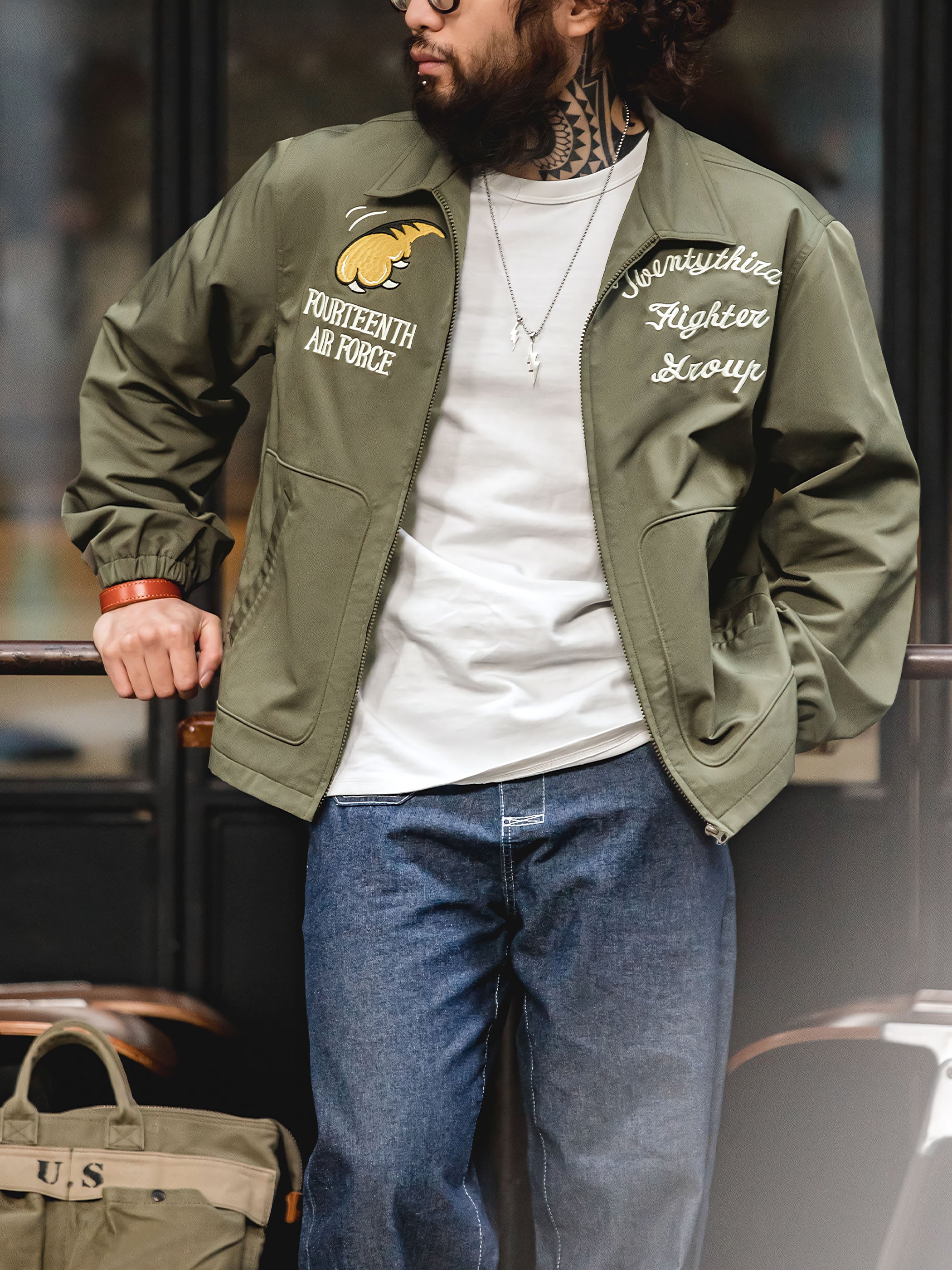 M2フライトジャケットは、パイロットスタイルをデザインのインスピレーションにしており、背面には目を引く飛虎のデザインが施されています。これにより、軍事的な雰囲気と歴史的な要素が際立ちます。ジャケットの前面にはタイガークローのデザインがあり、全体的なデザインに個性とダイナミズムを与えています。