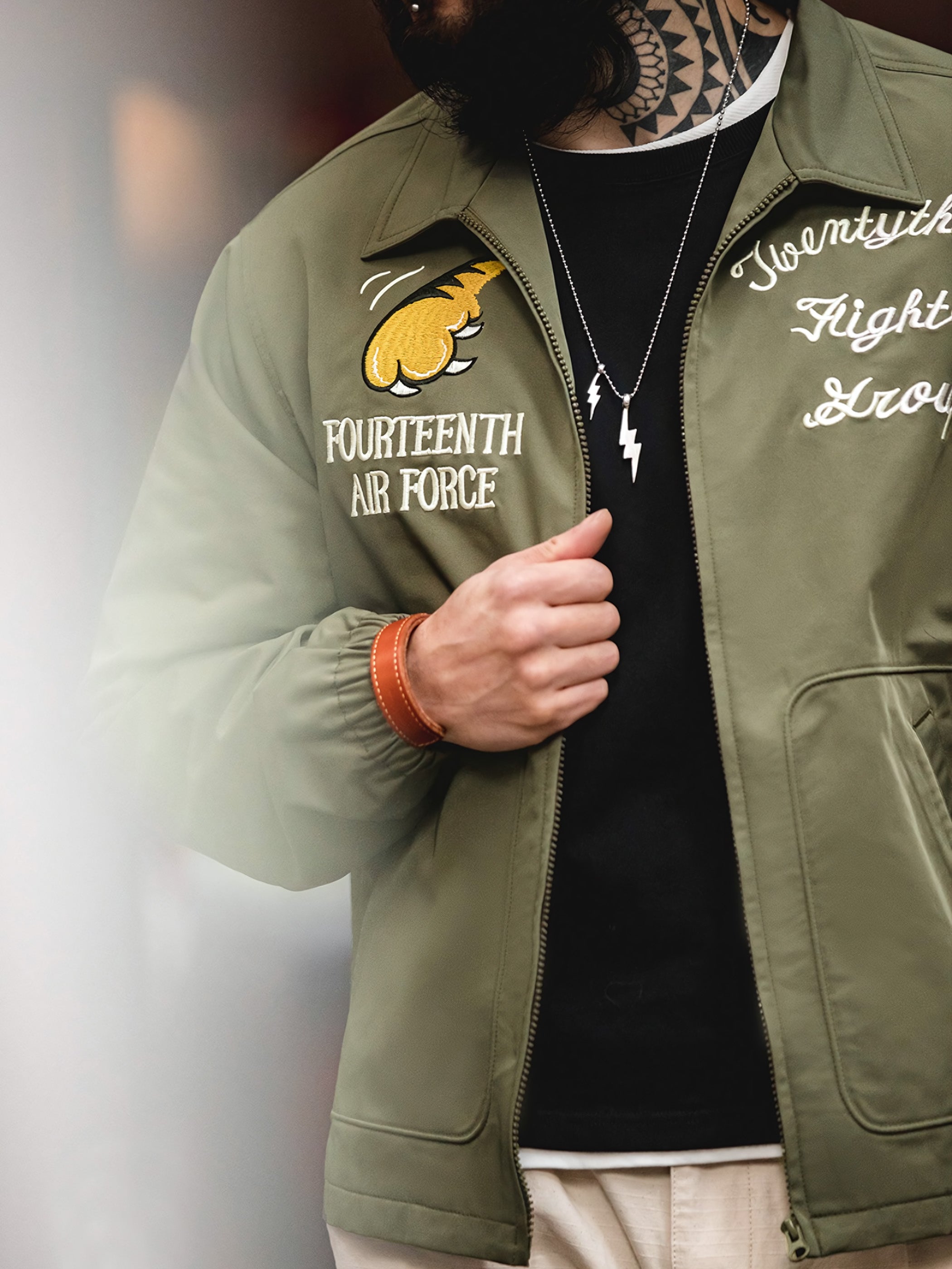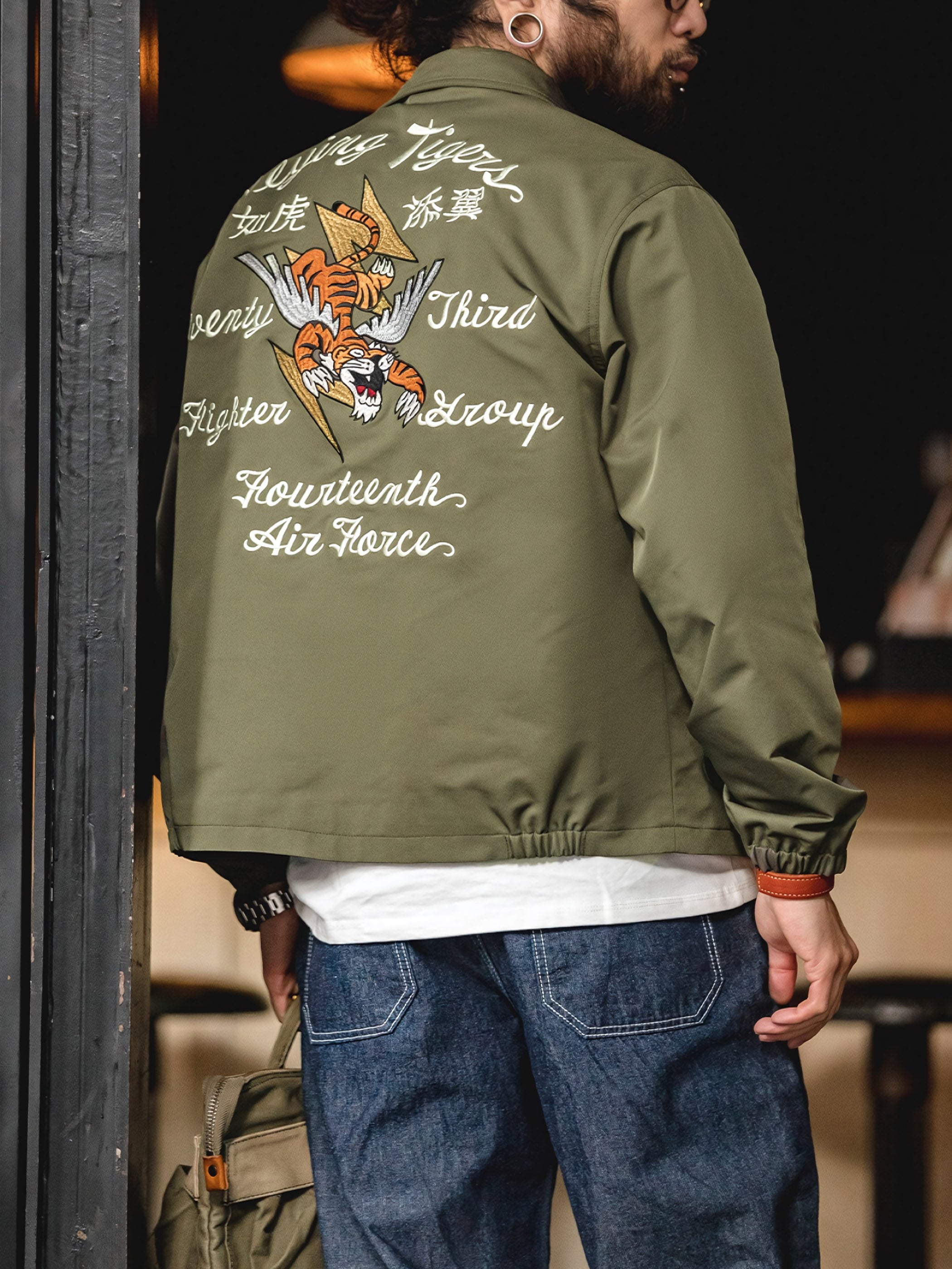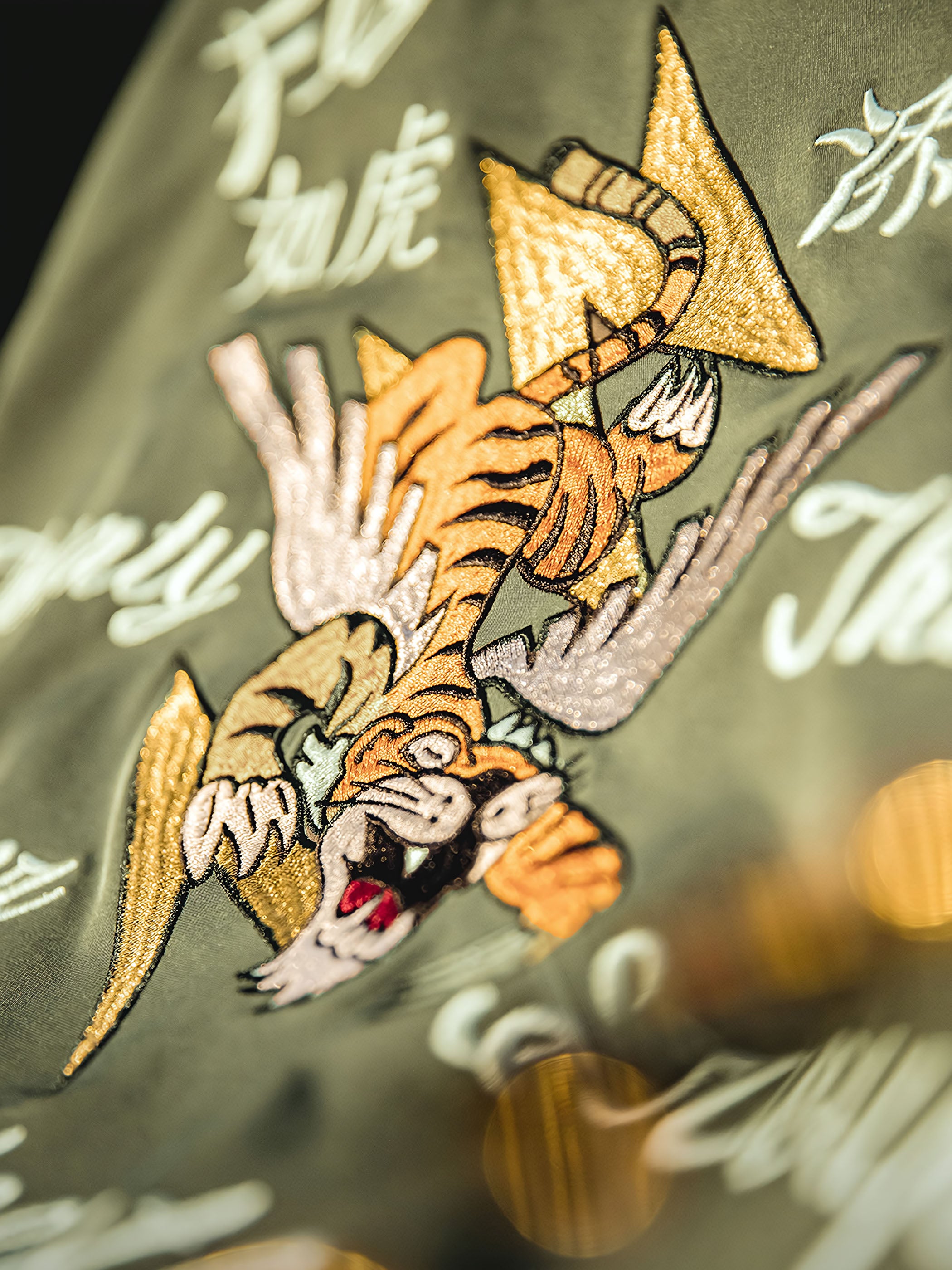 ジャケットのディテール設計は非常に細心の注意が払われており、立体的で生き生きとした刺繍デザインが施されています。飛虎とタイガークローのデザインは、ディテールの処理によって全体のデザインを豊かにしています。これらのディテールはジャケットを視覚的に魅力的にし、洗練された趣味と個性を追加しています。