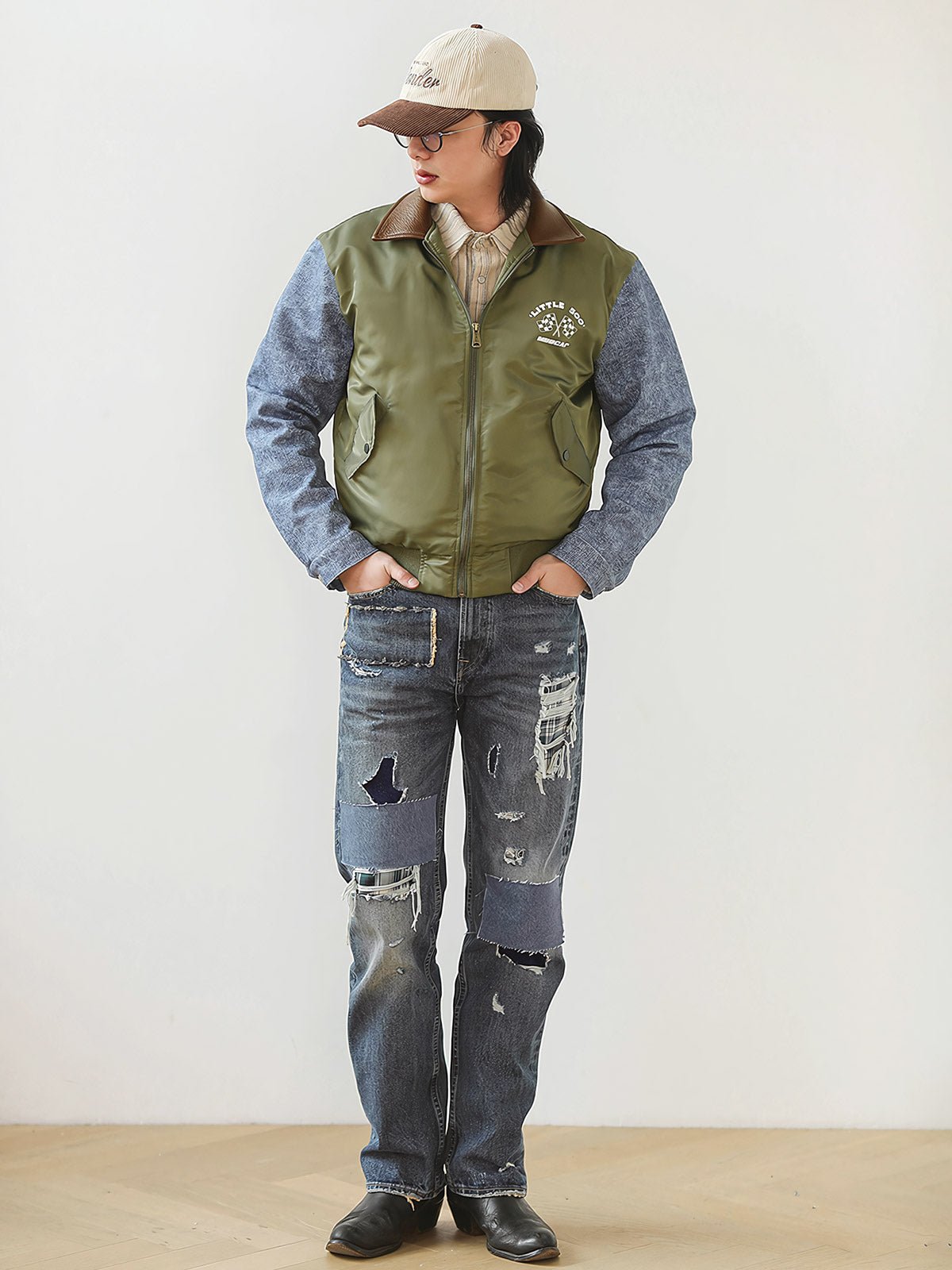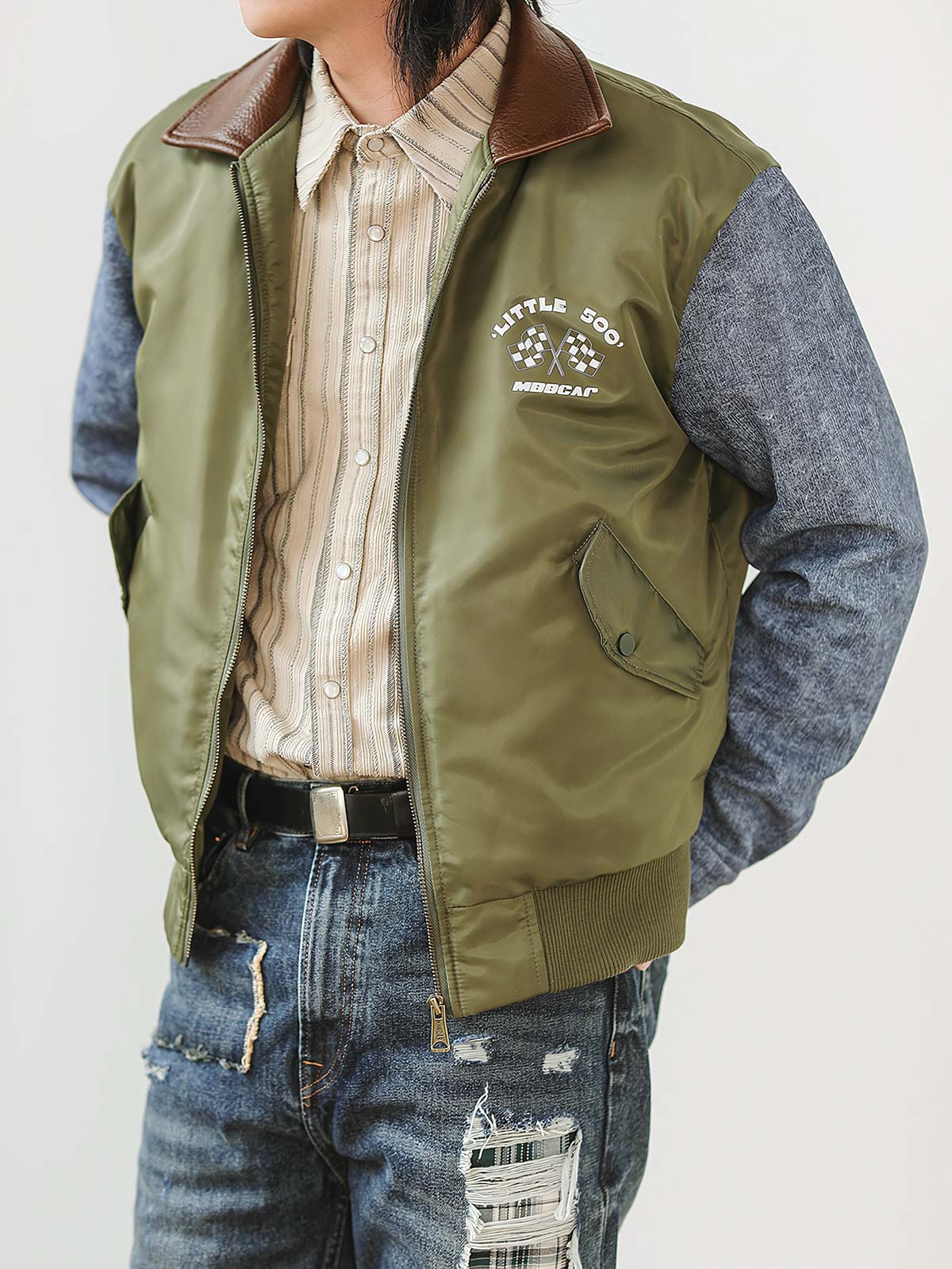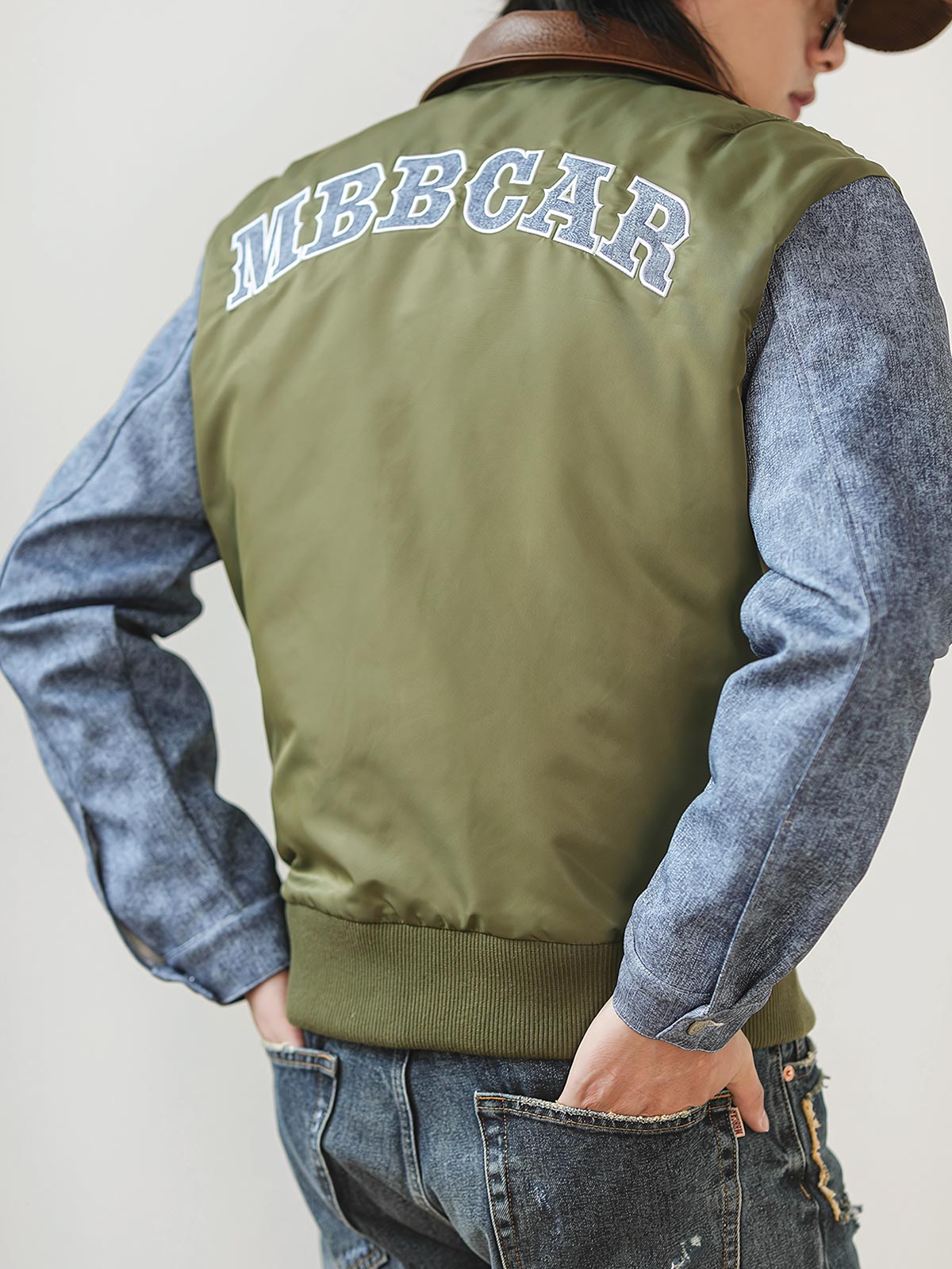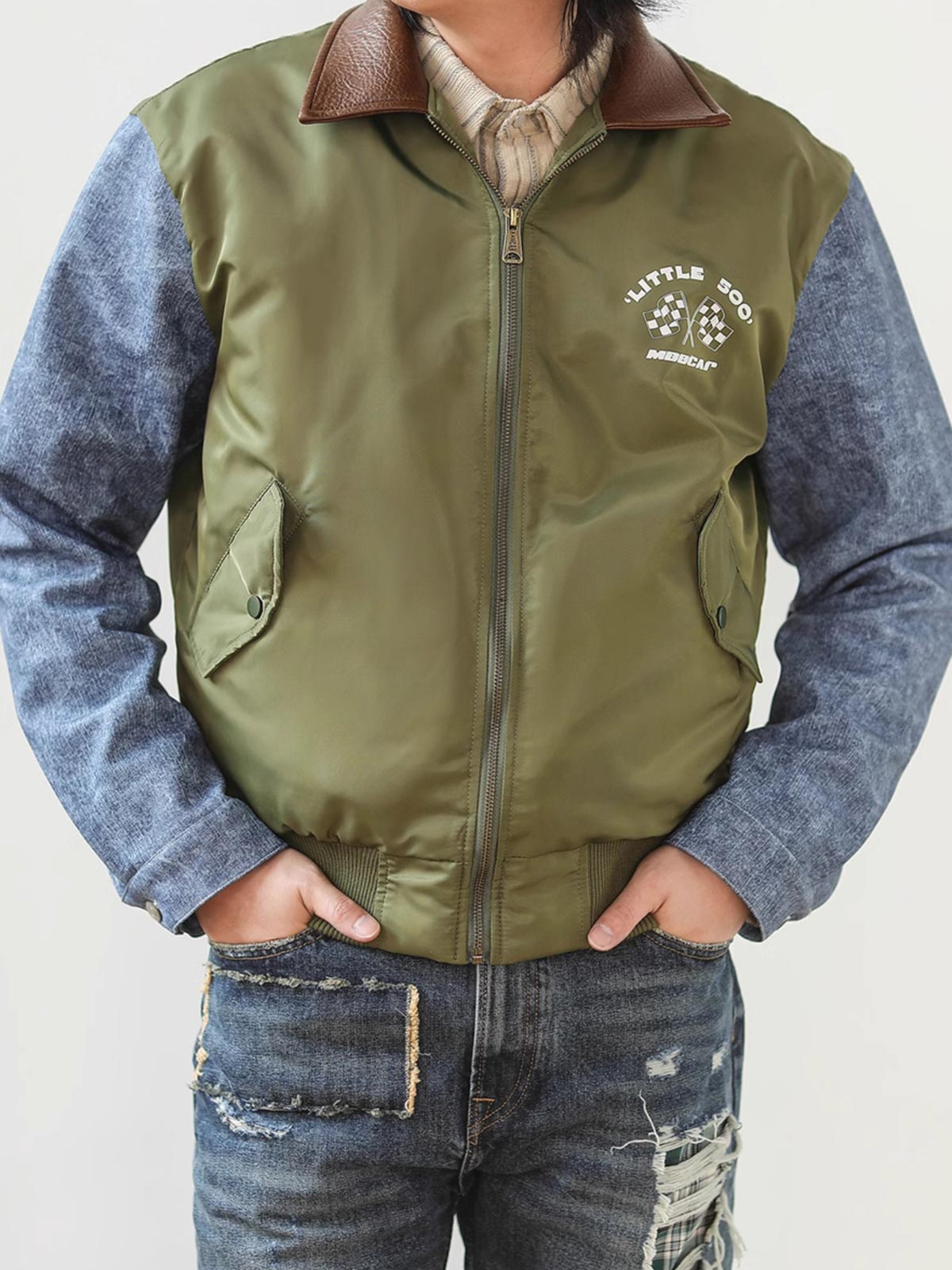 このジャケットは、MA-1フライトジャケットのクラシックなデザインとデニムジャケットの要素を融合させています。このジャケットはMA-1の基本デザインを維持し、重い密度の斜め織りナイロン生地など、滑らかでしっかりとした質感を実現しています。同時に、デニム風の人工皮革の袖は、レトロな雰囲気を演出し、デニムジャケットの袖のカットを反映しています。