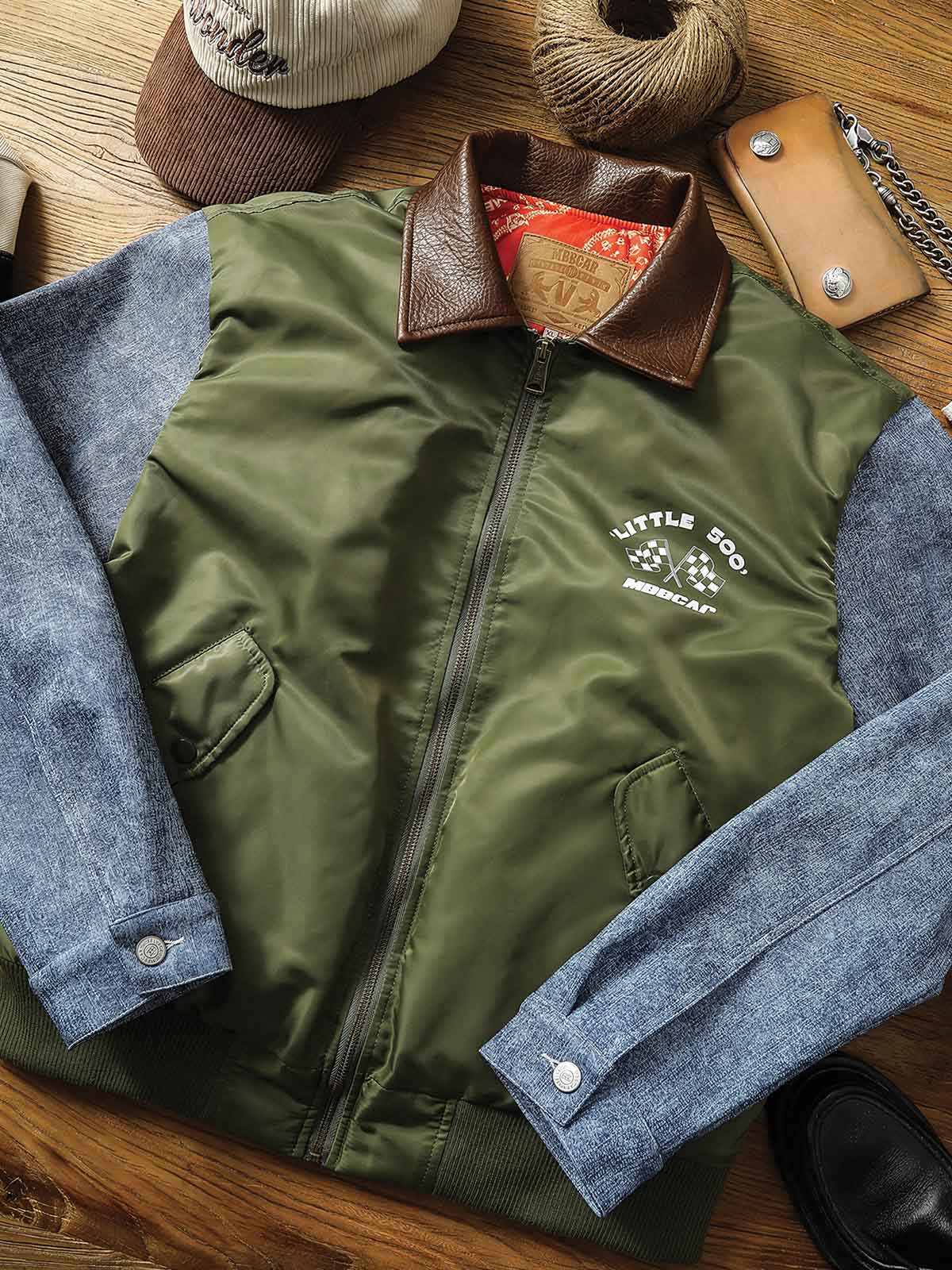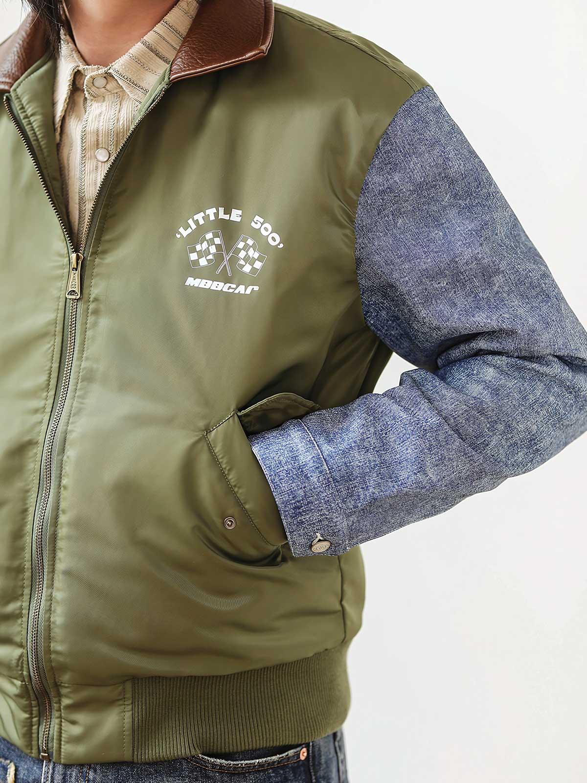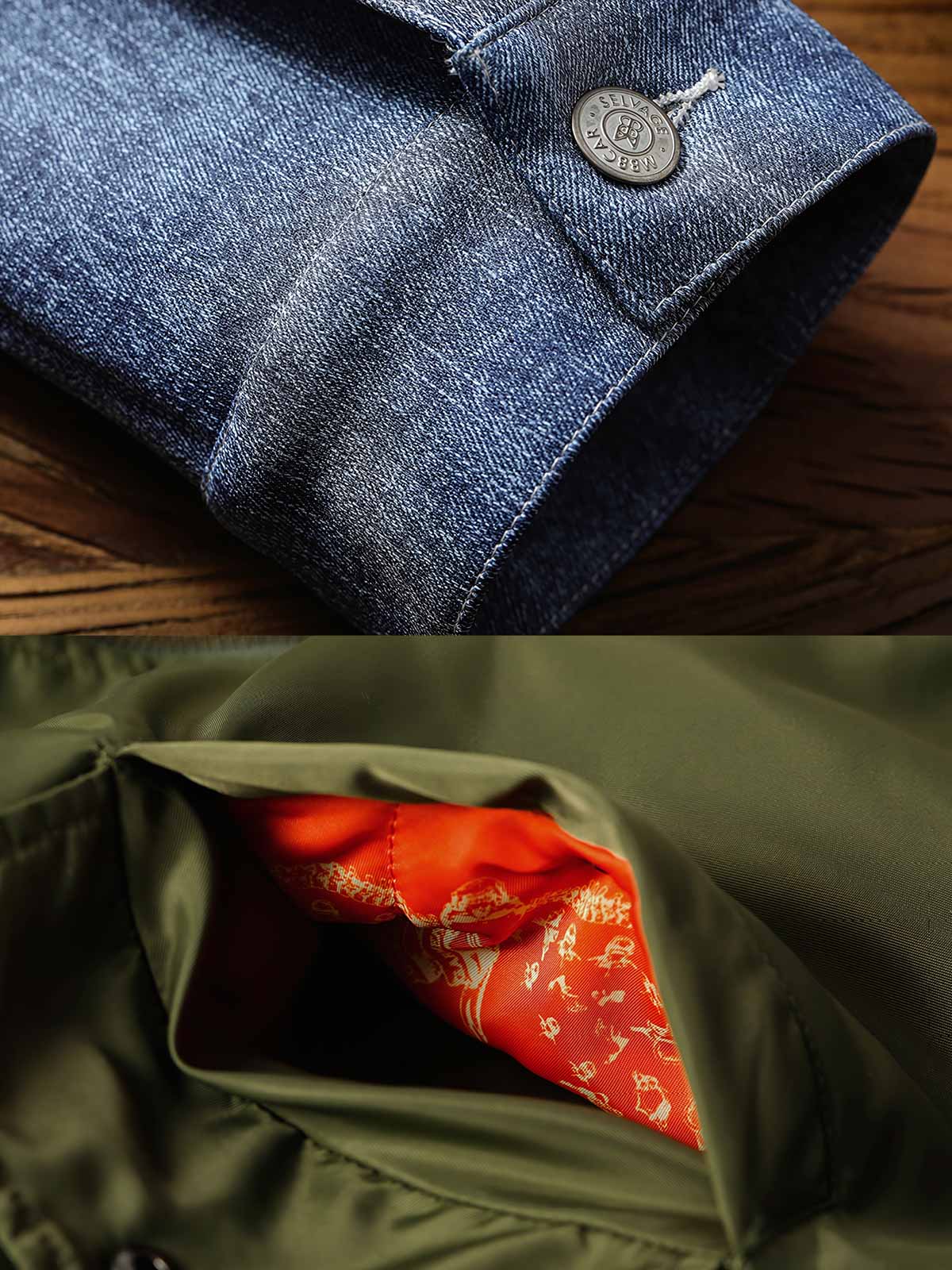 このジャケットは、MA-1フライトジャケットのクラシックなデザインとデニムジャケットの要素を融合させています。このジャケットはMA-1の基本デザインを維持し、重い密度の斜め織りナイロン生地など、滑らかでしっかりとした質感を実現しています。同時に、デニム風の人工皮革の袖は、レトロな雰囲気を演出し、デニムジャケットの袖のカットを反映しています。