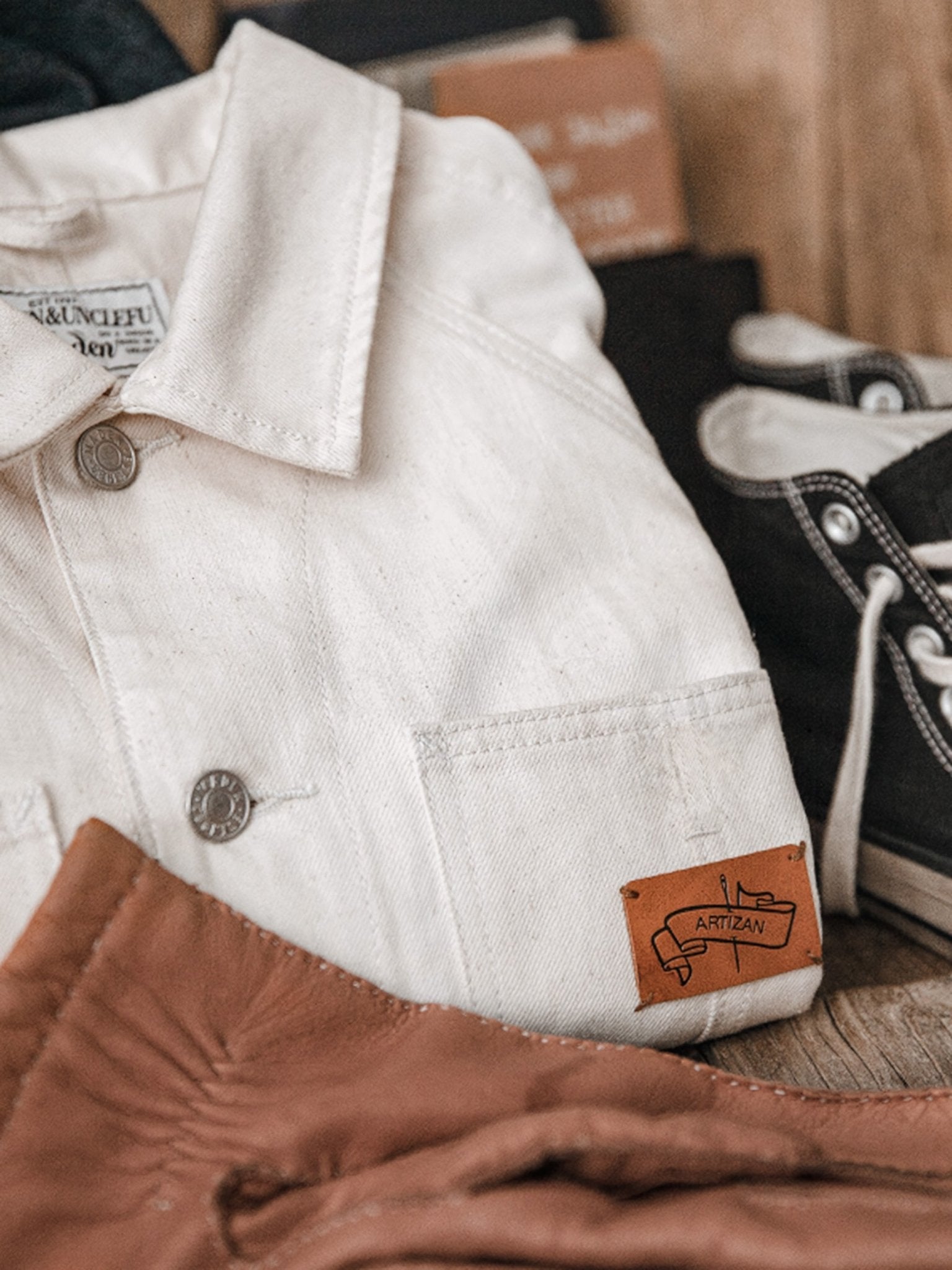 このデニムジャケットは、メンズカジュアルの定番アウターで、ジージャンとしても知られています。デザインは大きなポケットが特徴で、ワークジャケットの実用性を受け継いでいます。未染色の13.5オンスの生地は、コットンの本質を引き立てています。