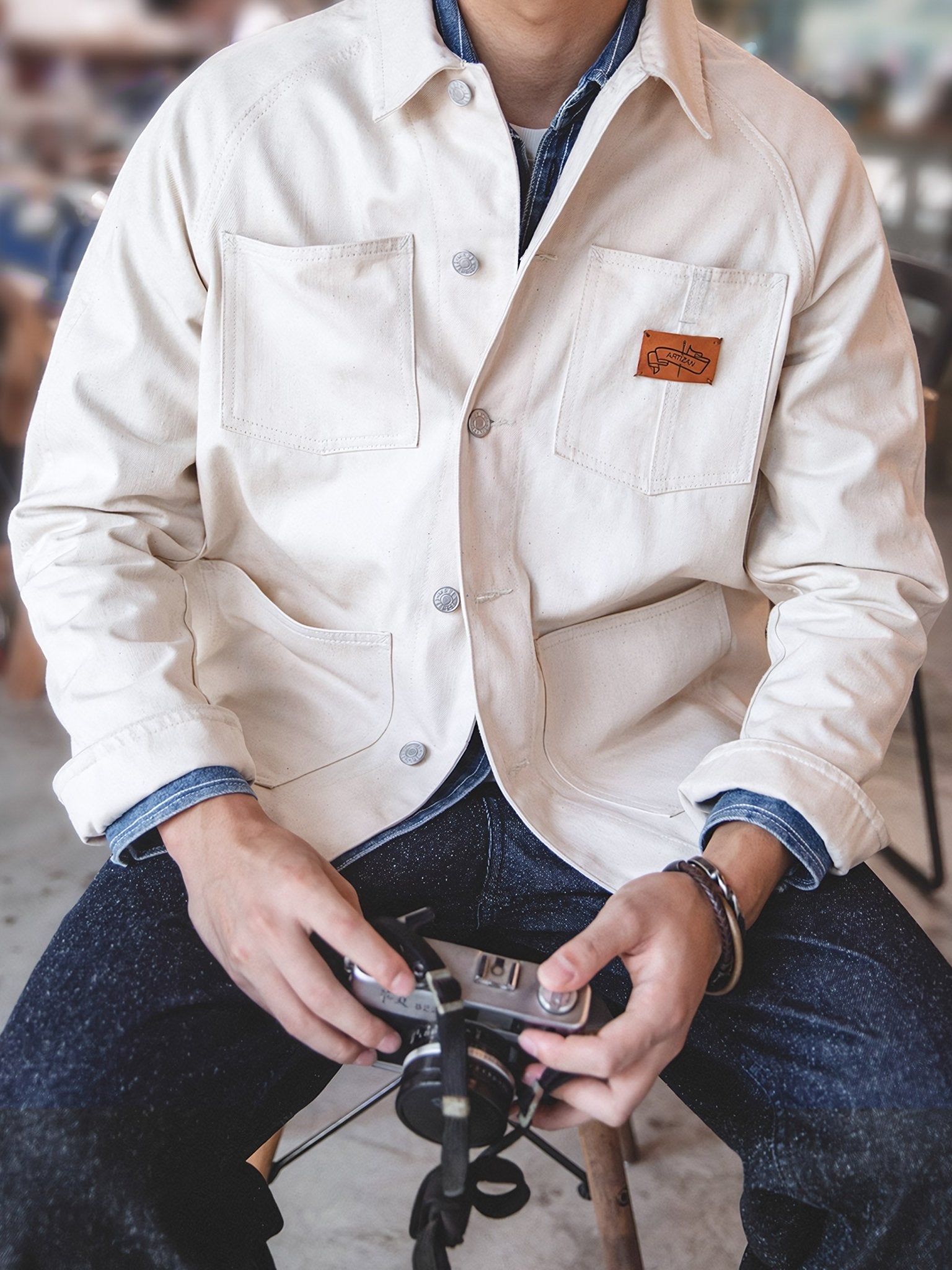 ディテールには大きなポケットが施され、ワークジャケットの実用性が際立っています。