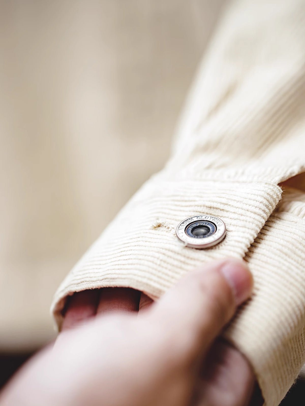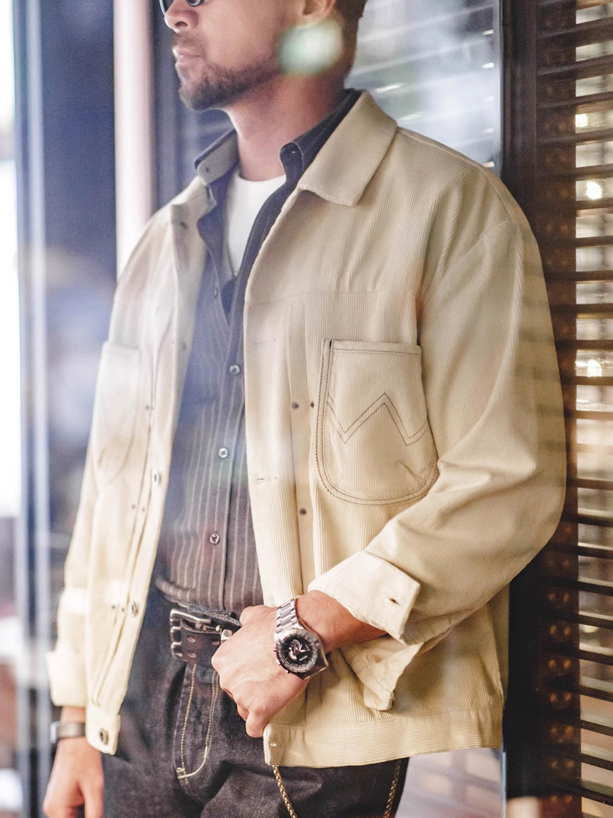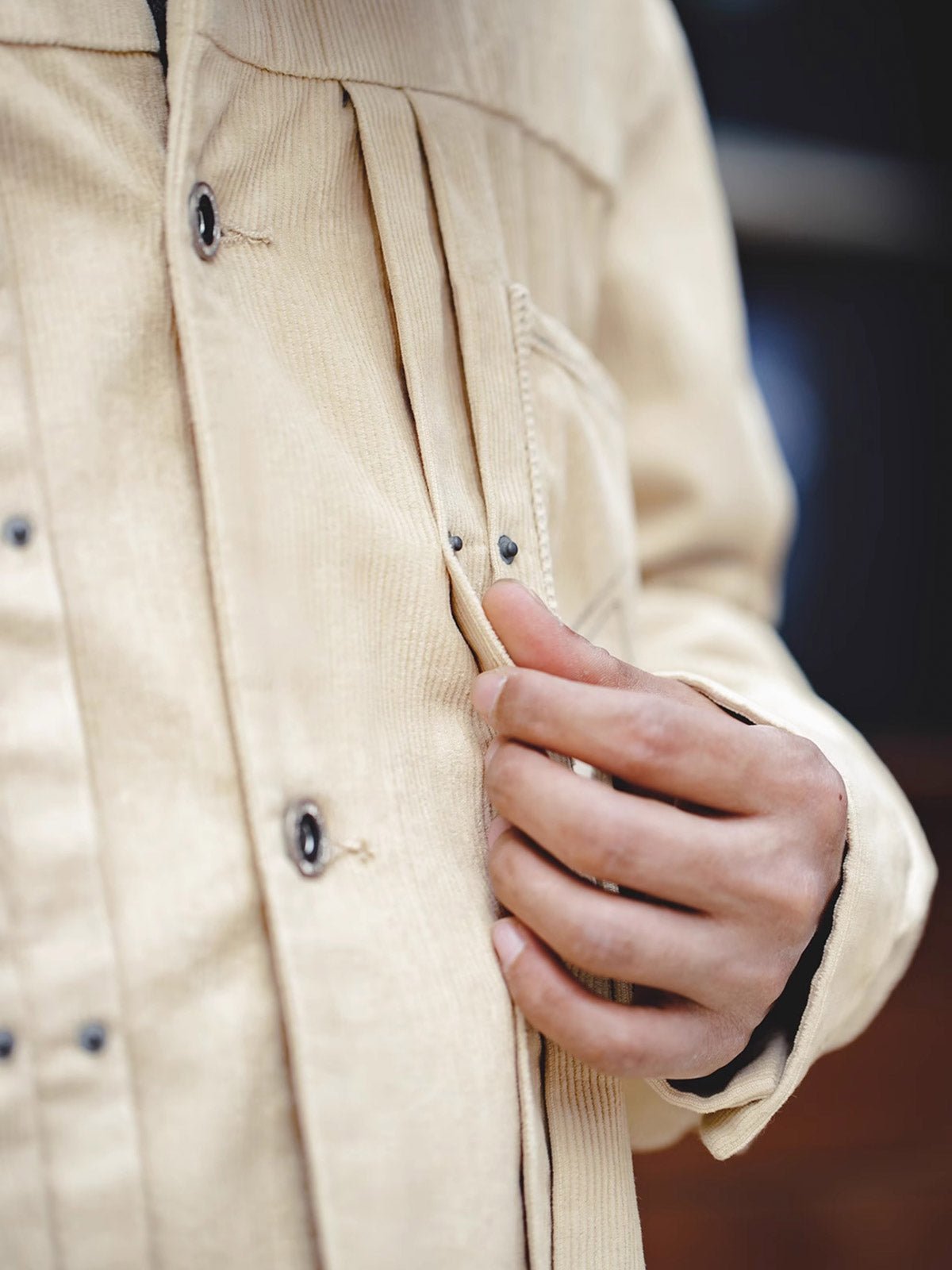 二重のプリーツはデザイン性を高め、また、ヴィンテージ風の銅釘と丸いボタンはレトロな質感を際立たせます。カバーのない丸い角のポケットは実用的でありながら、カジュアルな雰囲気をプラスしています。コーデュロイの質感はジャケットをより耐久性があり暖かくしています。