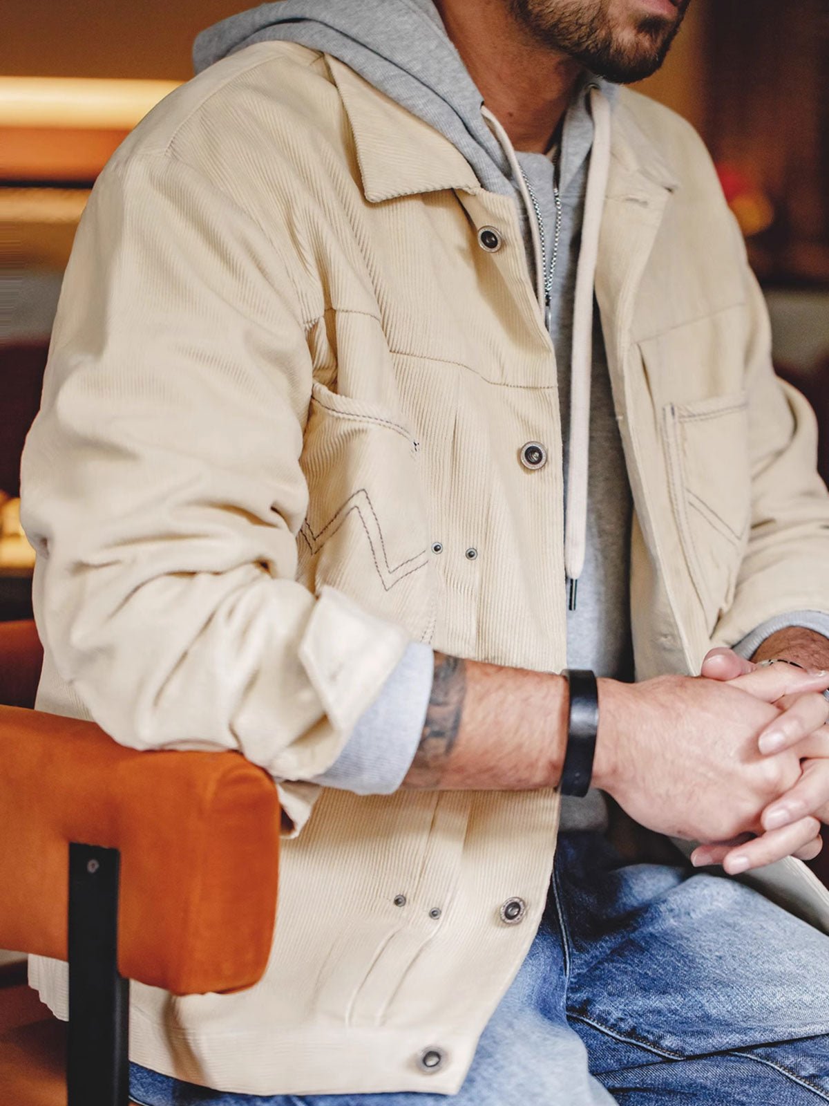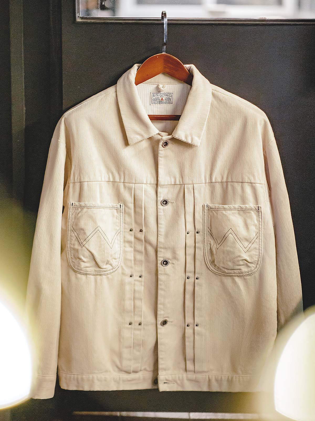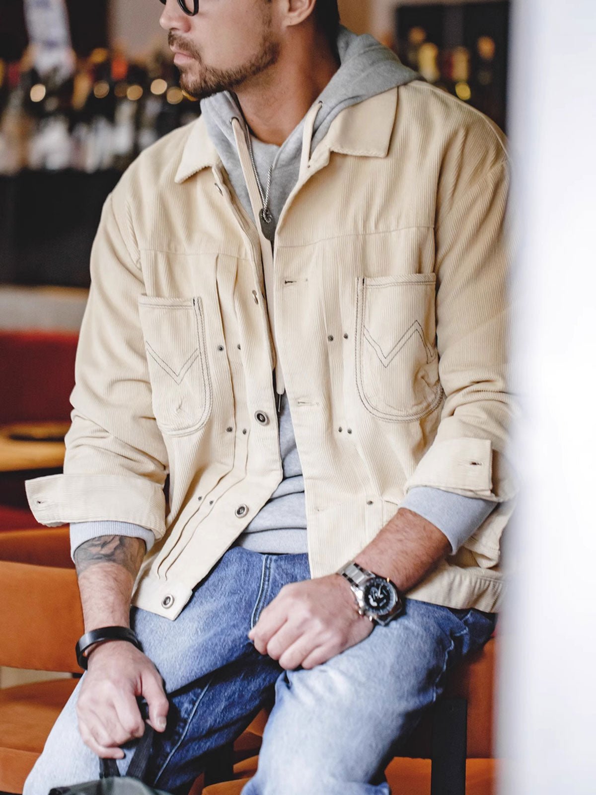 二重のプリーツはデザイン性を高め、また、ヴィンテージ風の銅釘と丸いボタンはレトロな質感を際立たせます。カバーのない丸い角のポケットは実用的でありながら、カジュアルな雰囲気をプラスしています。コーデュロイの質感はジャケットをより耐久性があり暖かくしています。