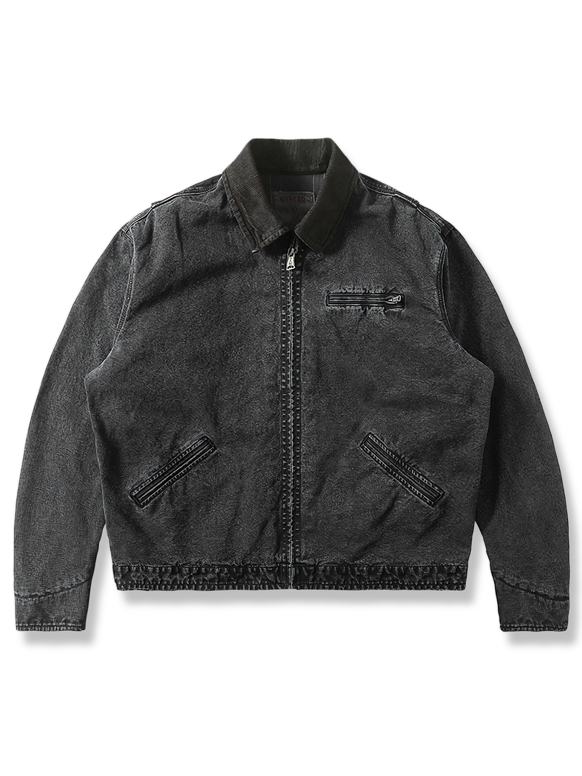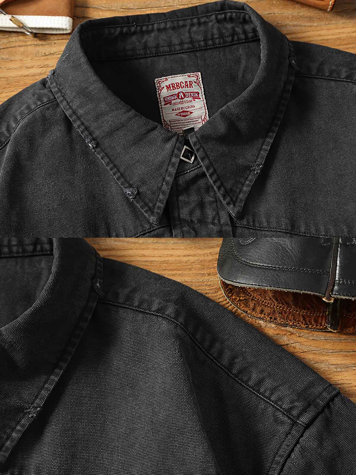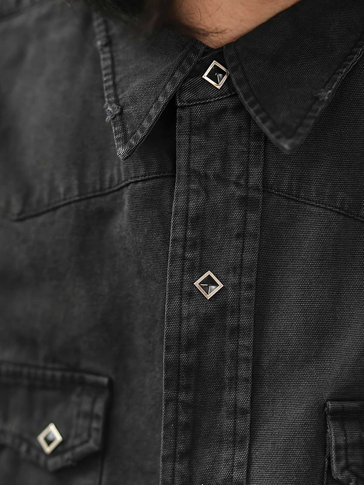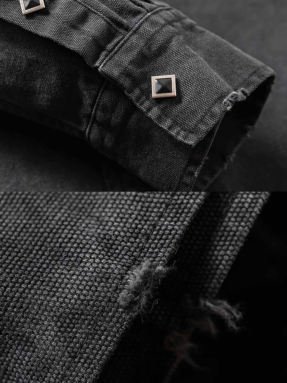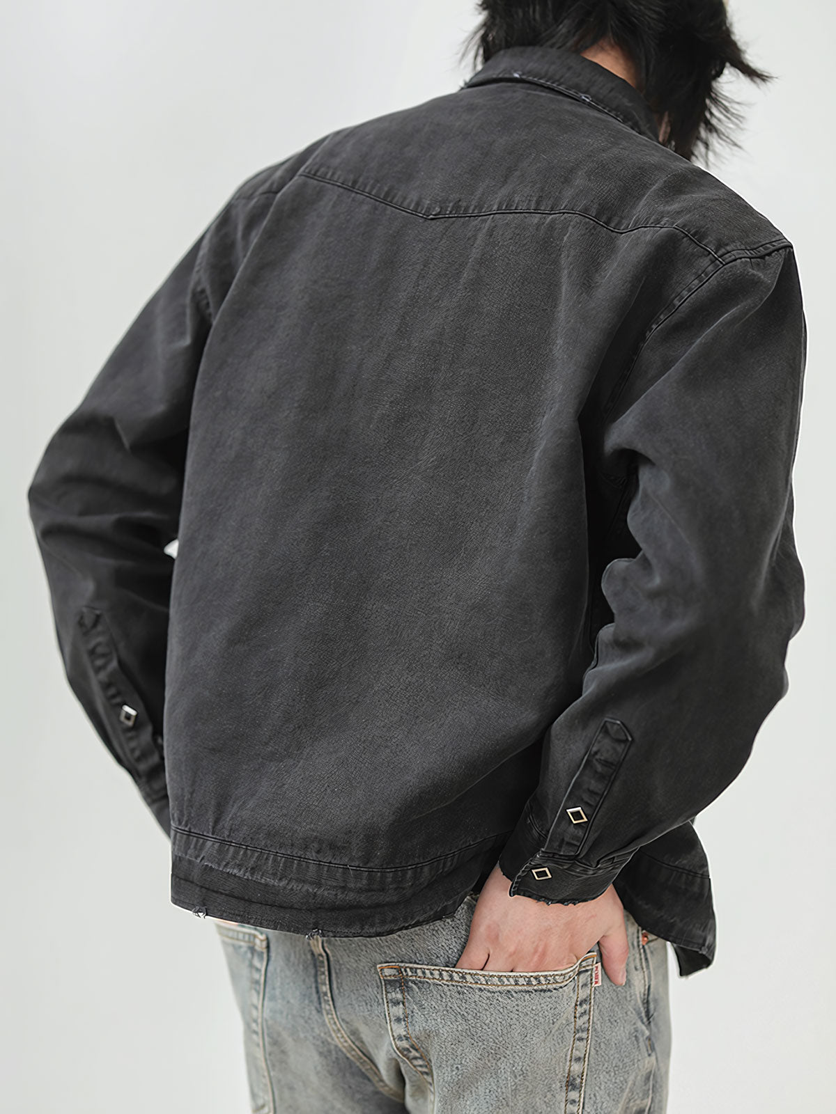 シャツジャケットは280gのコットン生地で作られており、特殊な工程を経て、酵素ウォッシュとストーンウォッシュ加工が施され、ユニークなエイジング効果が加わっています。全体的なダメージや色落ちのディテールは、全体の質感を高めます。