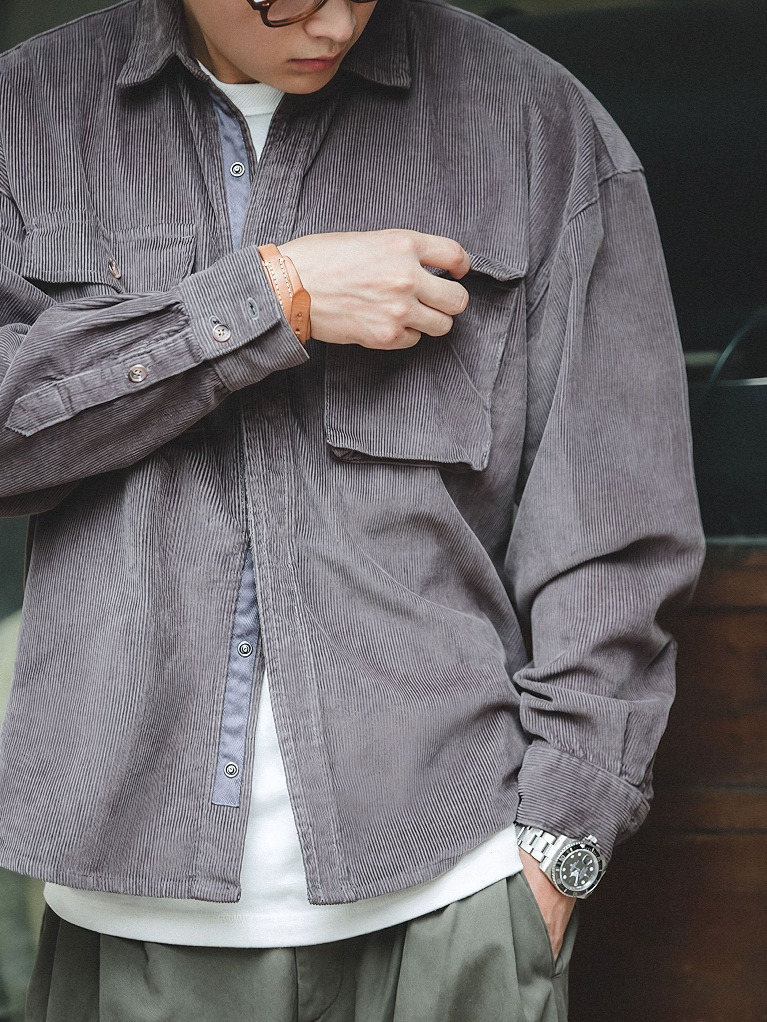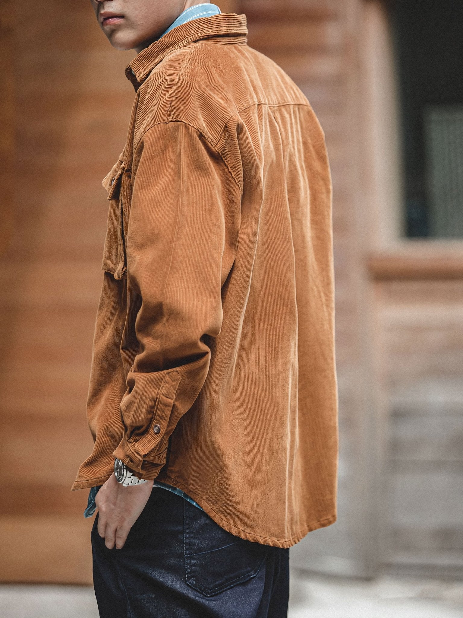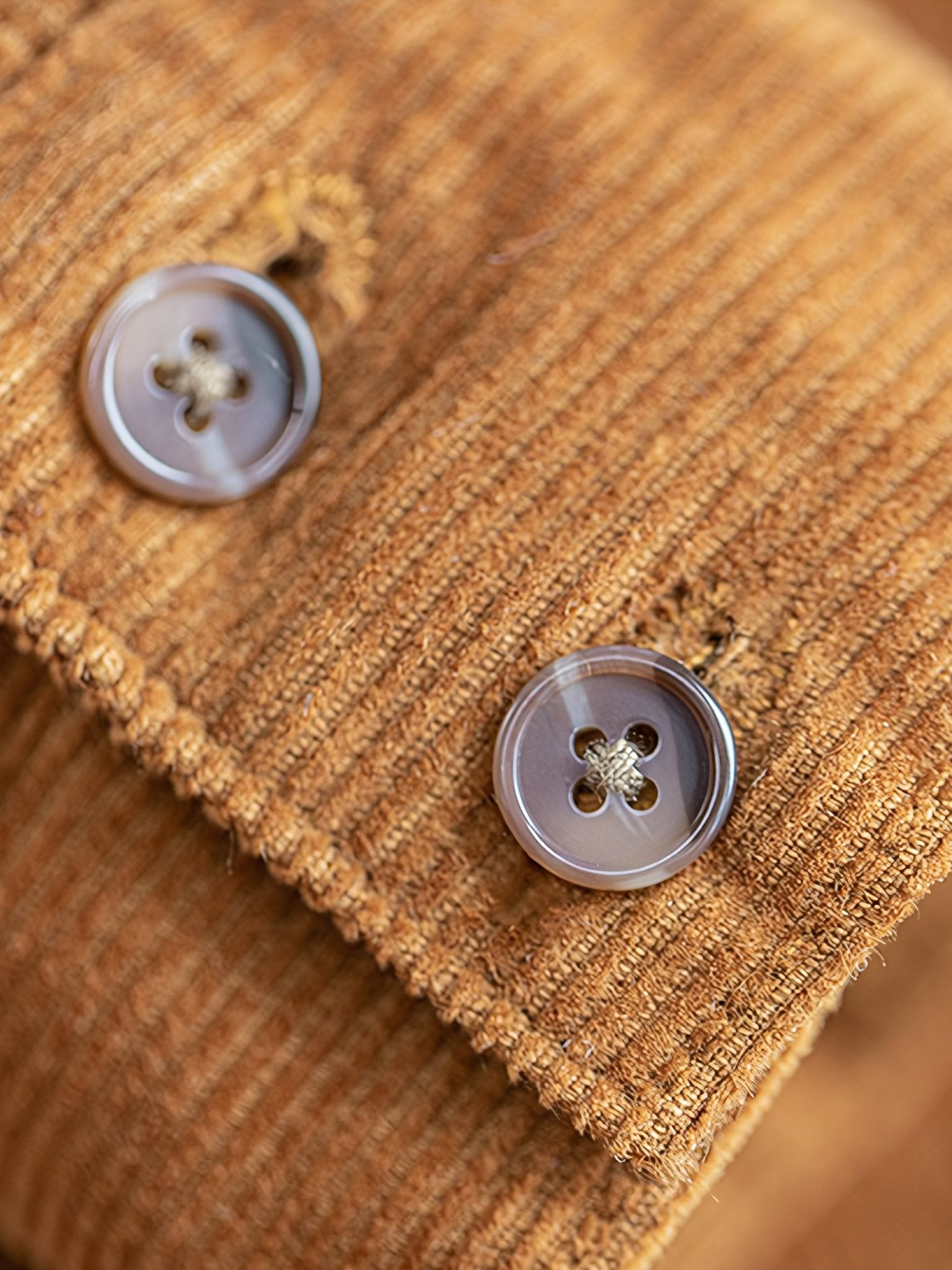 存在感のある太い畝が特徴で、柔らかな手触りの表面にわずかな光沢があり、上品な風合いを演出しています。こまた、扱いやすい着丈は、セットアップのパンツはもちろん、さまざまなボトムスとの多彩なコーディネートに対応しています。