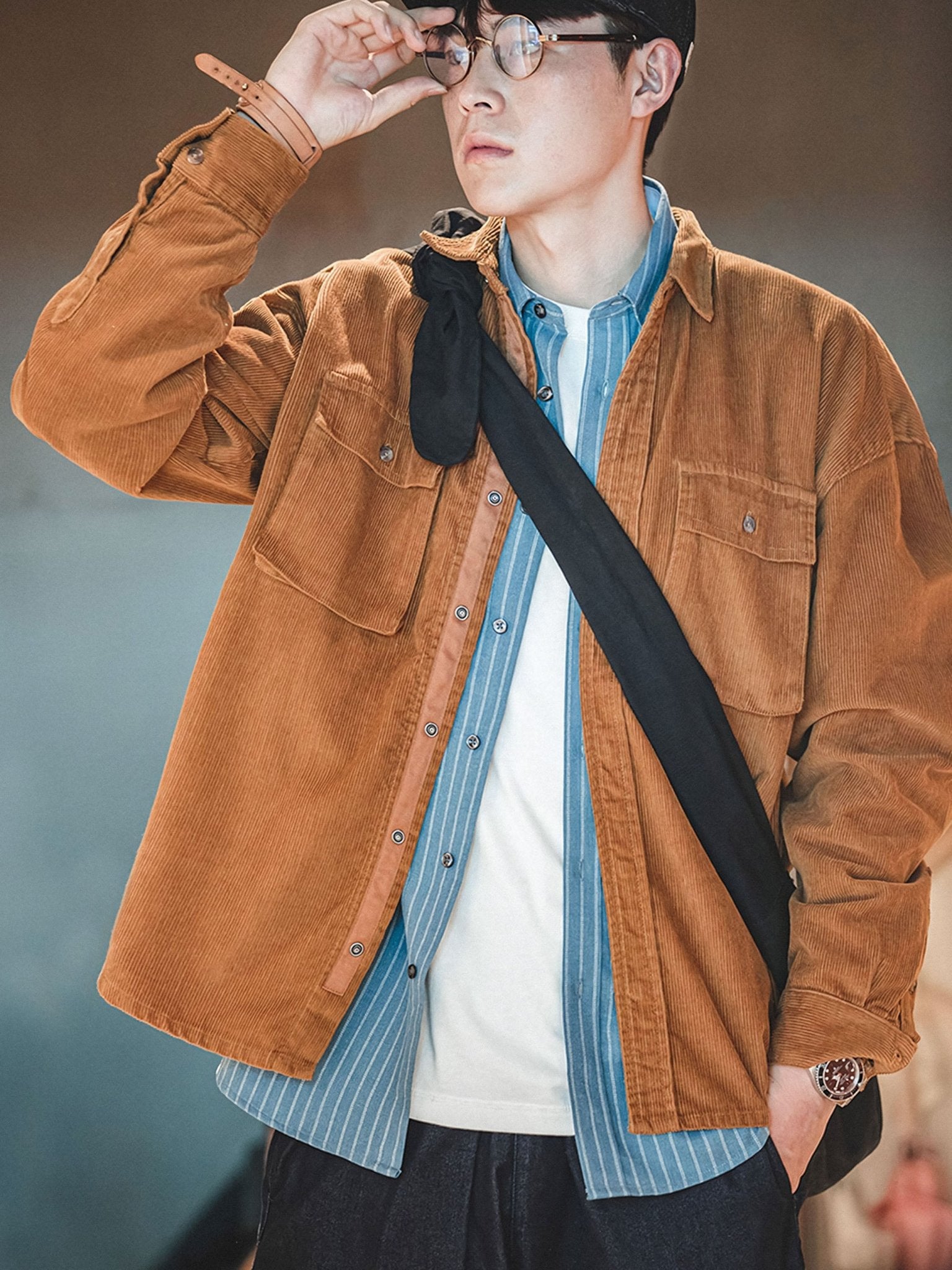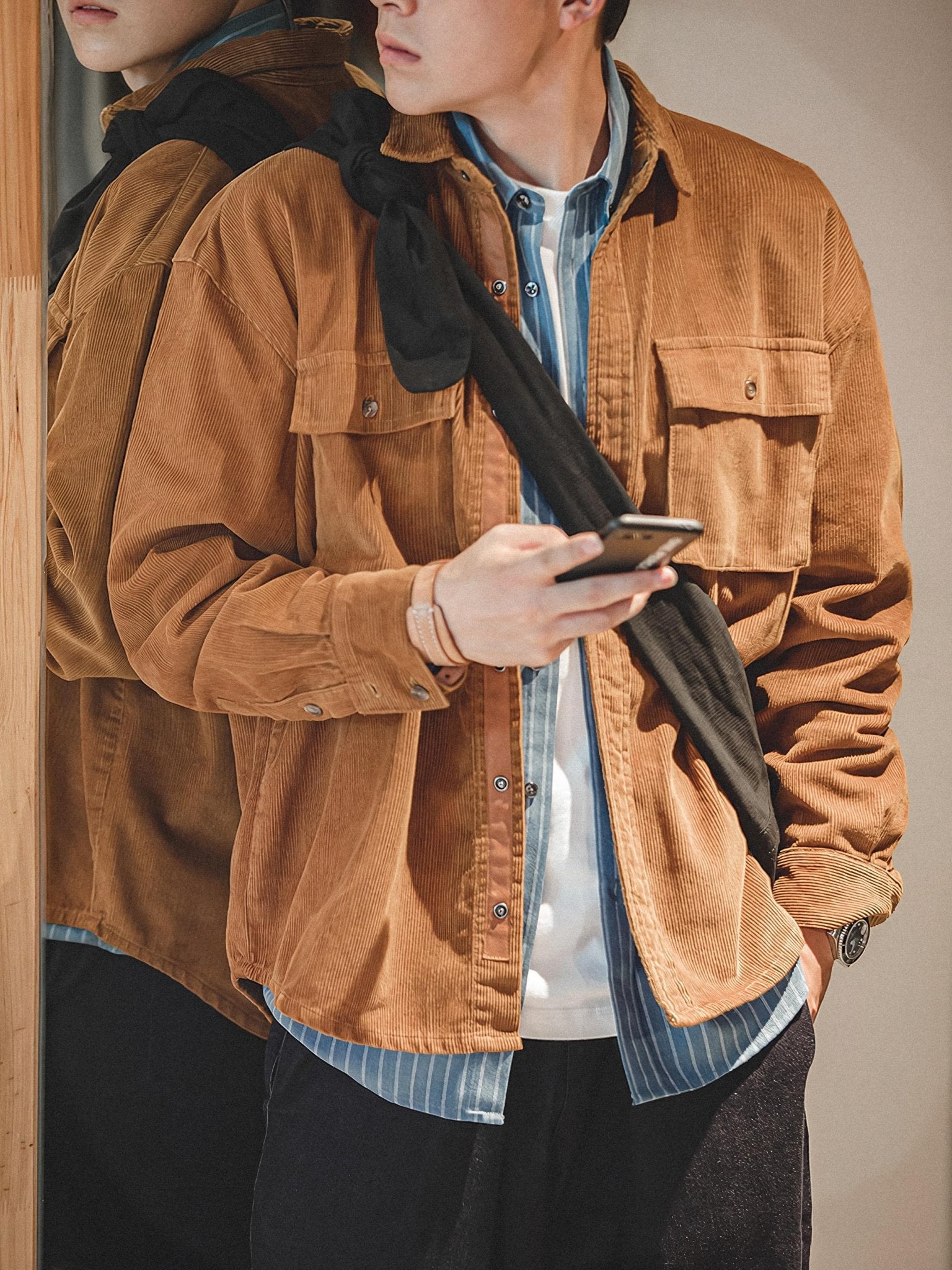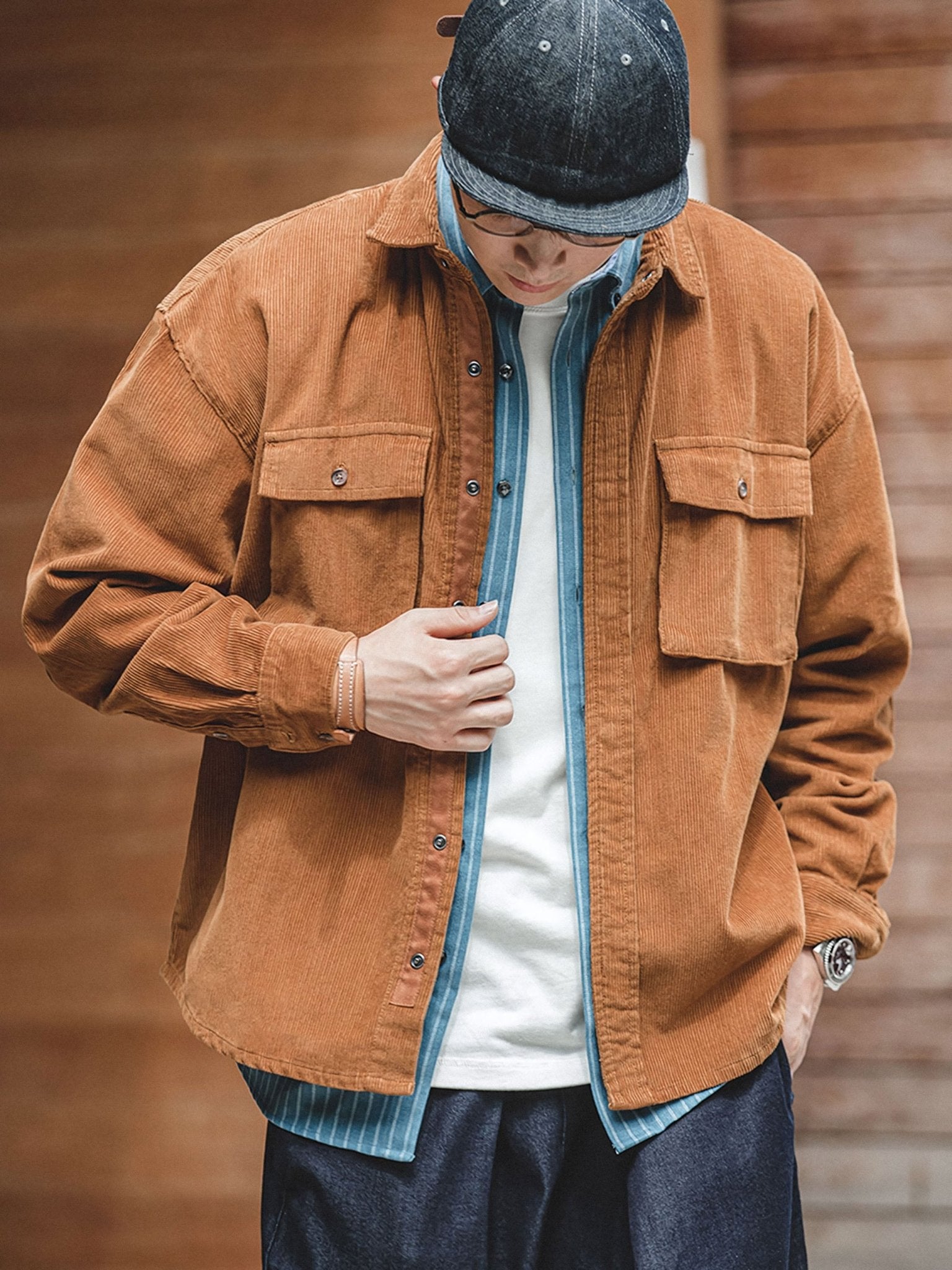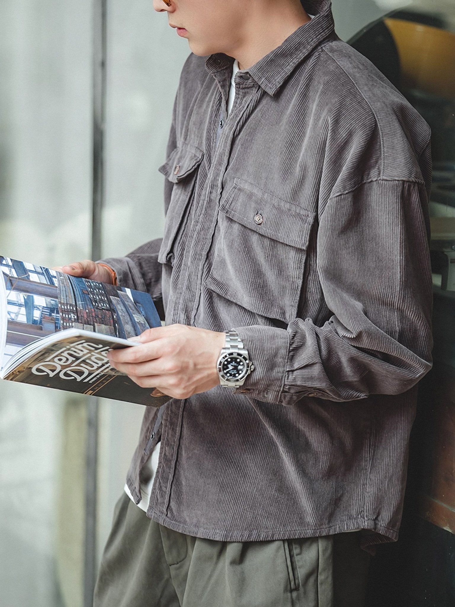 存在感のある太い畝が特徴で、柔らかな手触りの表面にわずかな光沢があり、上品な風合いを演出しています。こまた、扱いやすい着丈は、セットアップのパンツはもちろん、さまざまなボトムスとの多彩なコーディネートに対応しています。