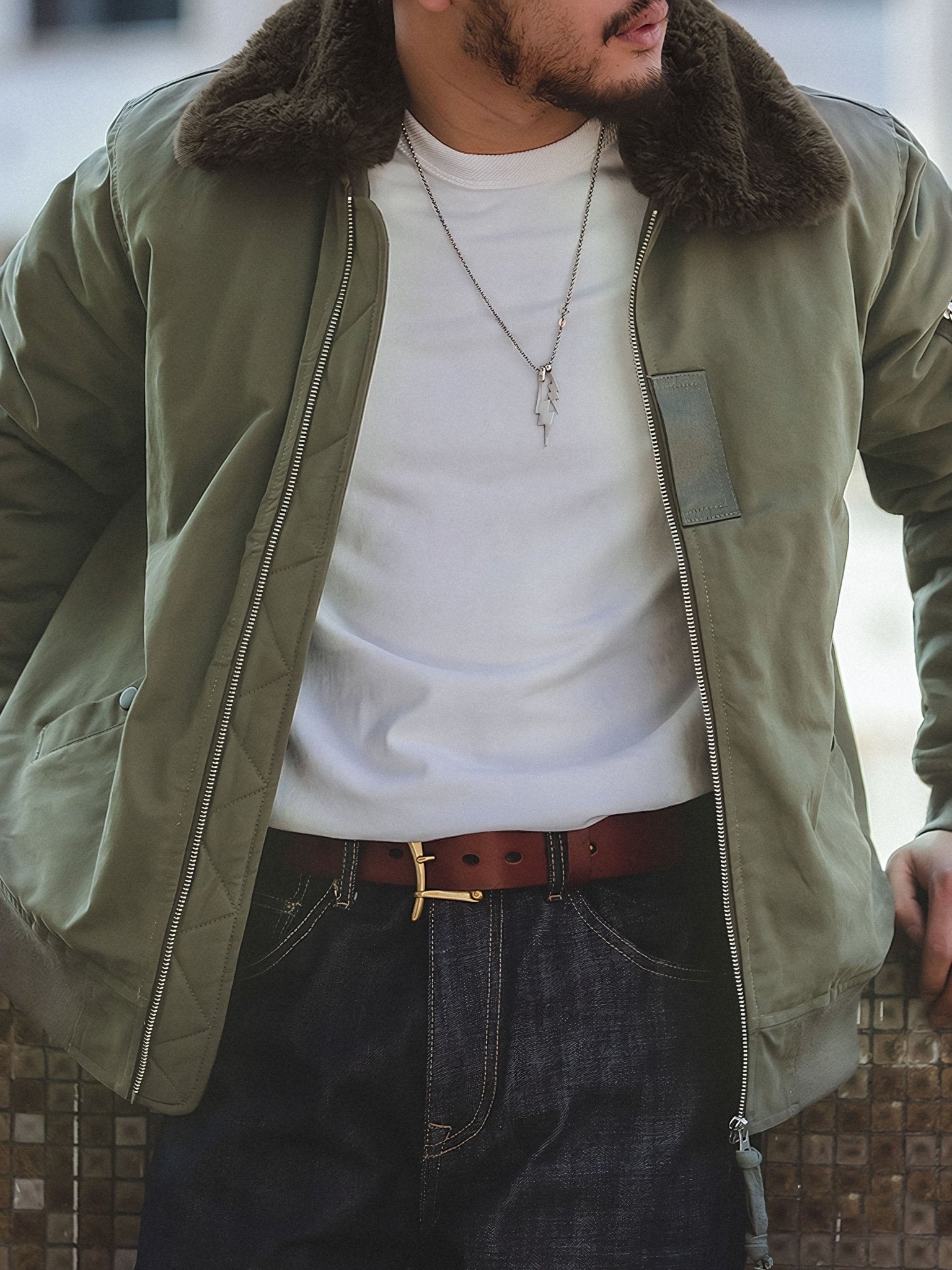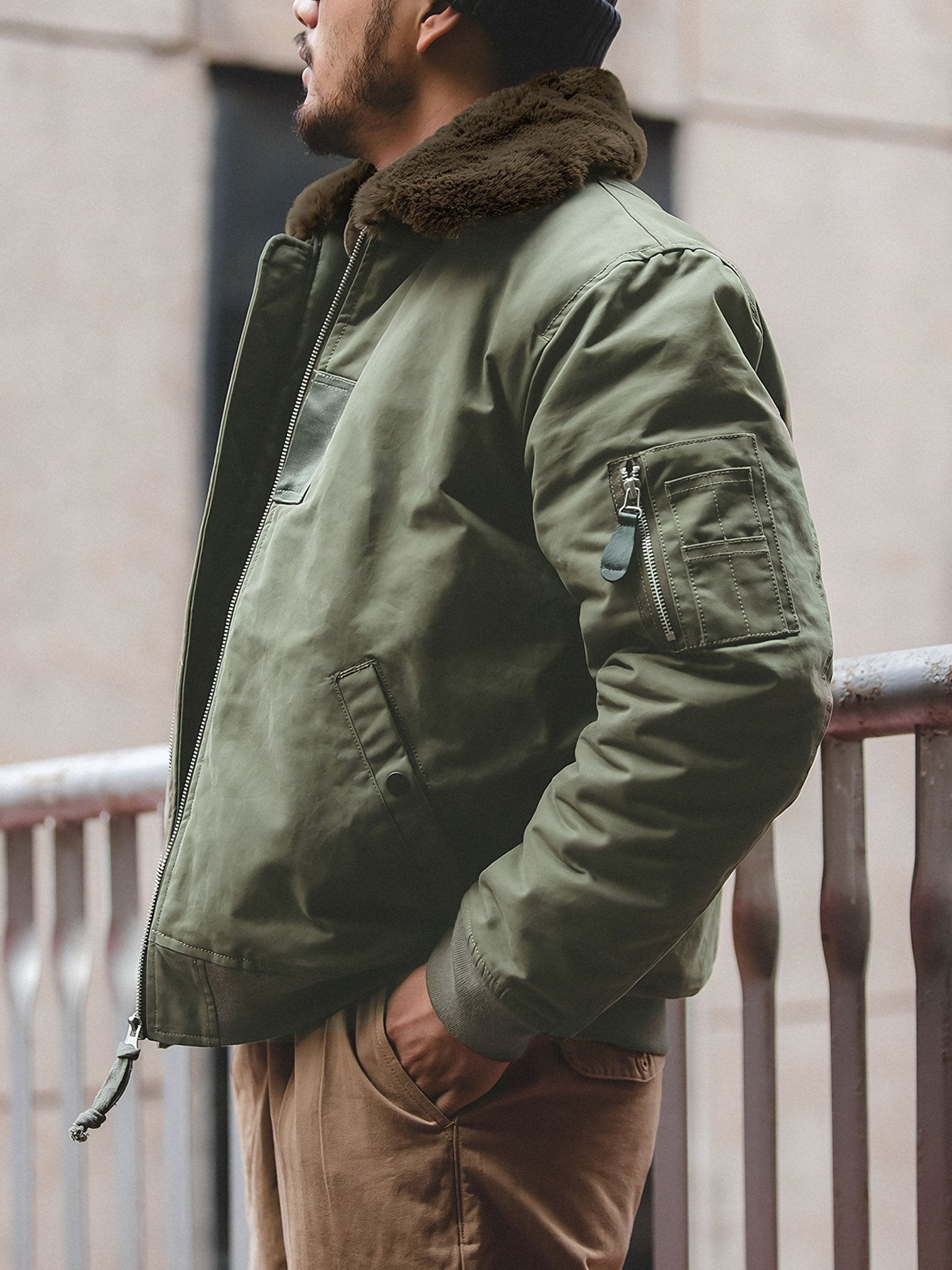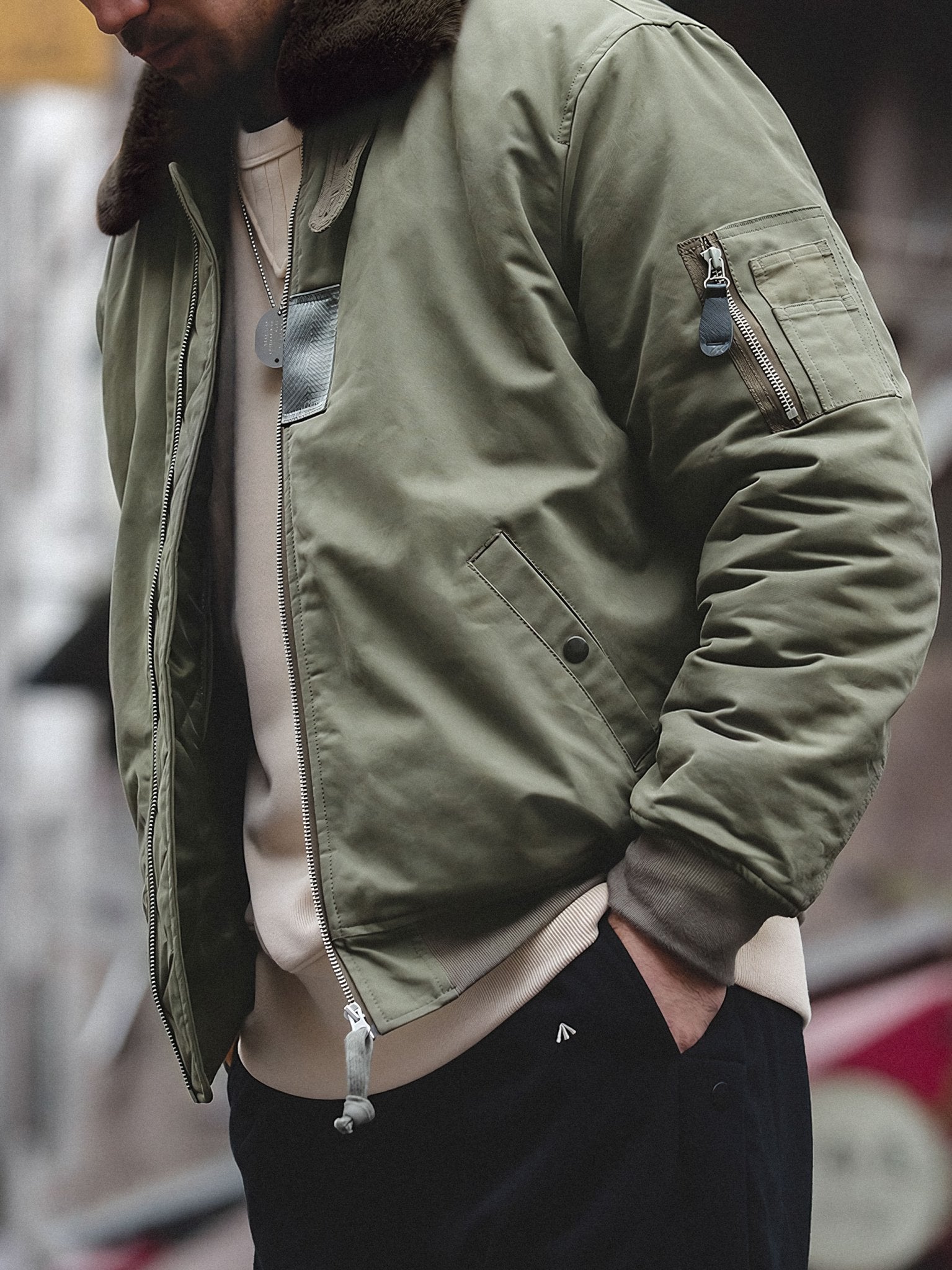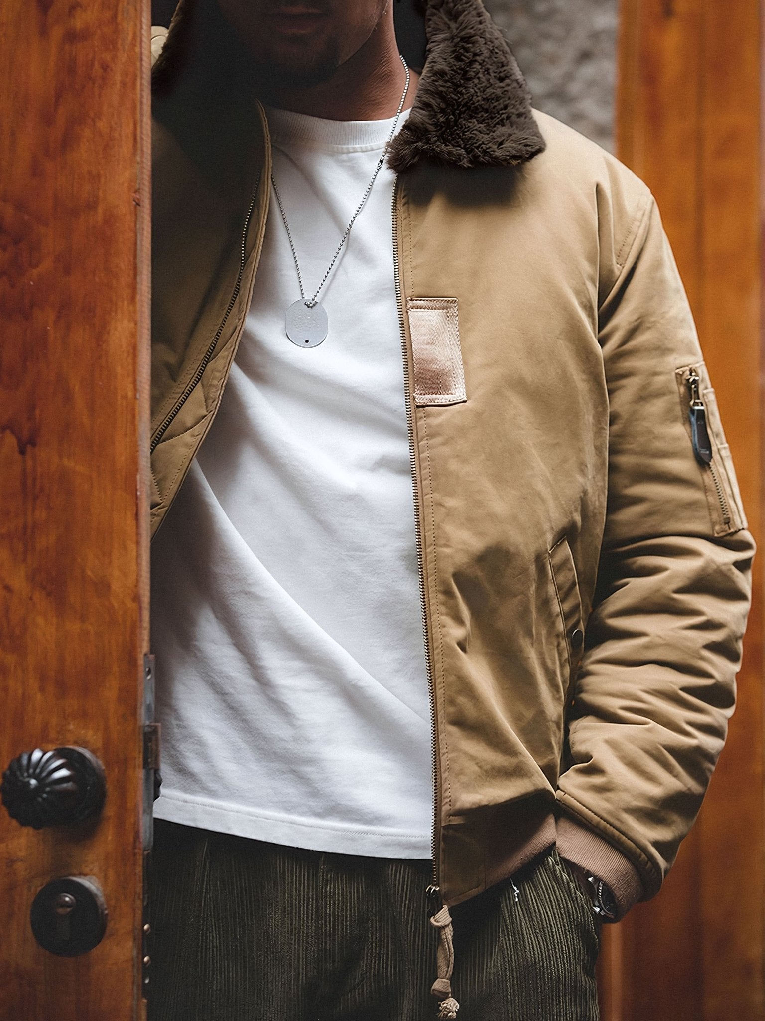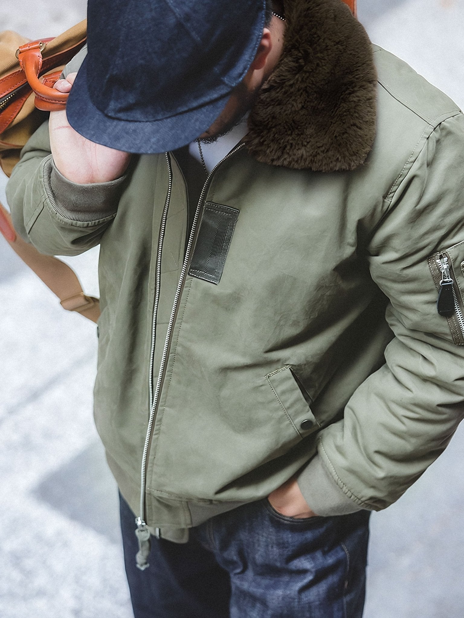 この一着はB-15Cを復刻し、スラッシュポケットや左袖のアームバッグ、そして特徴的なフリース襟を忠実に再現しています。袖と裾のリブの配置と短めの丈で、キリッとした洗練さと粗野な男らしさが兼ね備わった一着です。
