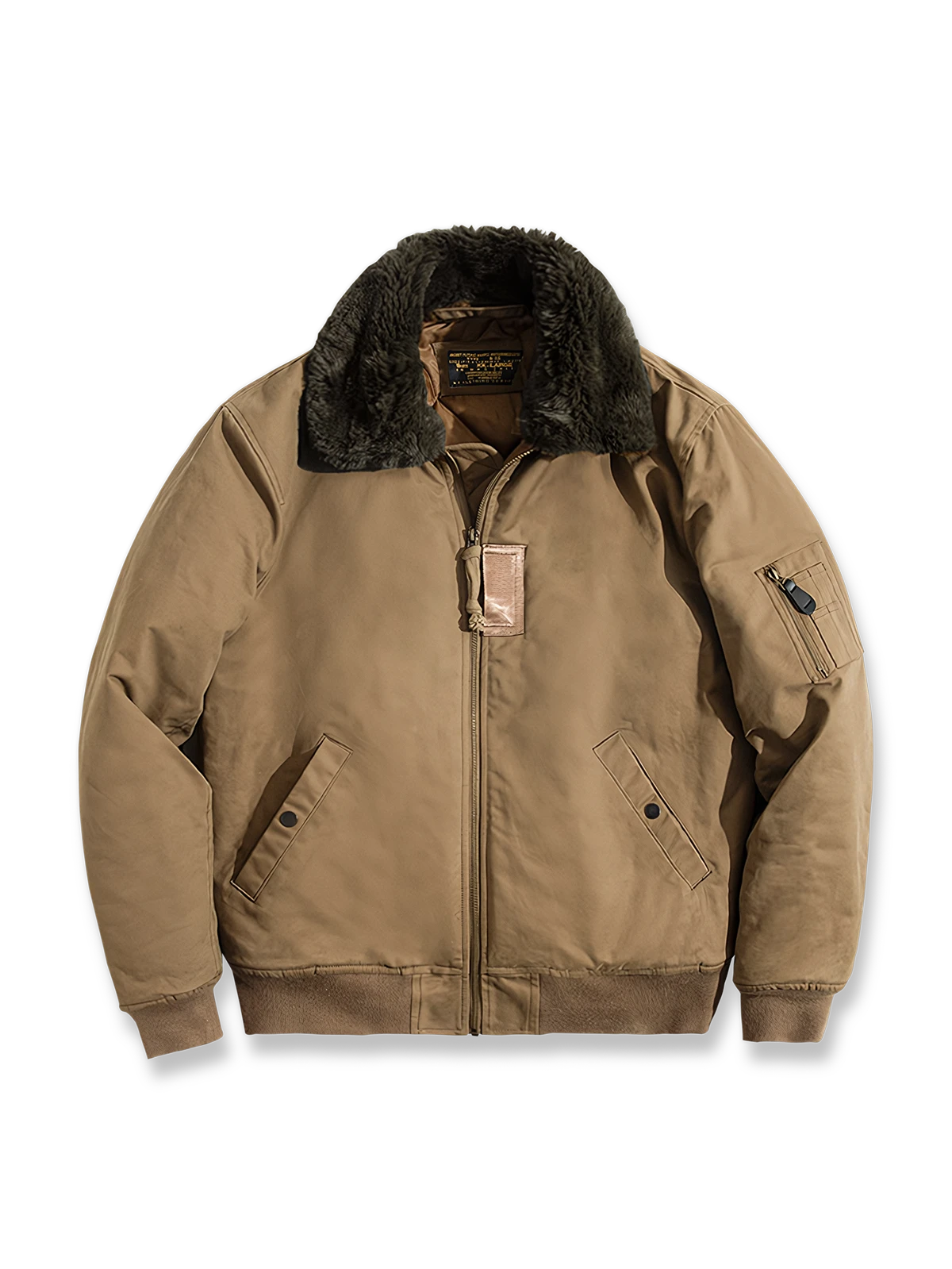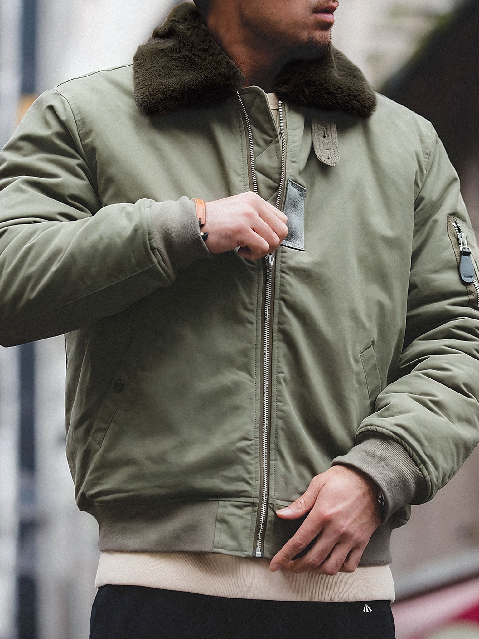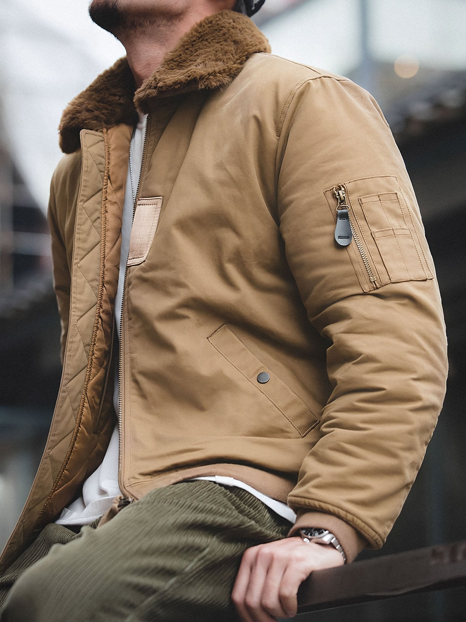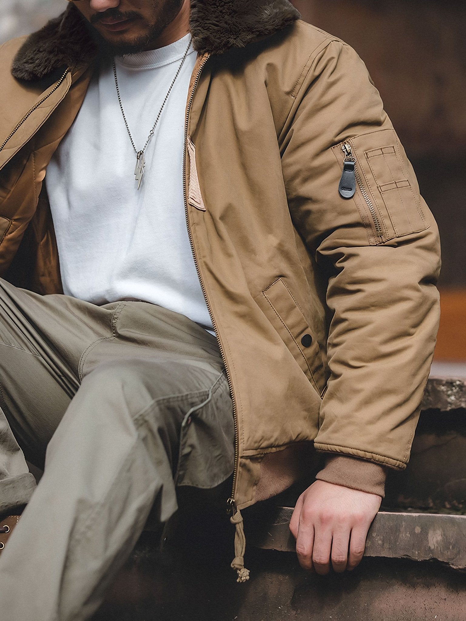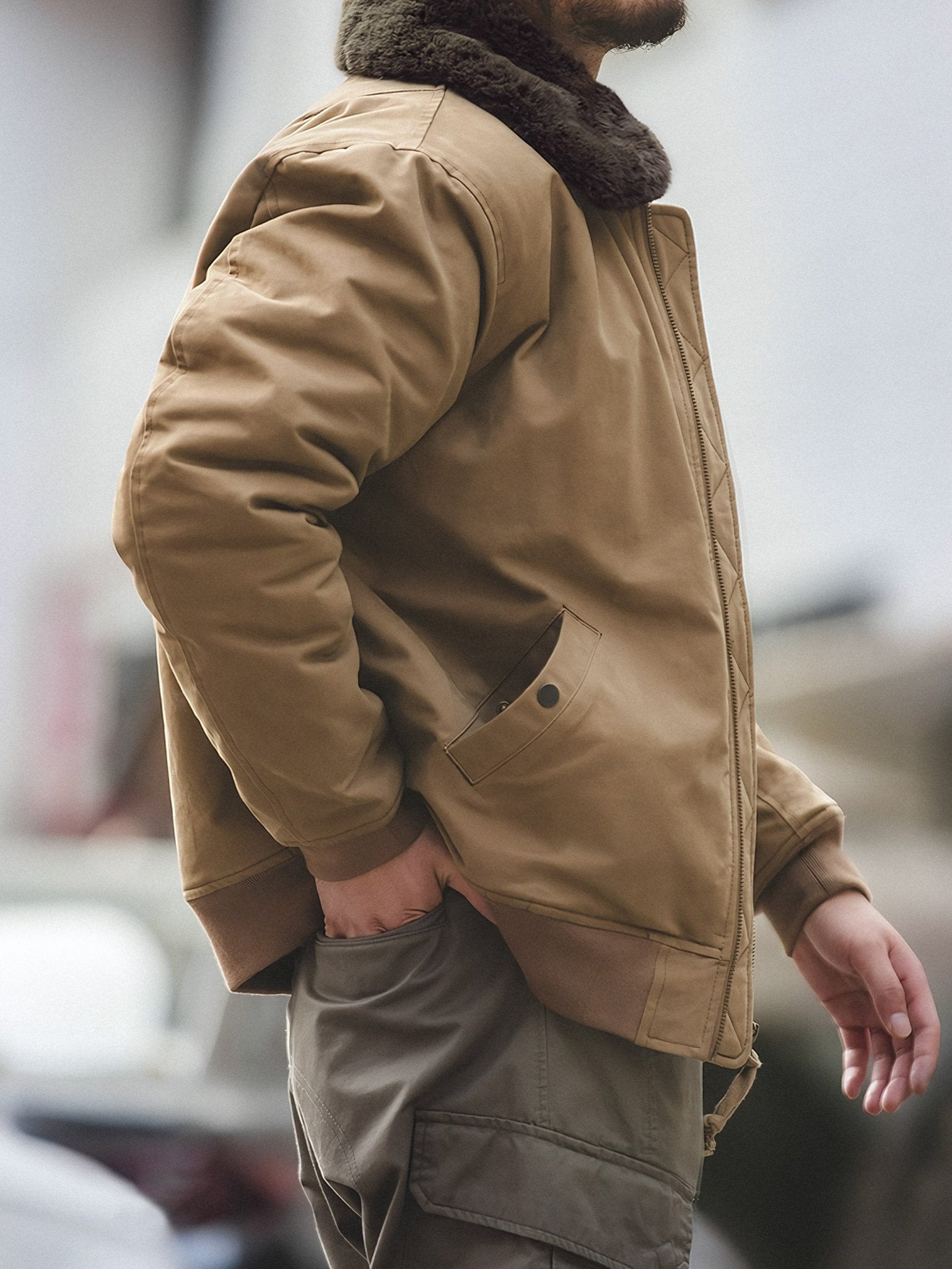 この一着はB-15Cを復刻し、スラッシュポケットや左袖のアームバッグ、そして特徴的なフリース襟を忠実に再現しています。袖と裾のリブの配置と短めの丈で、キリッとした洗練さと粗野な男らしさが兼ね備わった一着です。