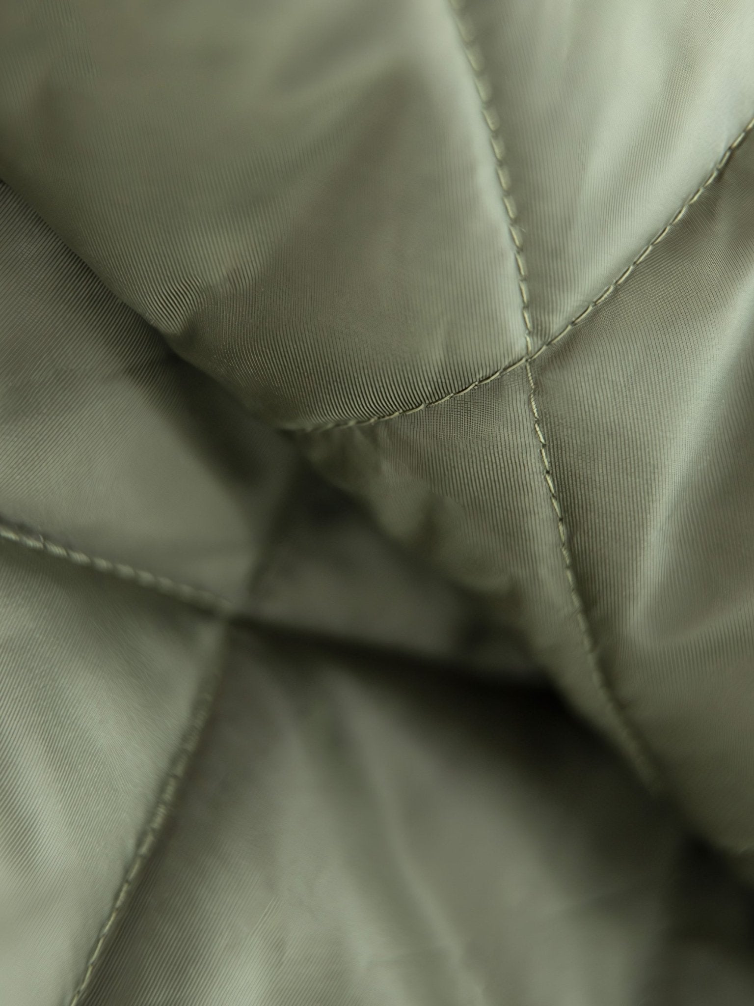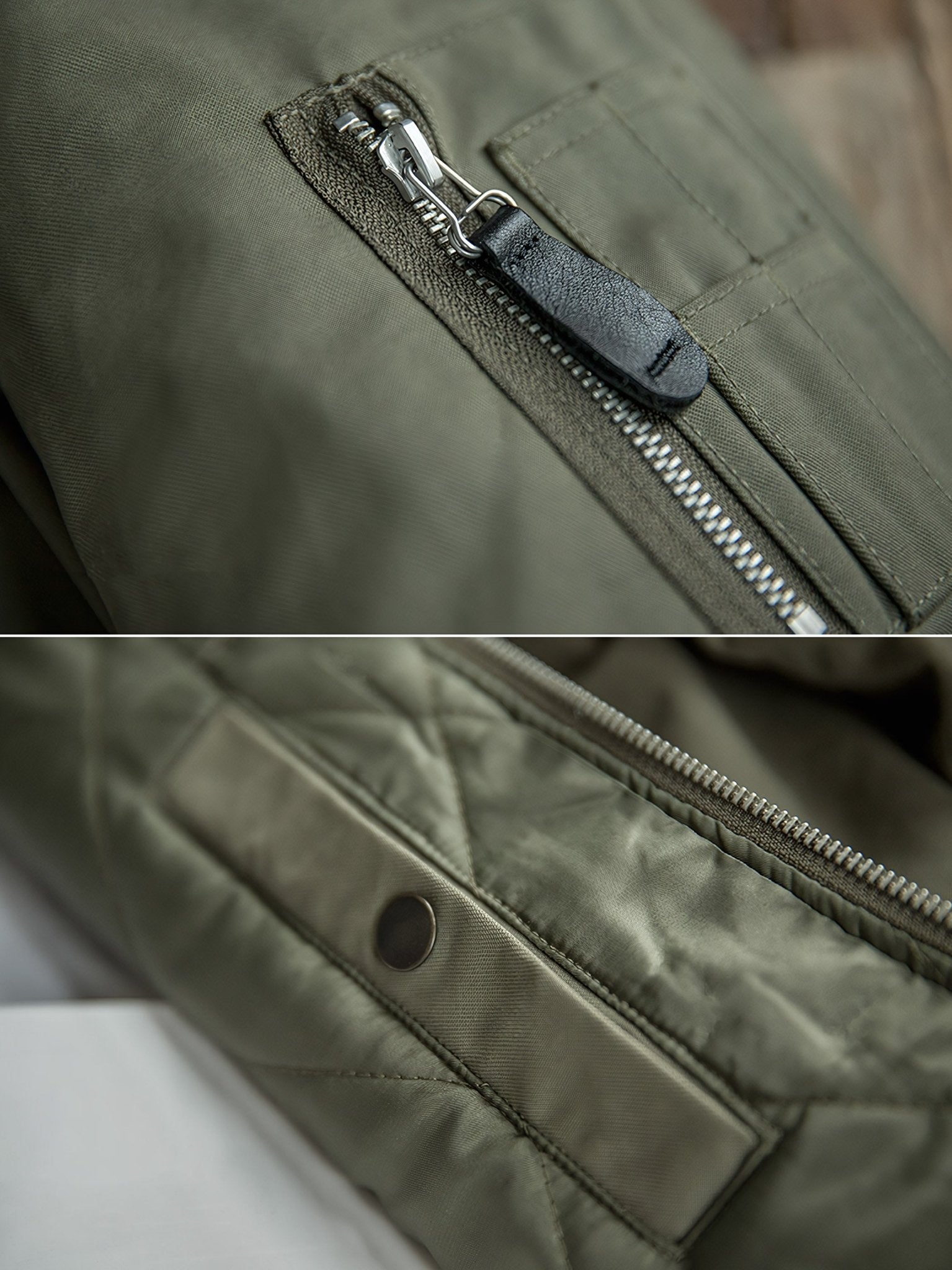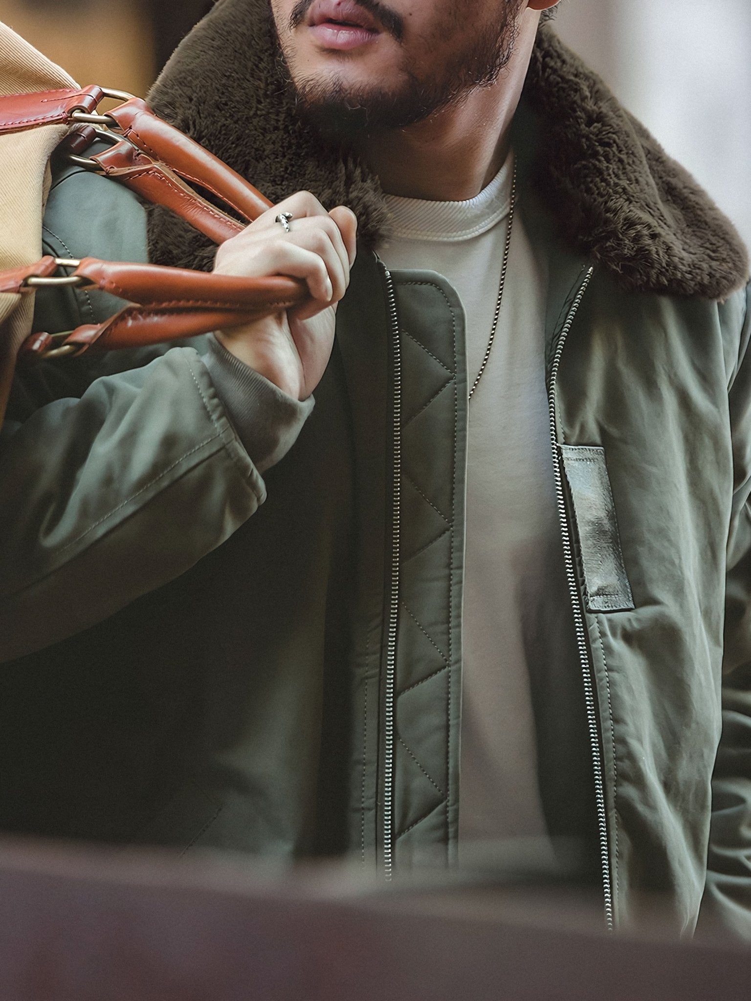 オリーブドラブのギャバジン生地にはアルパカウールのライニングが使用され、素材自体はB-10と同様です。保温性が優れつつ、冬のアクセントにもなります。さらに、内ポケットも備え、実用性も欠かしません。