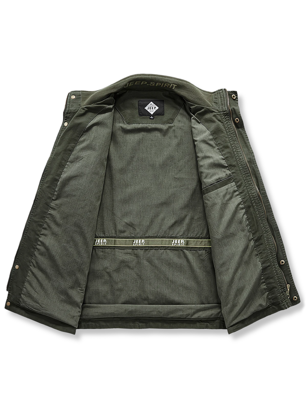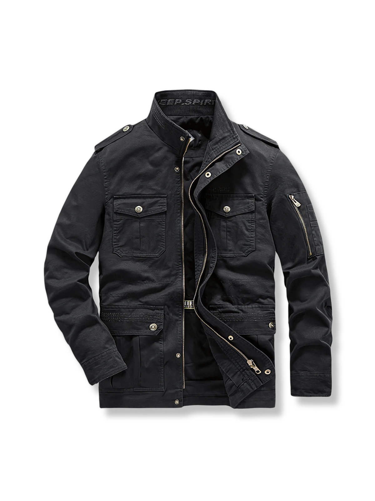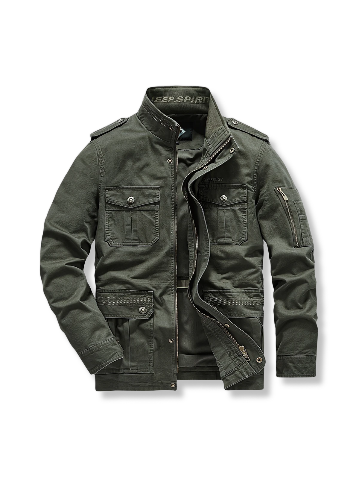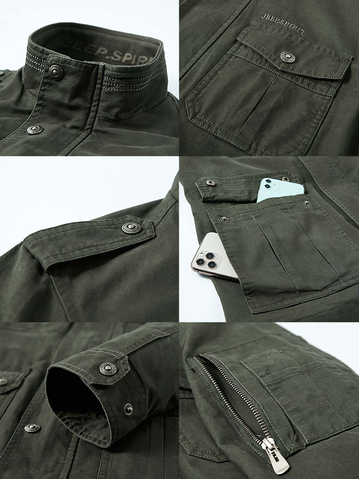 このミリタリータイプのジャケットは、おそらくクラシックなM-65軍用ジャケットの影響を受けたデザインであり、このジャケットは元々ベトナム戦争中にアメリカ軍向けに設計され、現地の多様な気候条件に適応するために作られました。多数のポケットデザインは、実用性を高めると同時に、軍服のスタイルの象徴的な要素でもあります。