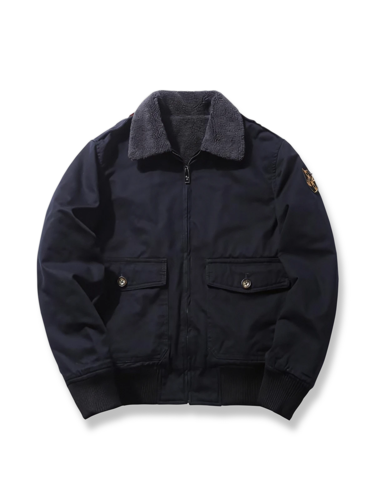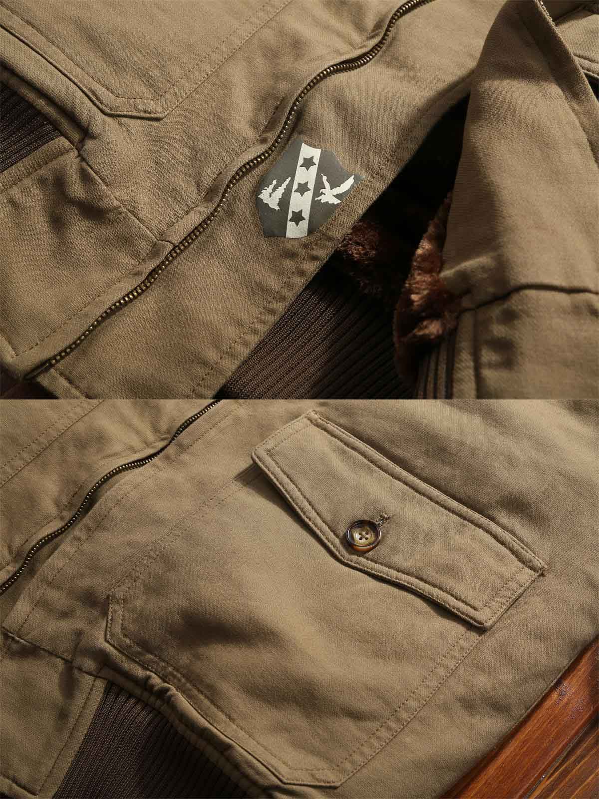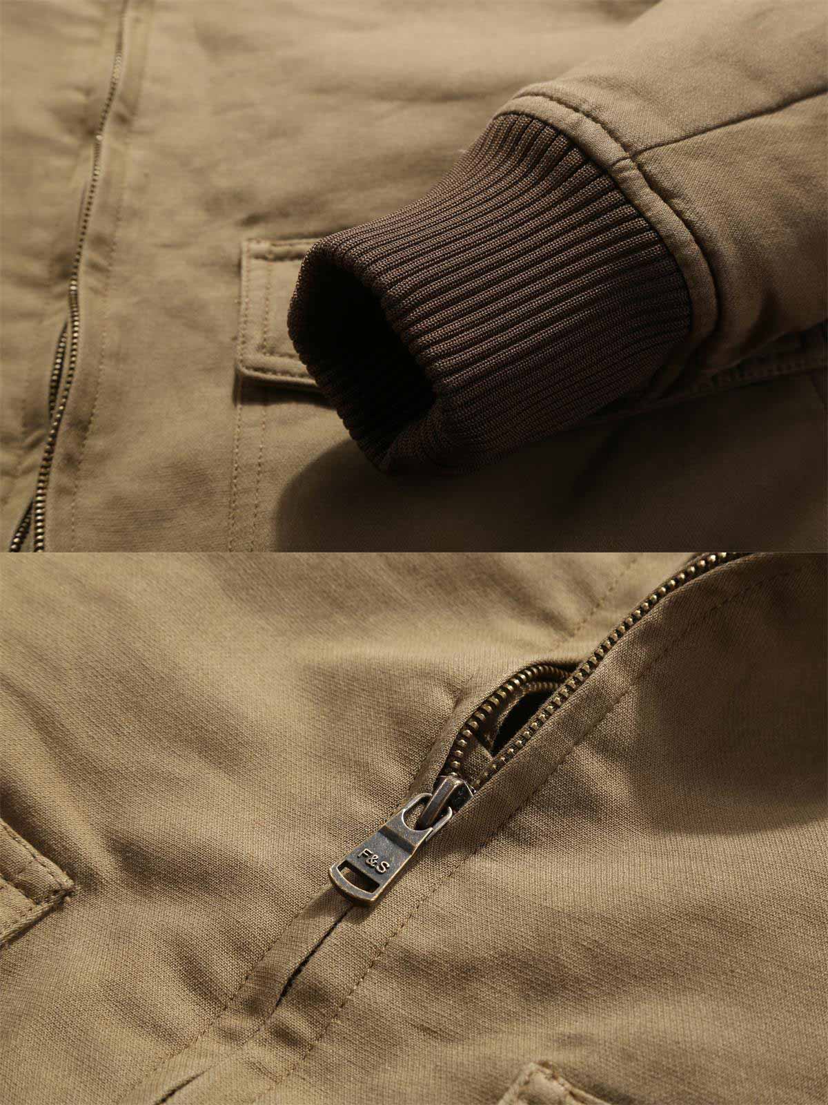 このジャケットは耐久性のあるコットン素材を使用し、製品の耐久性を高めています。裏起毛のラムフリースライニングが追加の保温性と快適さを提供しています。