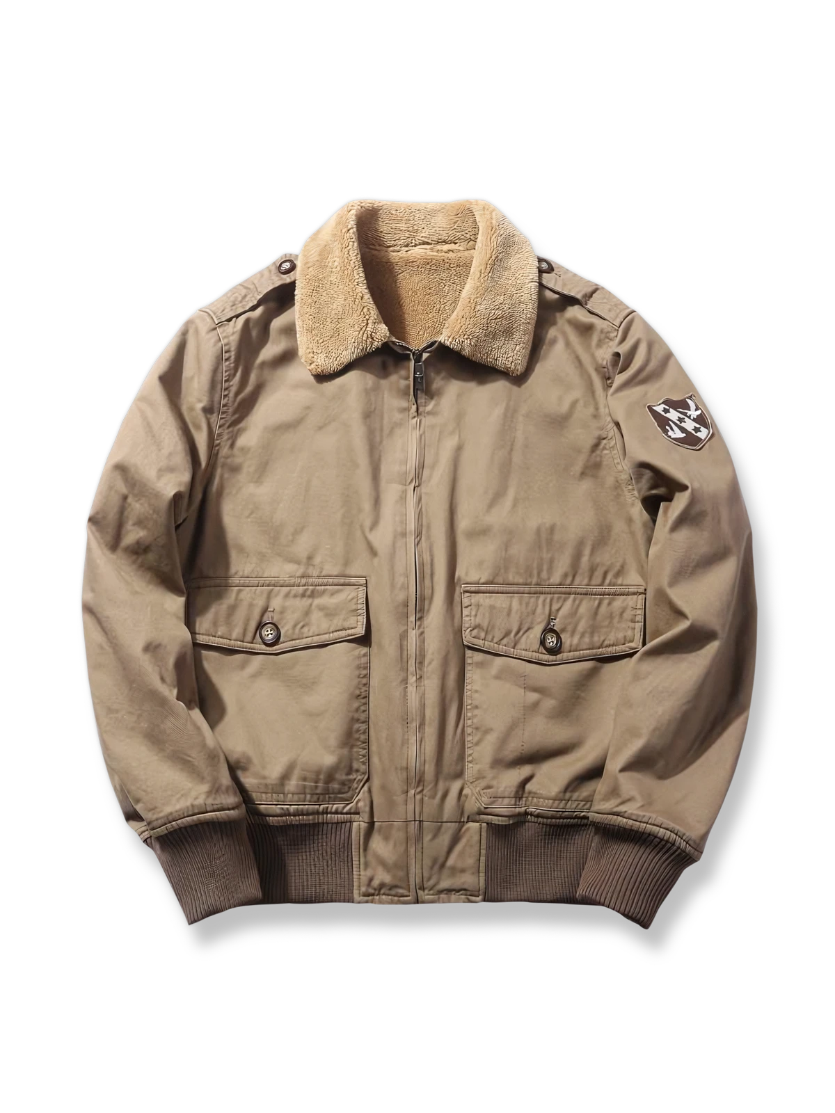 この裏起毛のラムフリースジャケットは、現代のカジュアルスタイルとヴィンテージミリタリー要素を融合しています。ジャケットのテーラリングとディテールは、タフなミリタリースタイルを反映しつつ、ラムフリースの襟がヴィンテージな温かさを加えています。パッチやボタンなどの装飾的なディテールは、デザインのユニークさを表現し、実用性も向上させています。袖口と裾のニット素材は耐久性を向上させ、全体のデザインと調和しています。