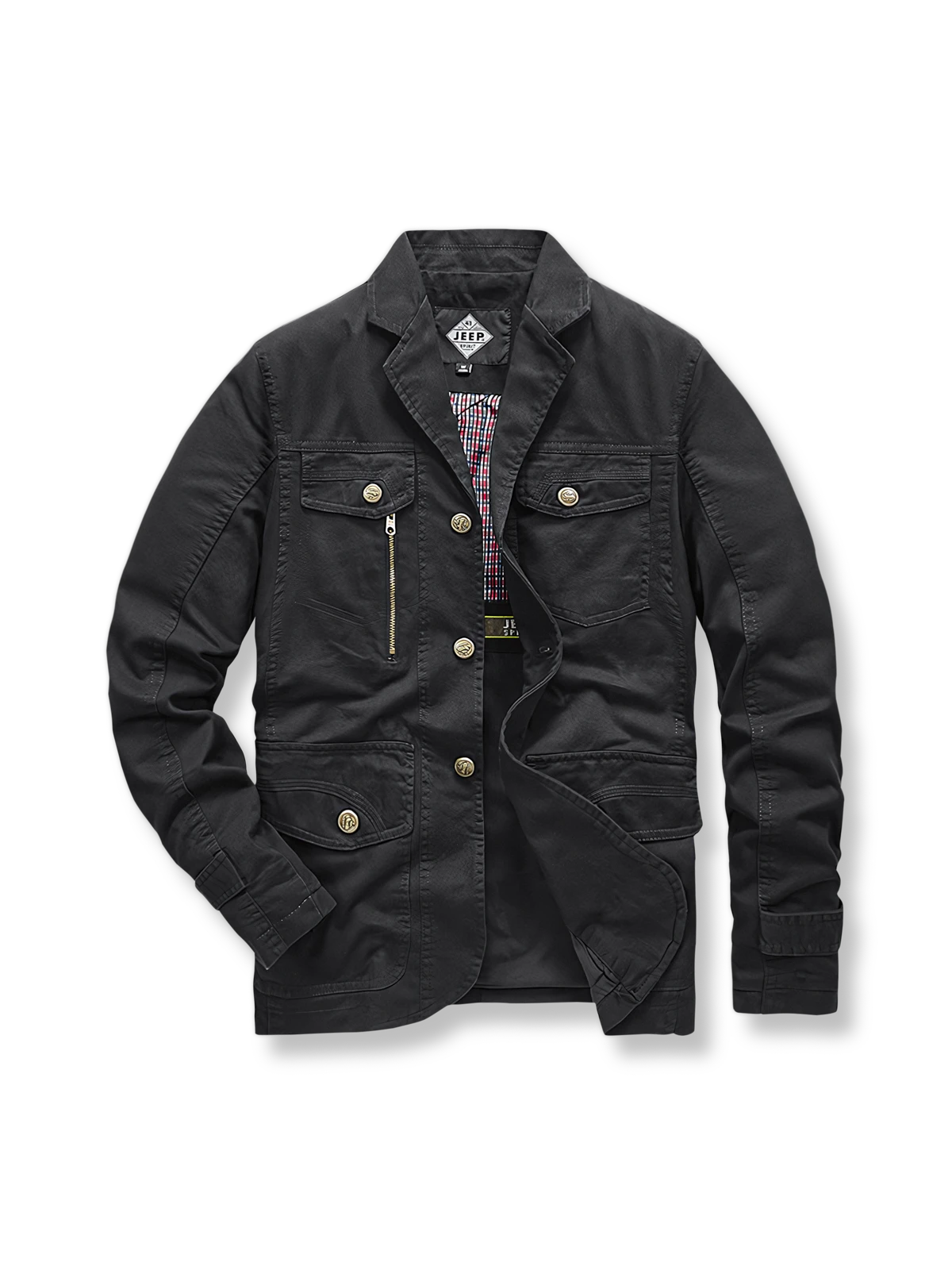 素材選びは耐久性とメンテナンスのしやすさを強調しています。多機能ポケットデザインは小物の持ち運びに便利であり、ジャケットの実用性を高めています。