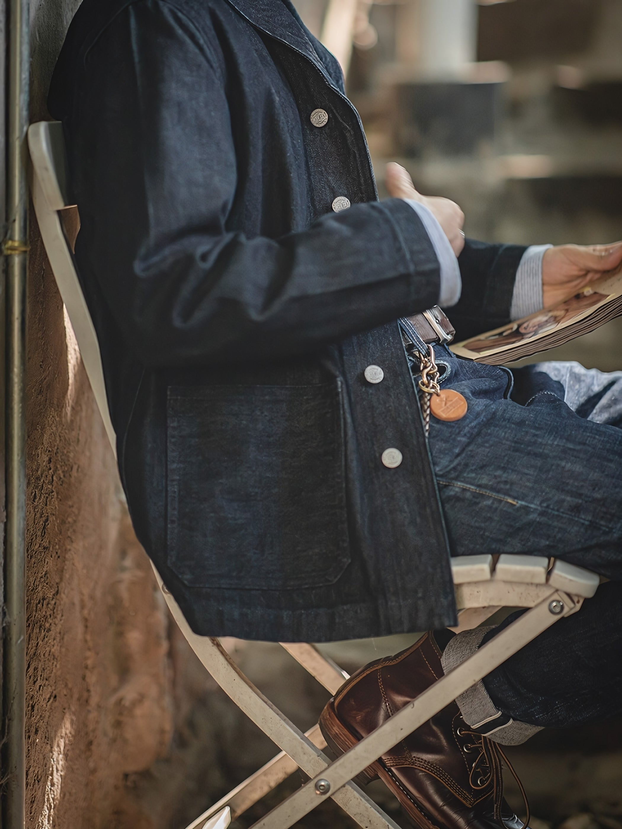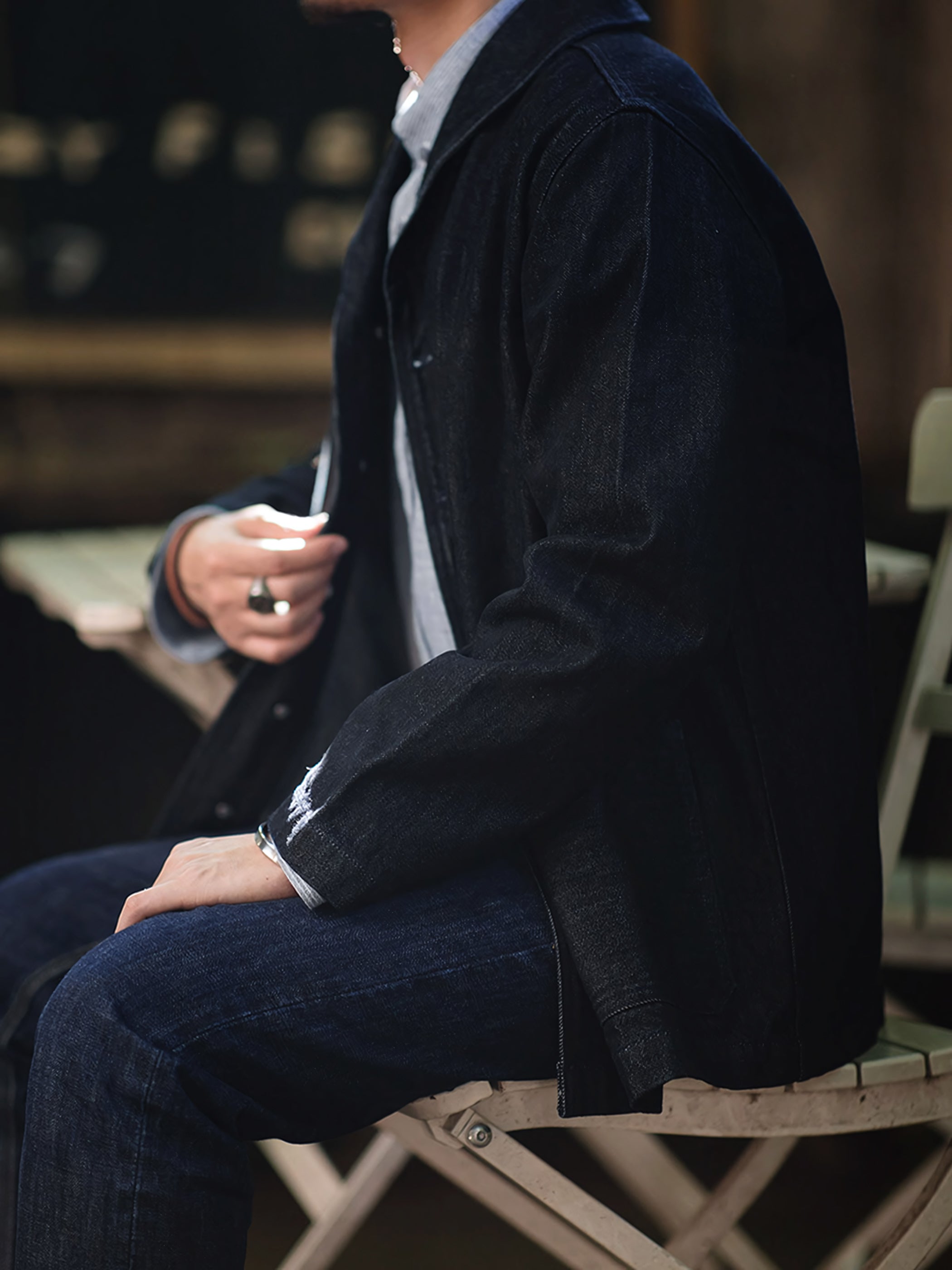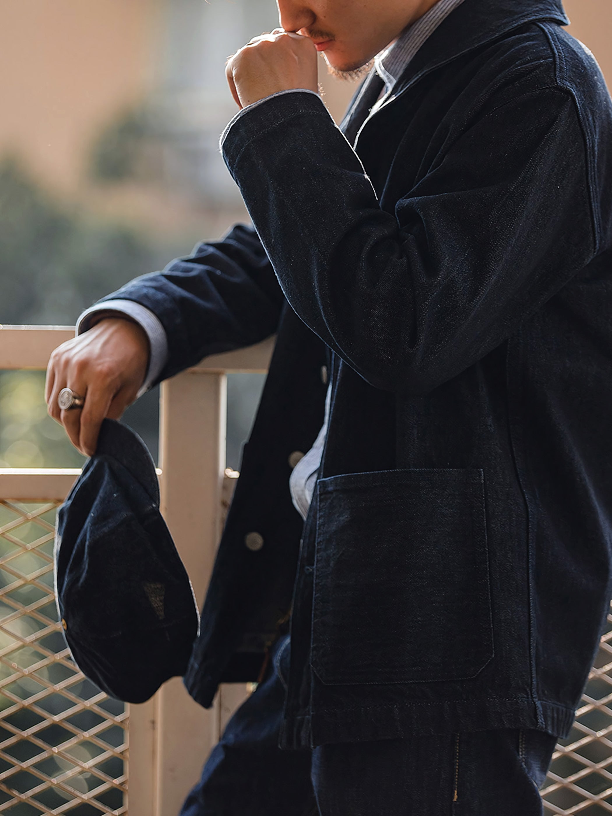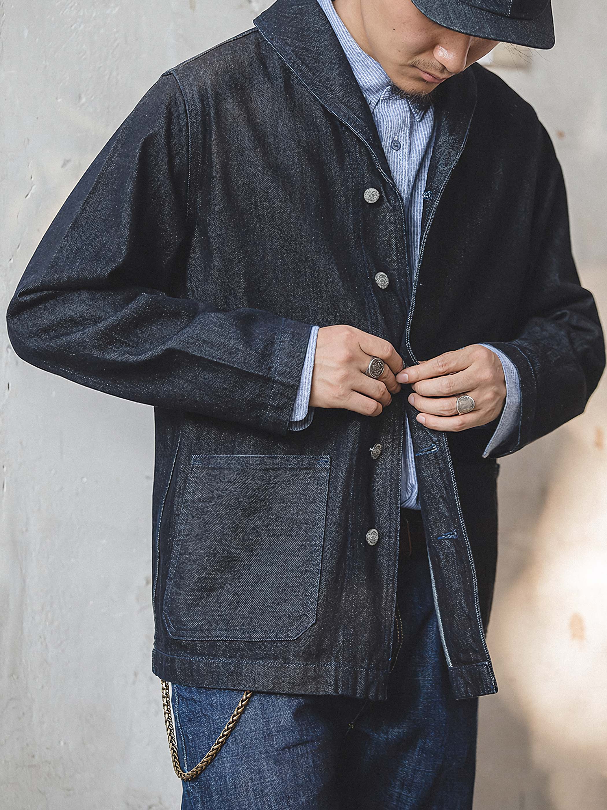 アメカジ・ワークスタイルの定番であるカバーオールを現代的に仕上げた13.5ozデニムジャケットです。現代の気分を味わえるシルエットに再構築し、大人のエレガントさを演出しています。ラッドなイメージを残しつつ、洗練された綺麗なラインが特徴的です。