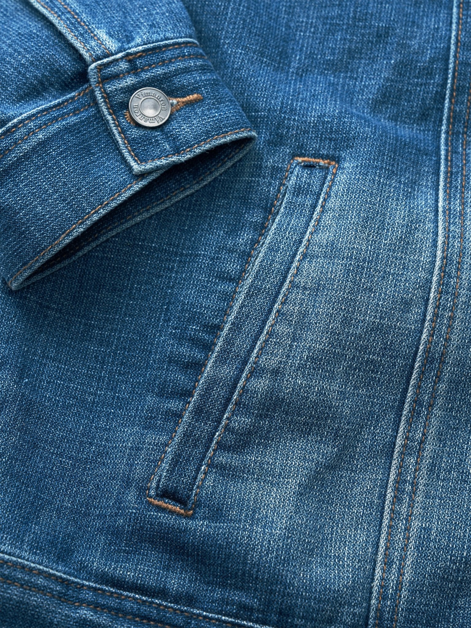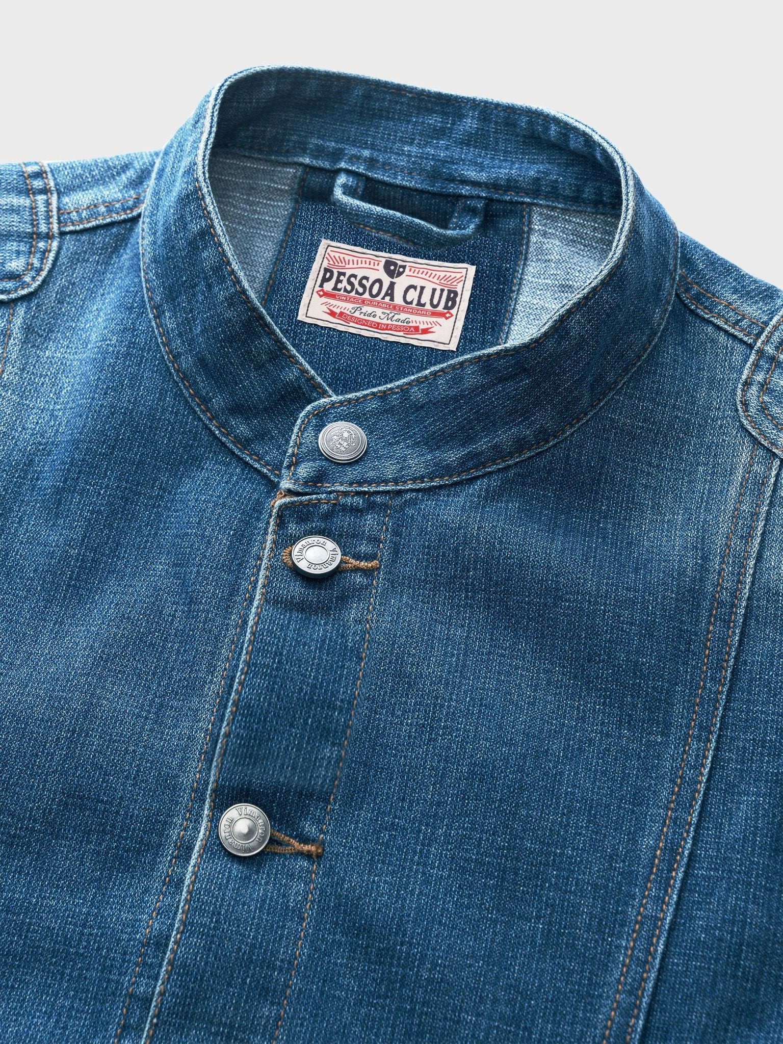 レトロなスタイルを採用しており、立ち襟のデザインが特徴的です。胸と背中に施された精密なステッチ装飾と、肩部に採用されたユニークなパッチワークデザインが、全体的な印象をファッショナブルで洗練されたものにしています。