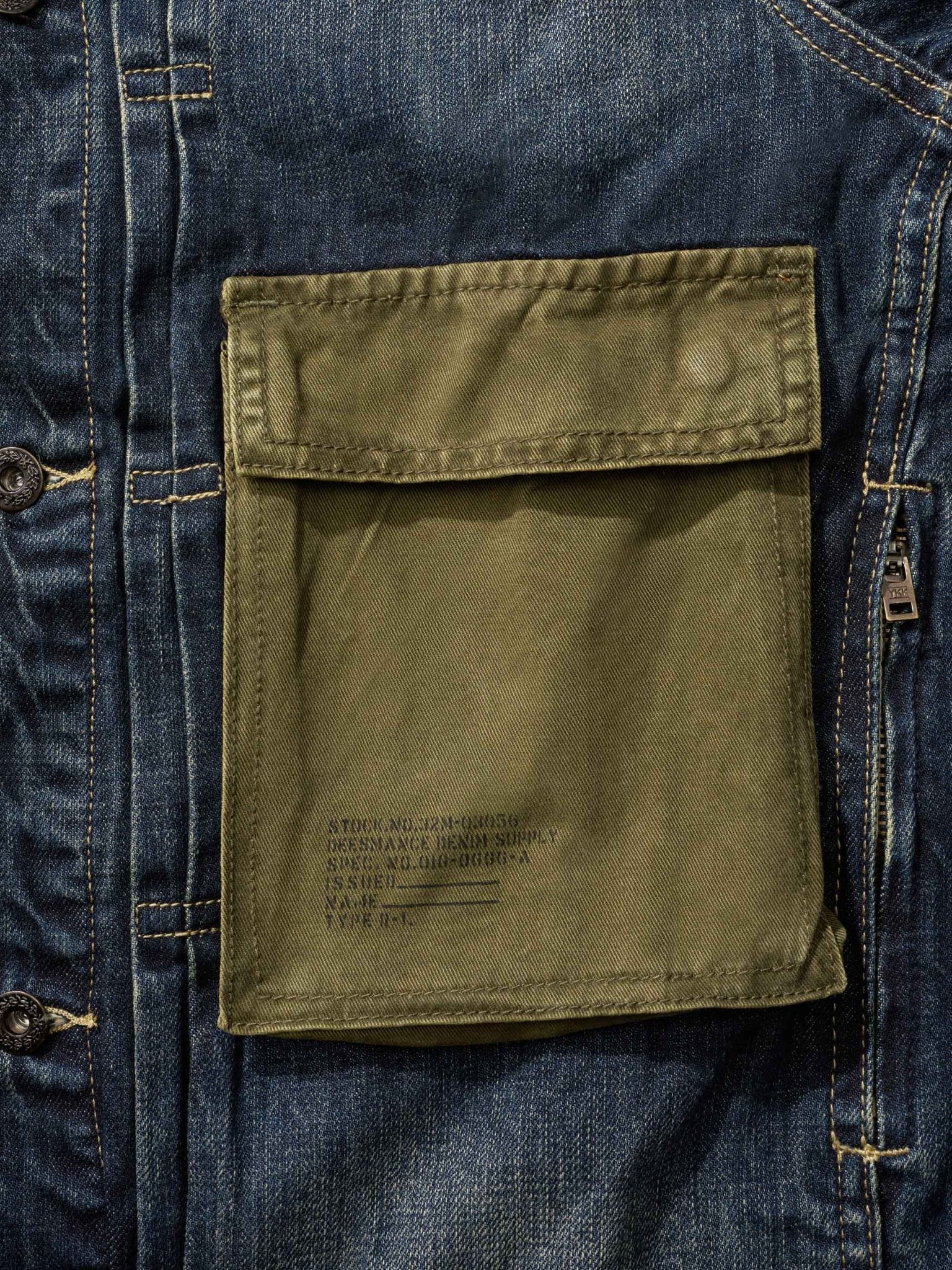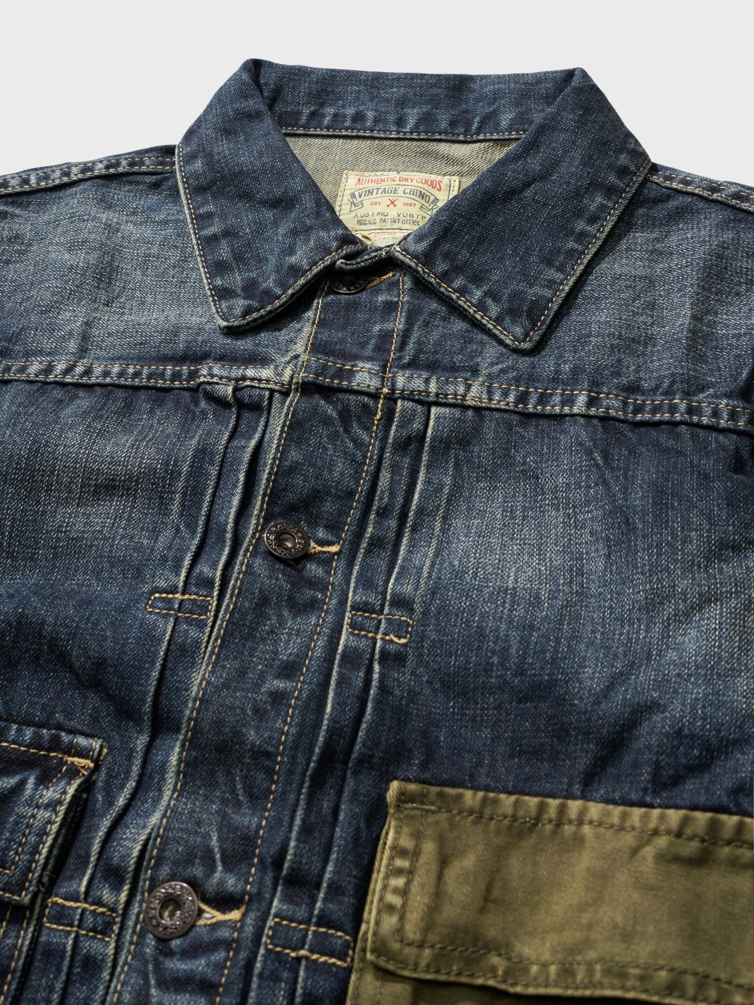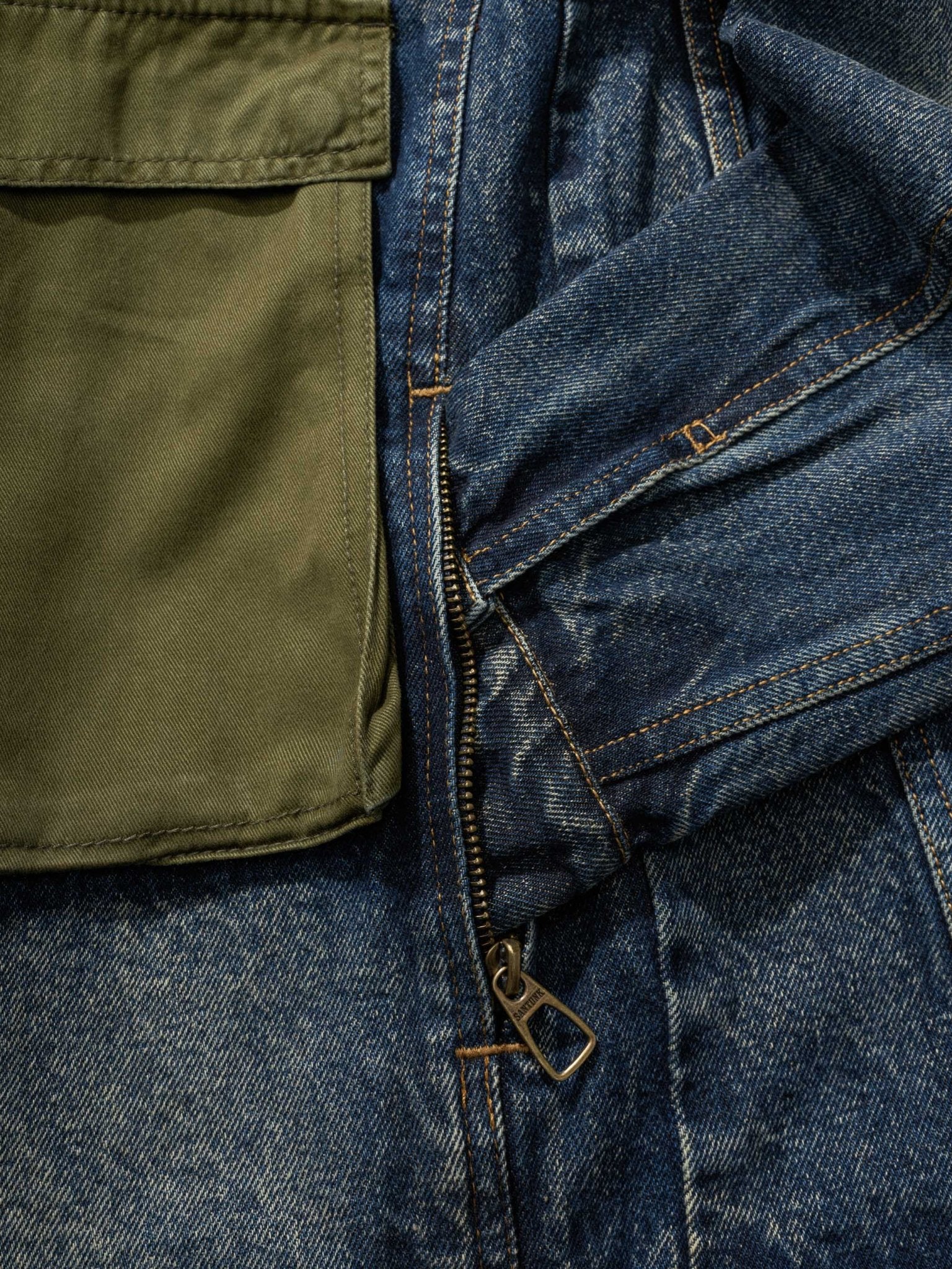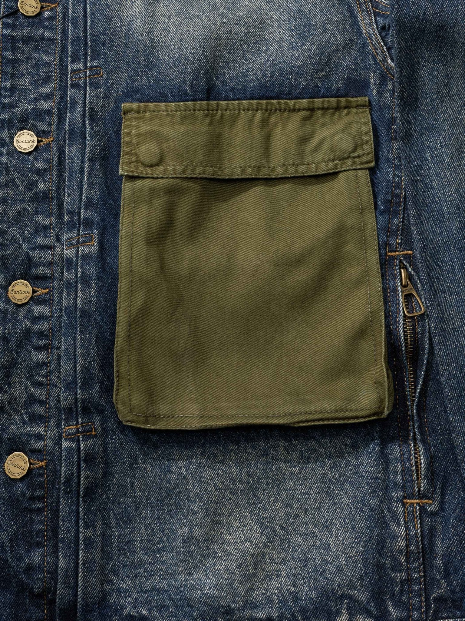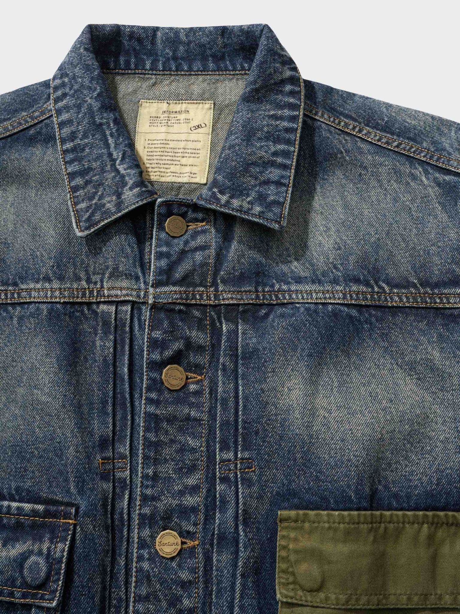 このデニムジャケットは、コントラストパッチワークのデザインを採用しており、特にポケットは異なる素材と色を使用しており、独特なコントラスト効果を演出しています。これにより、ジャケットにはファッション性とデザイン性が加わります。