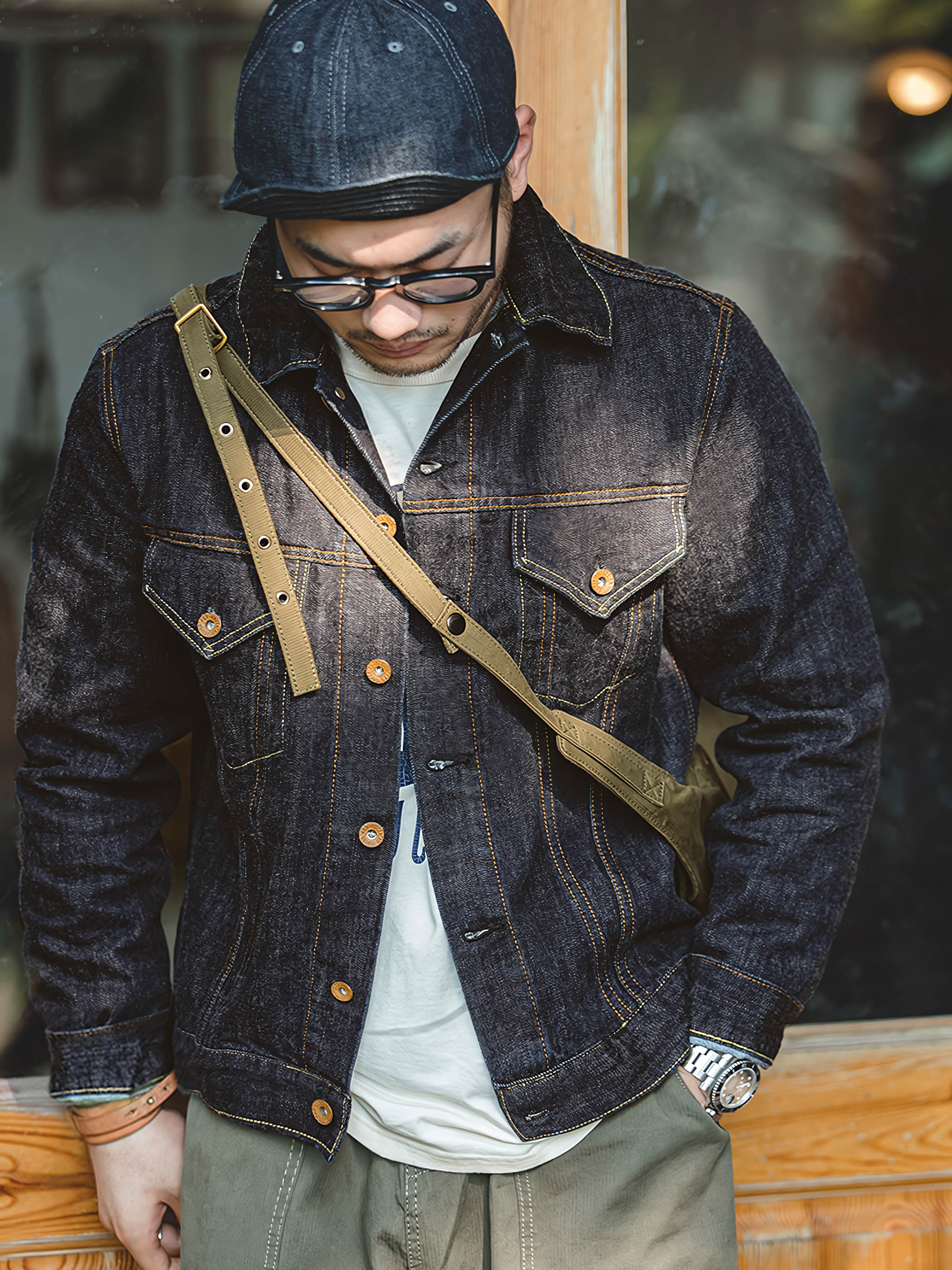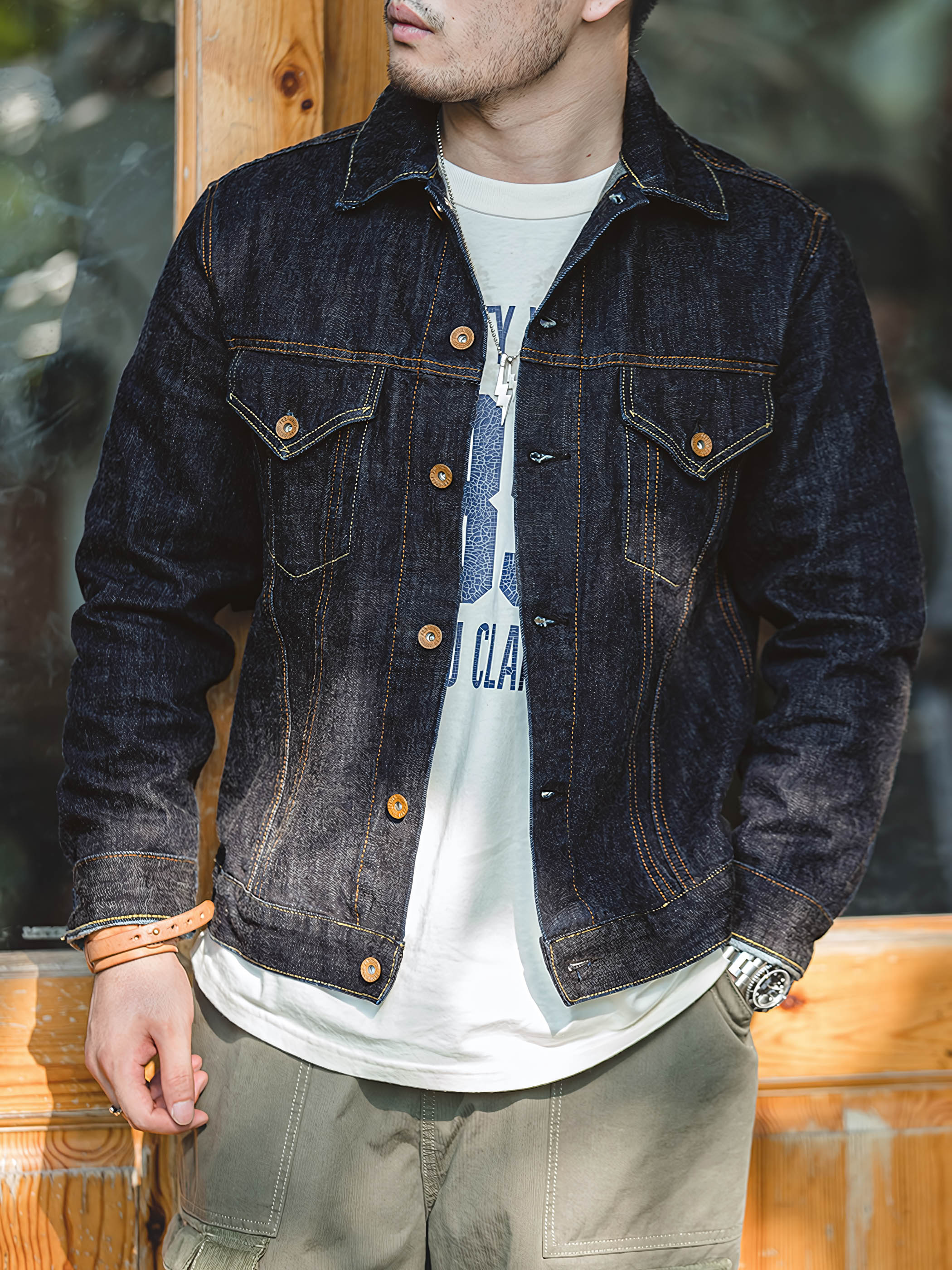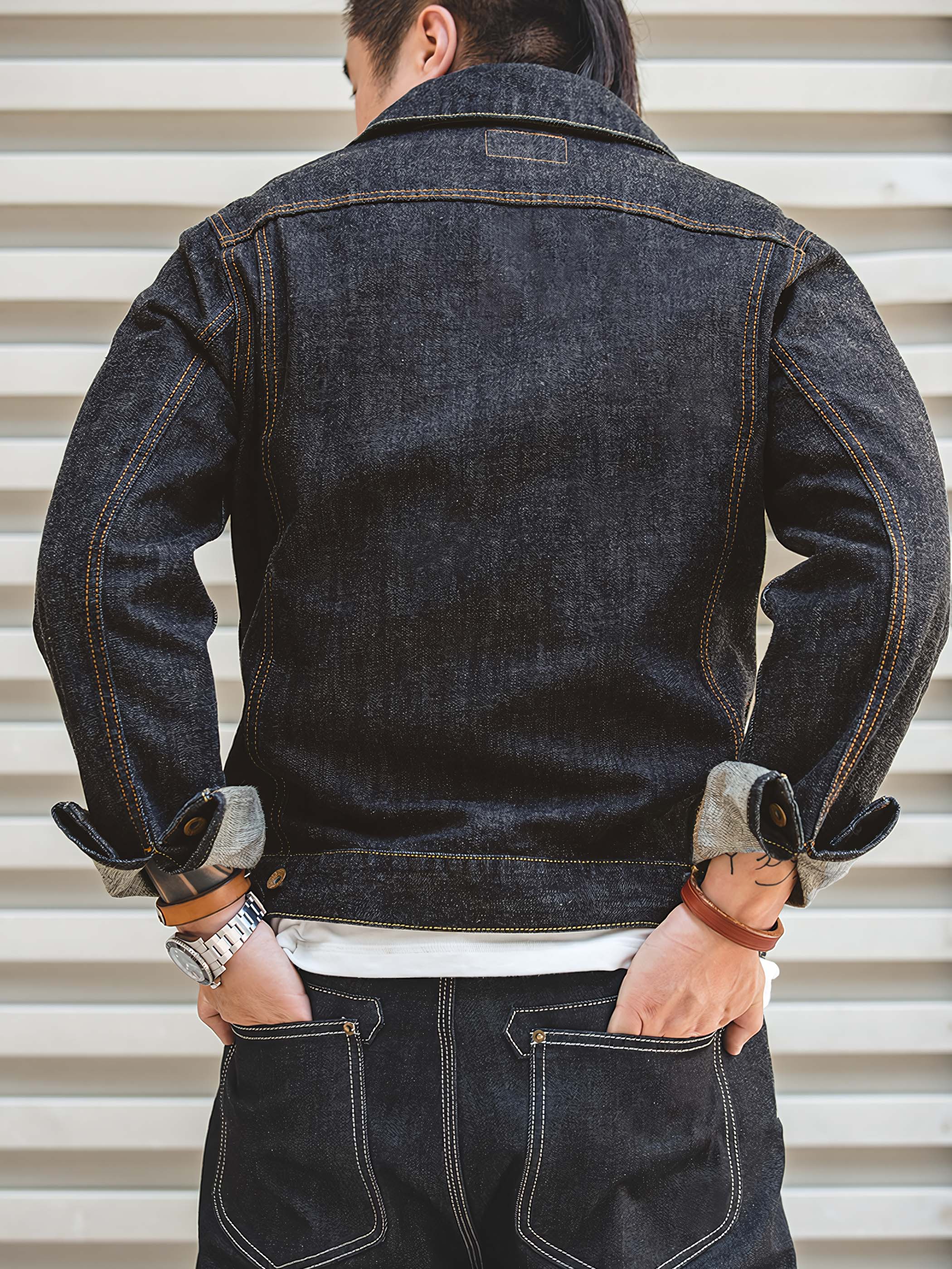 ディテールに関して、このジャケットは純粋なコットンデニム生地の本来の質感を保ち、毛を焼き切ることなく、綿の糸の毛羽を残しています。さらに、ジャケットには多くの明瞭なステッチデザインが施され、視覚的な奥行きを追加し、ジャケットに特別な要素を注入しています。