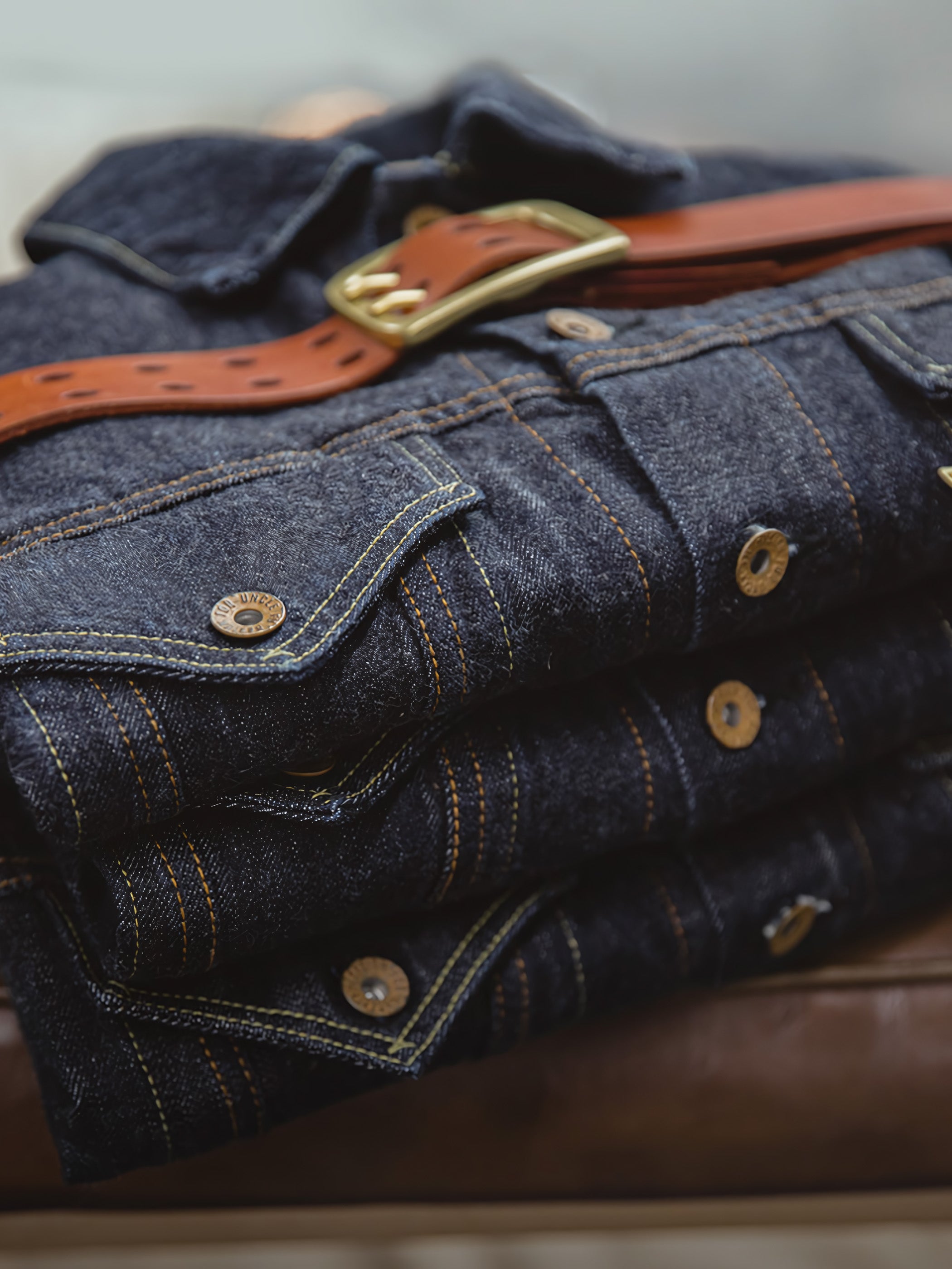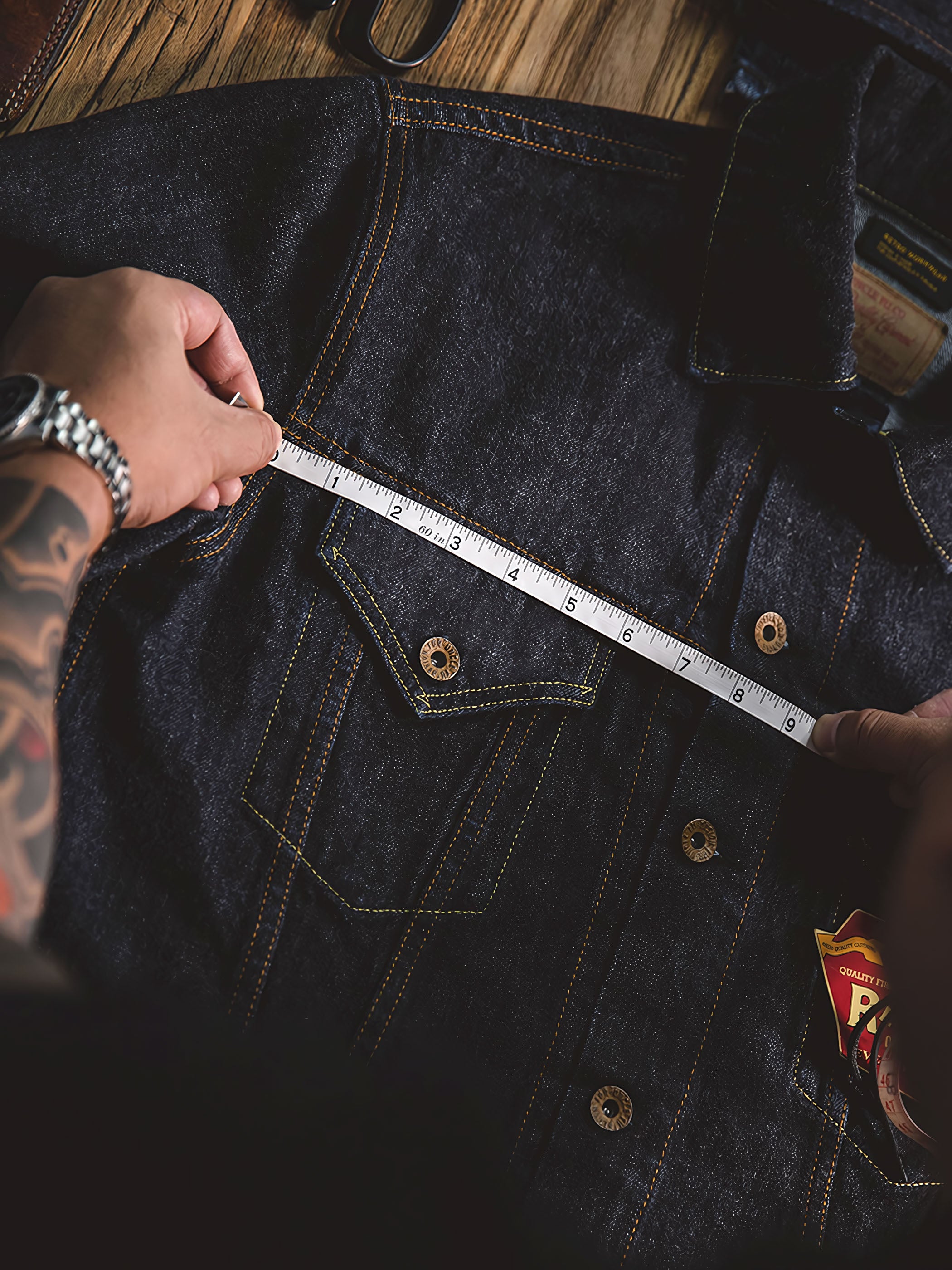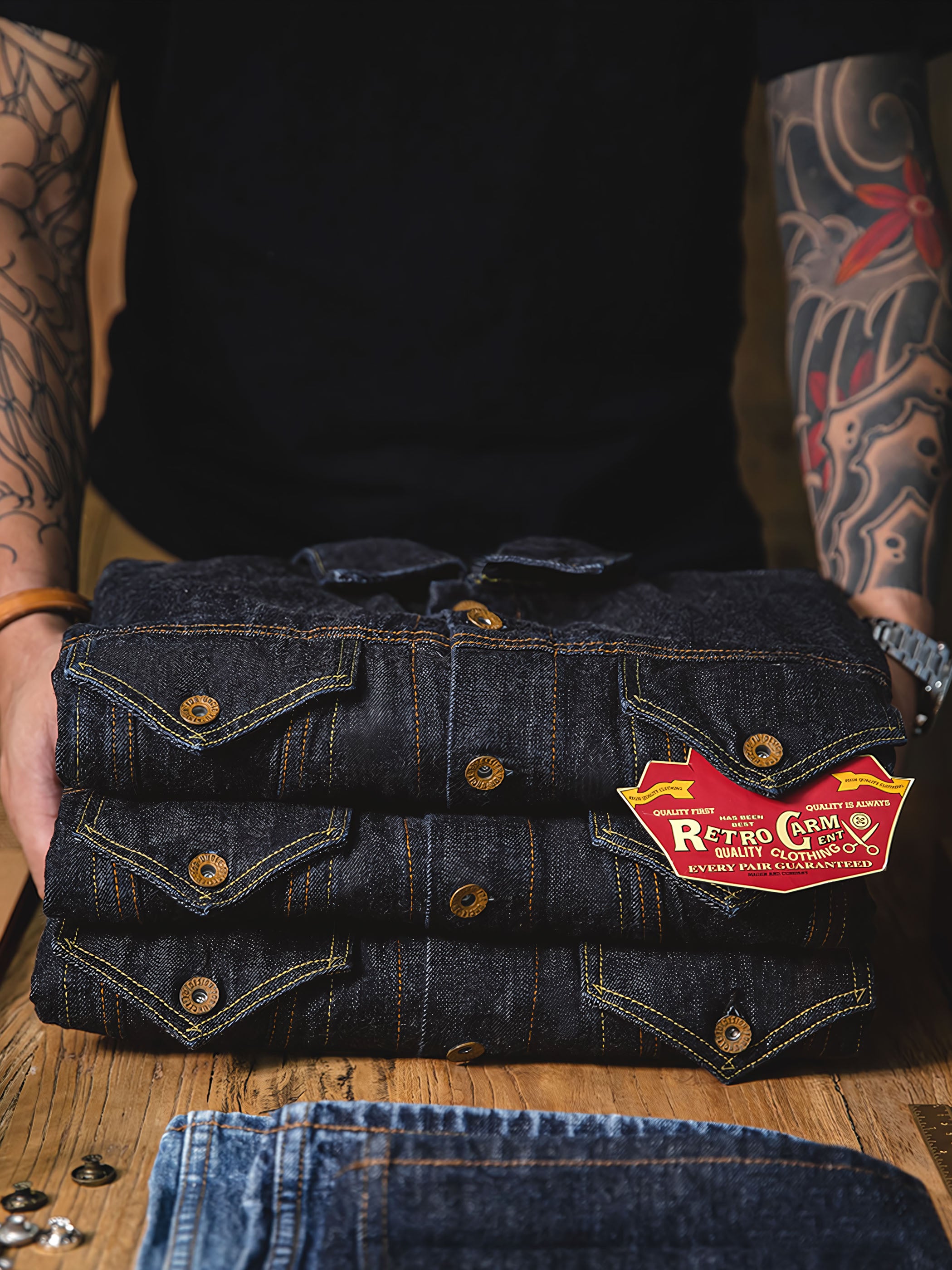ディテールに関して、このジャケットは純粋なコットンデニム生地の本来の質感を保ち、毛を焼き切ることなく、綿の糸の毛羽を残しています。さらに、ジャケットには多くの明瞭なステッチデザインが施され、視覚的な奥行きを追加し、ジャケットに特別な要素を注入しています。