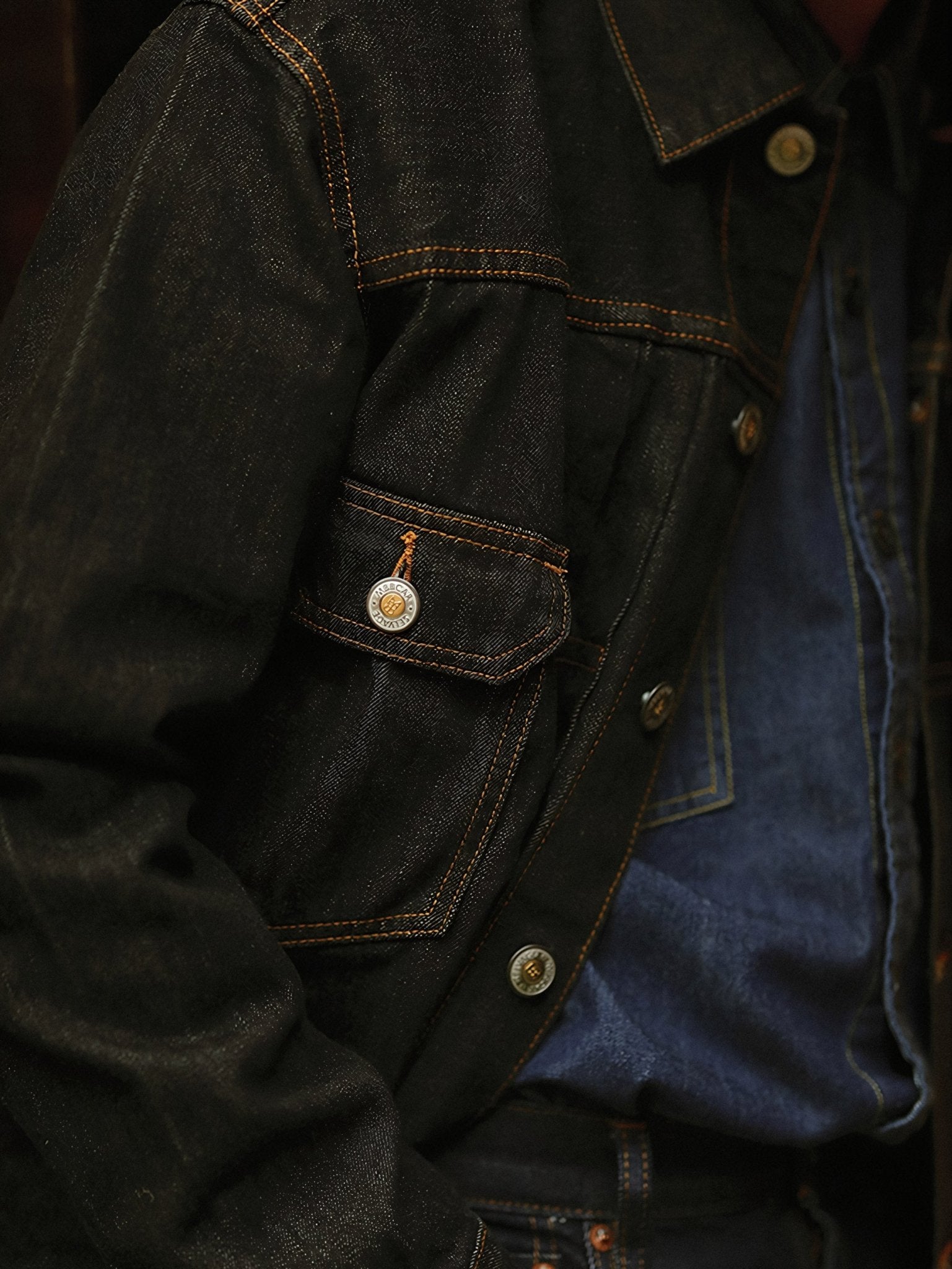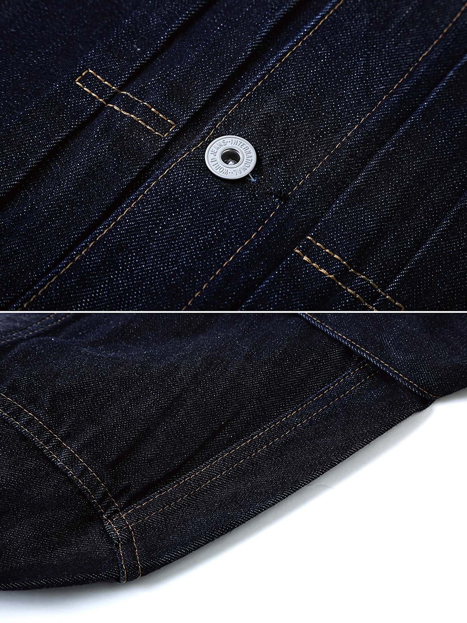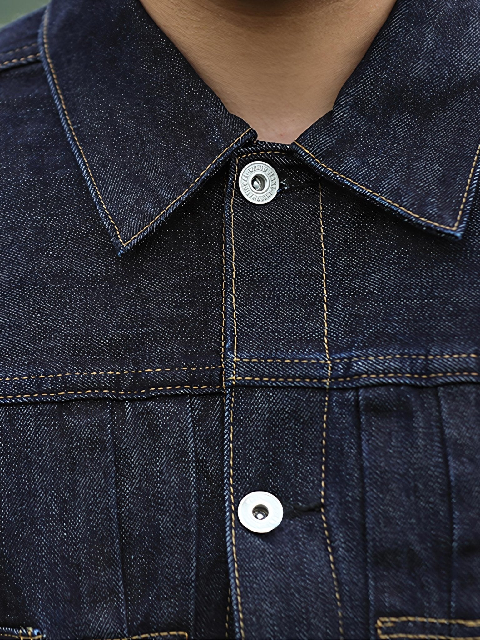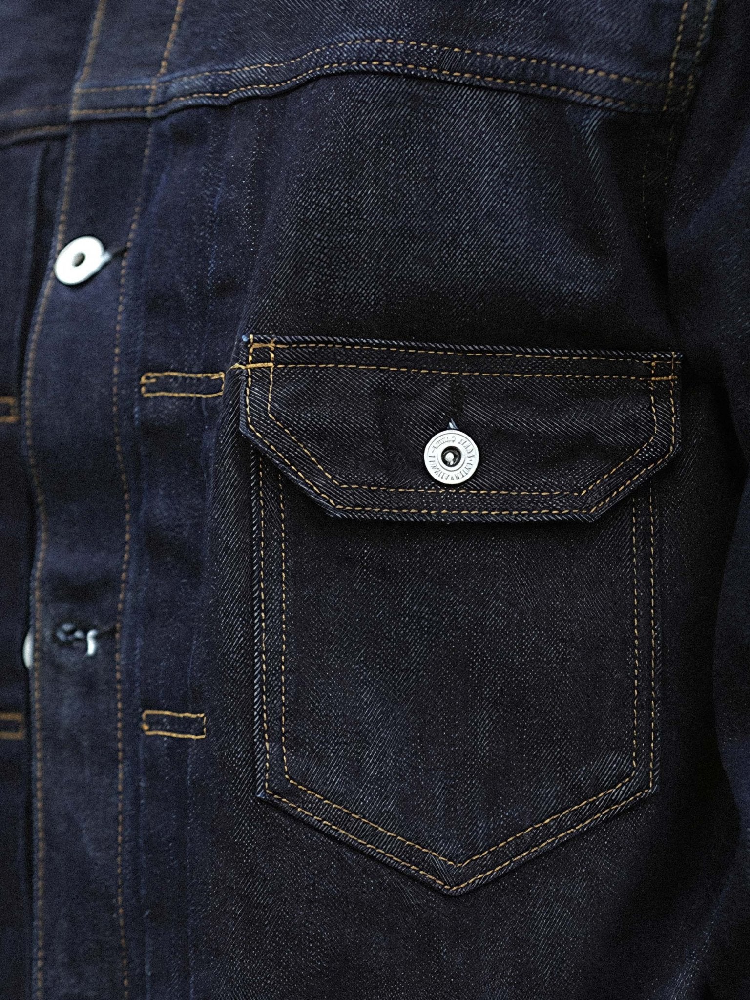 このデニムジャケットは前ポケットがフラップとボタンで装備されており、日常の使用において安全性を提供しています。