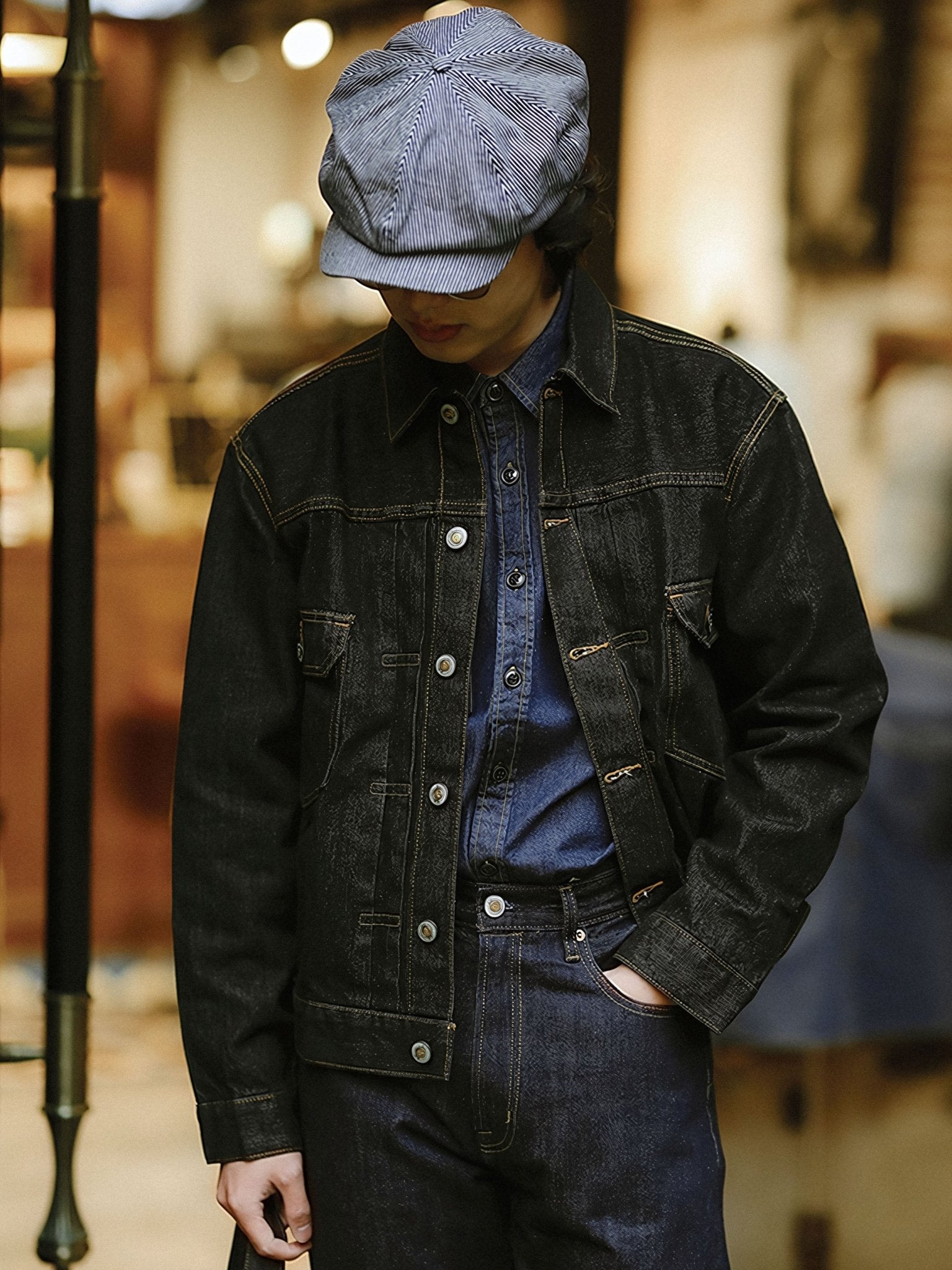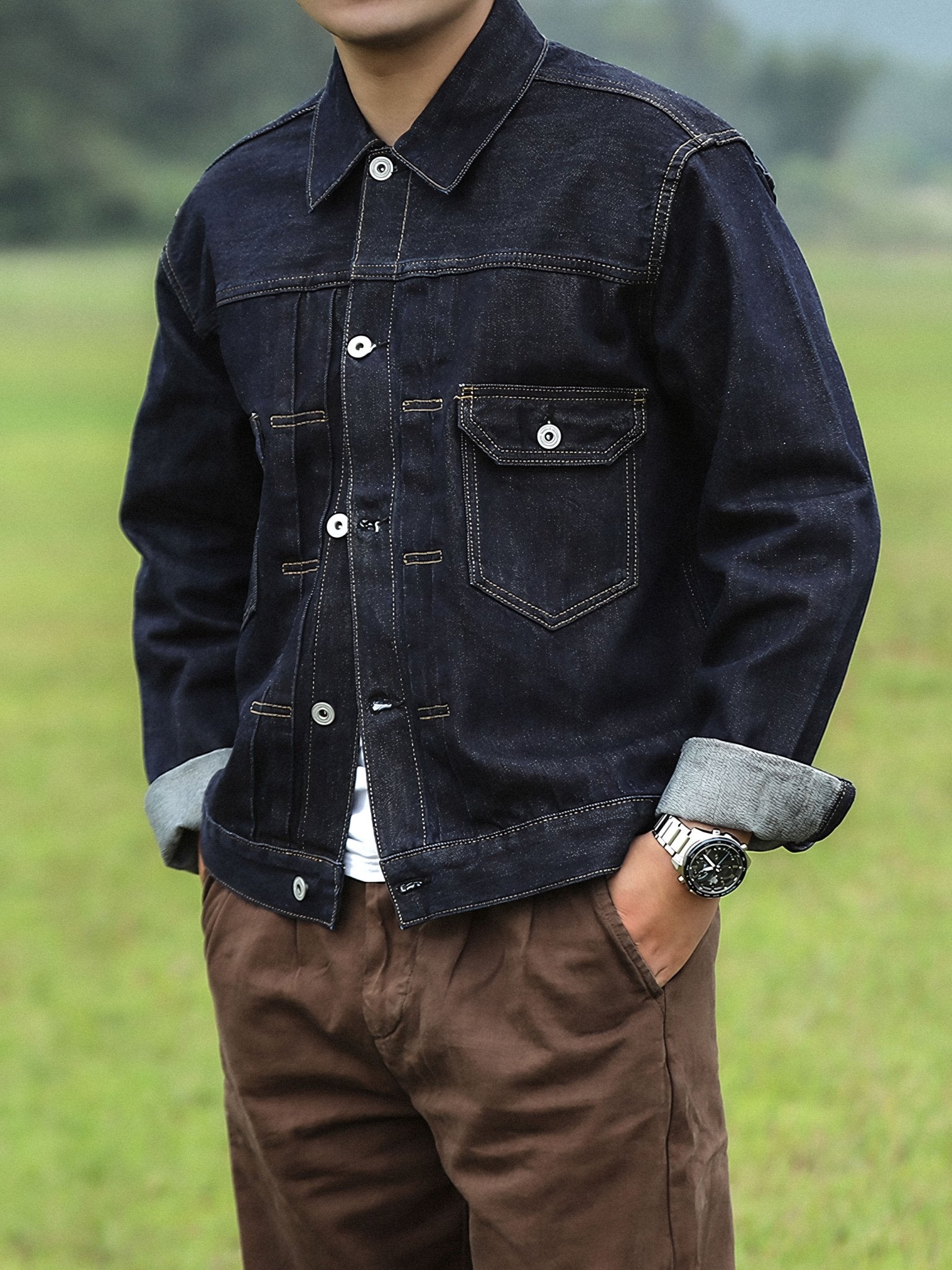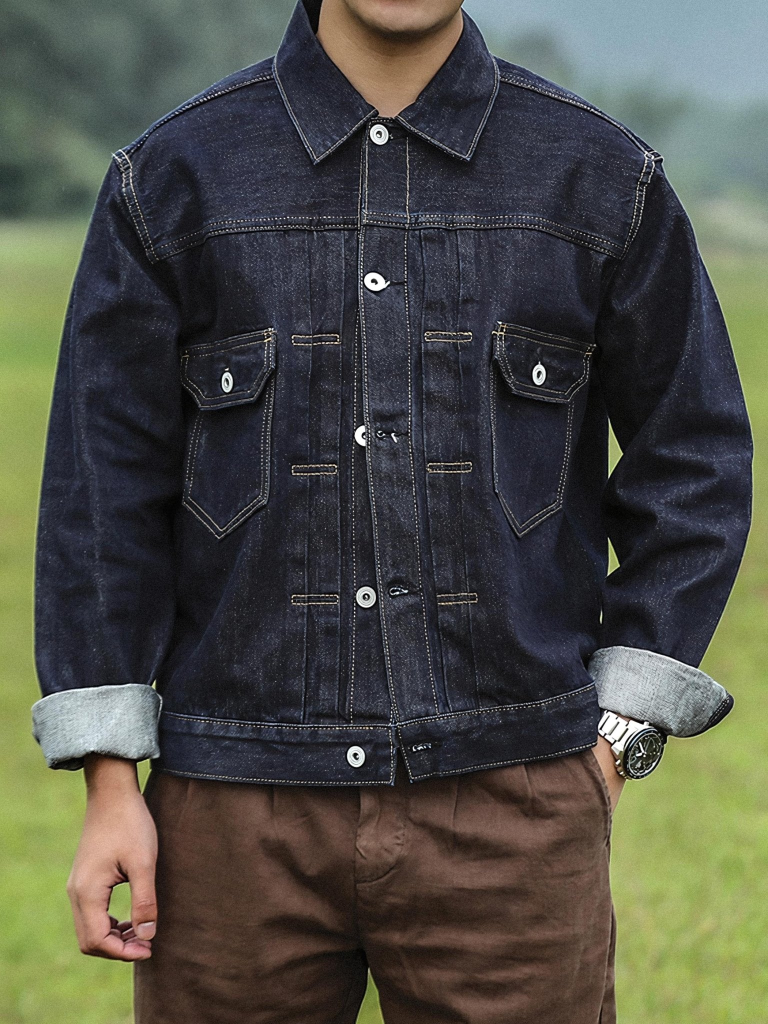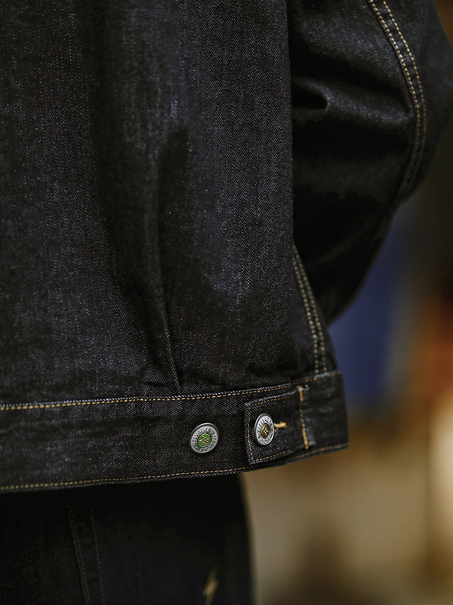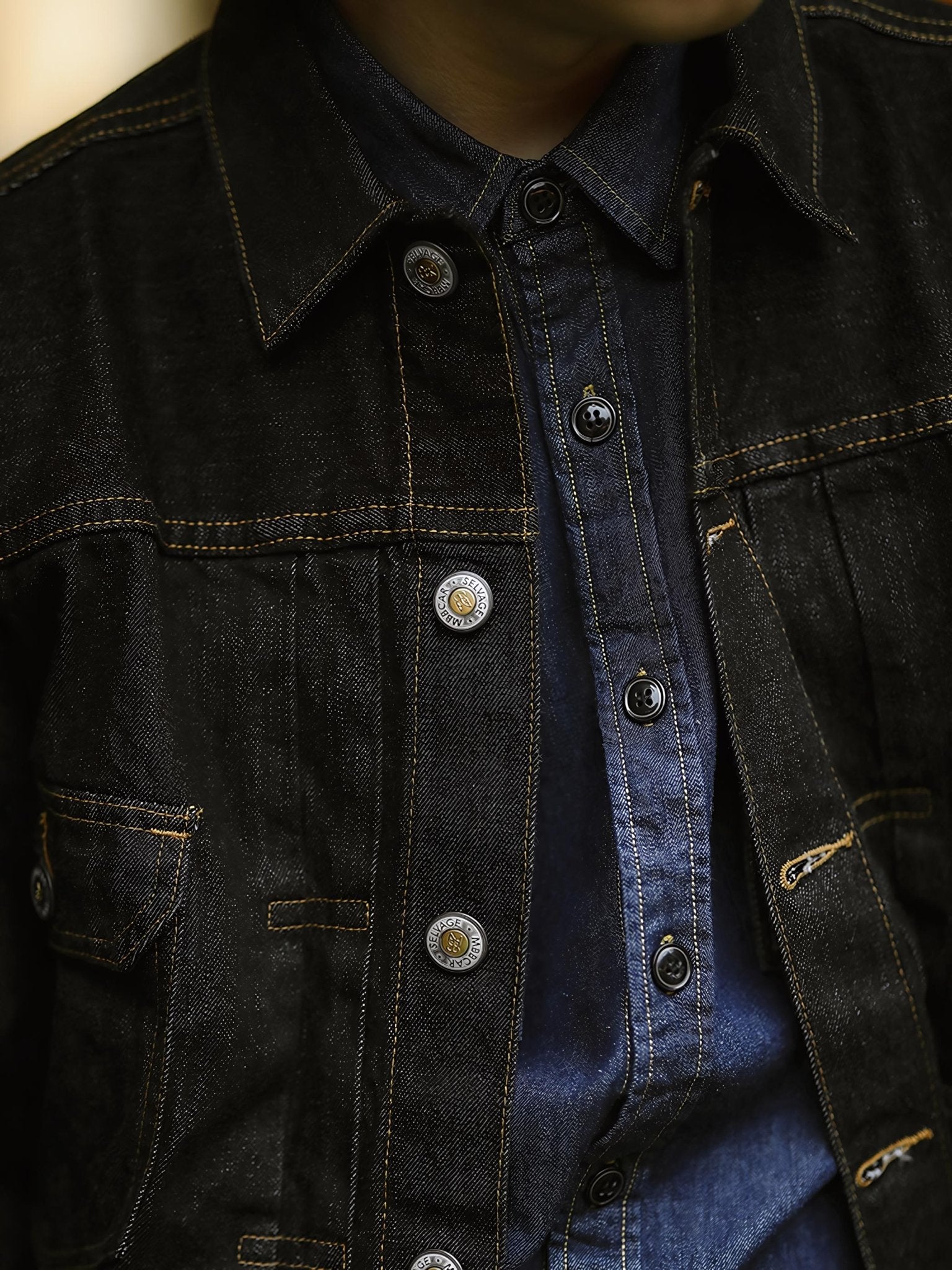 このデニムジャケットは前ポケットがフラップとボタンで装備されており、日常の使用において安全性を提供しています。