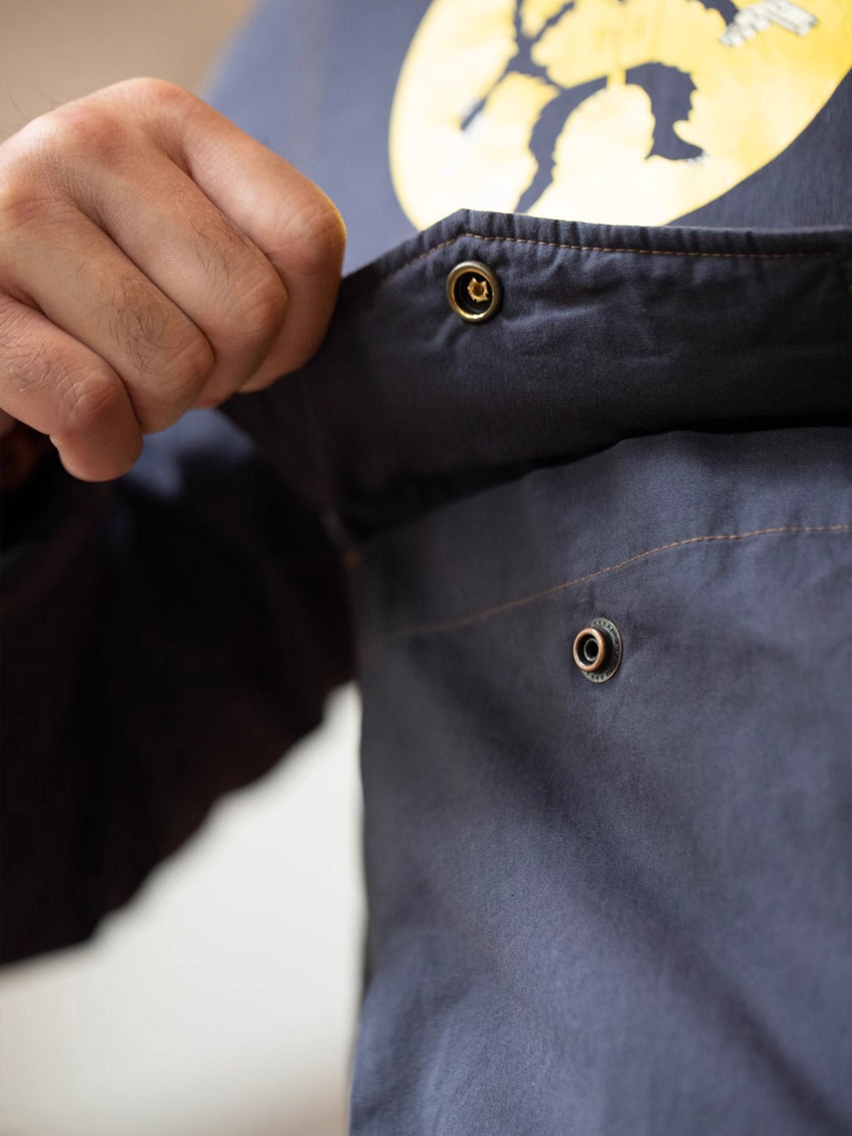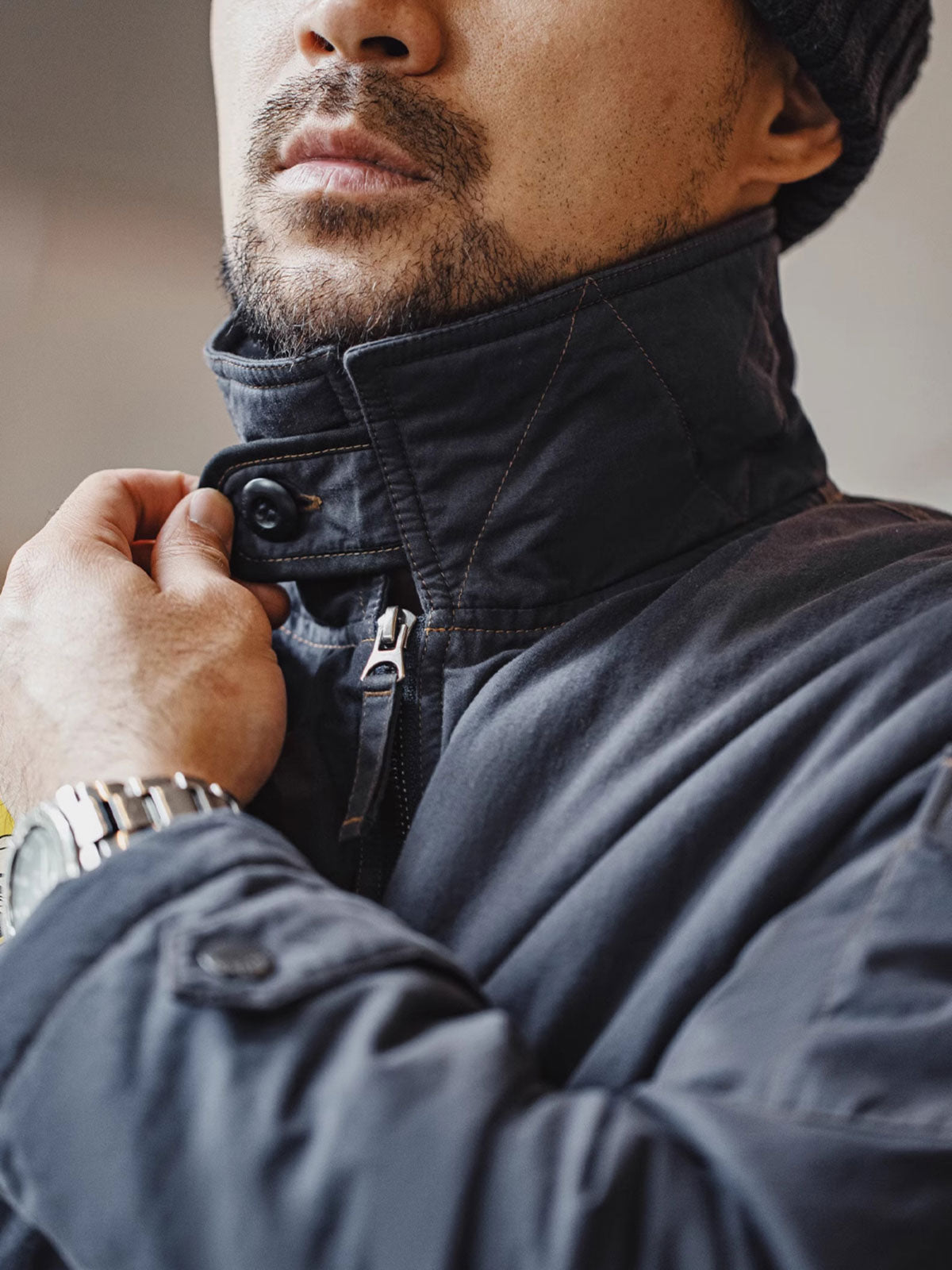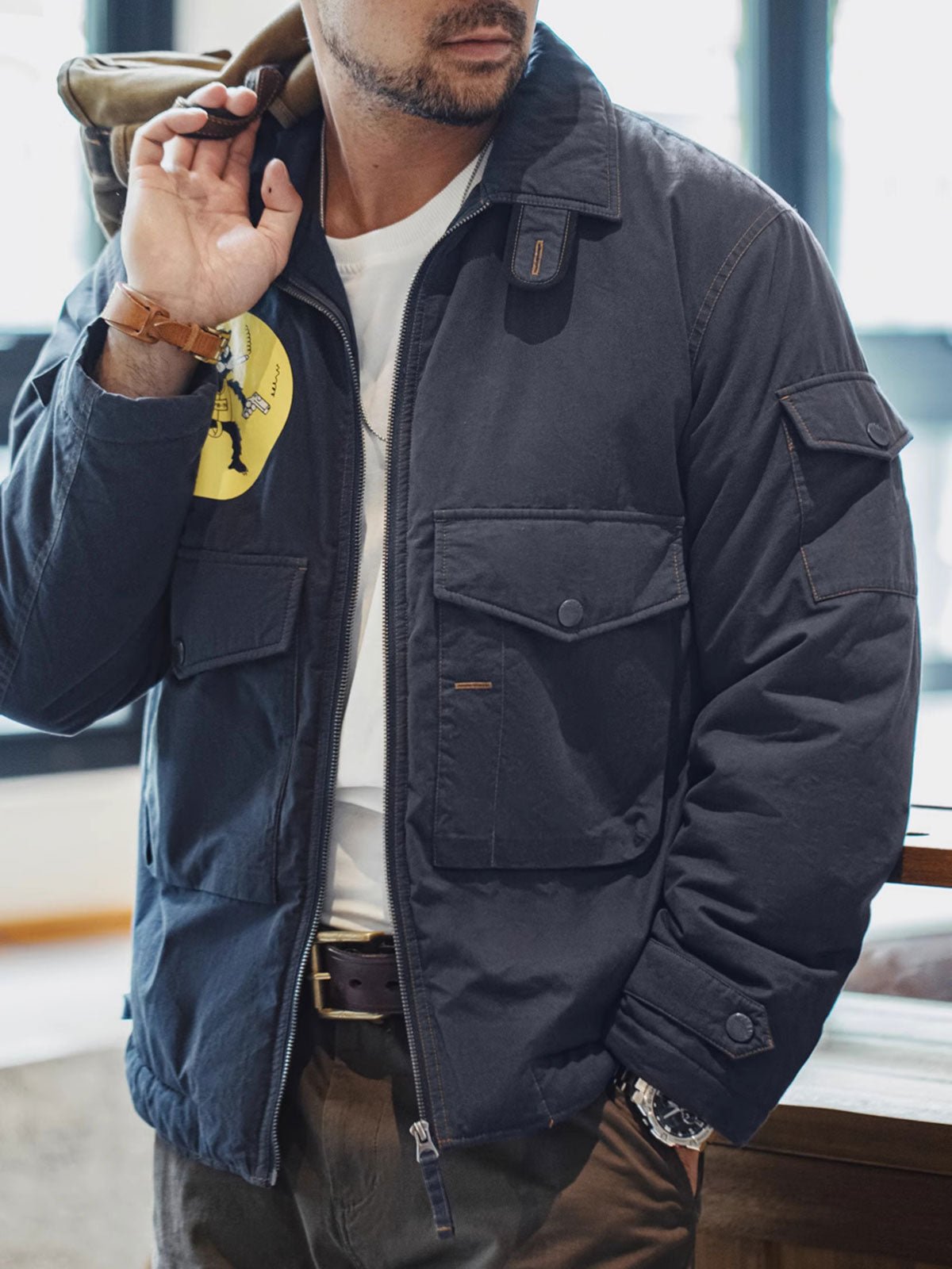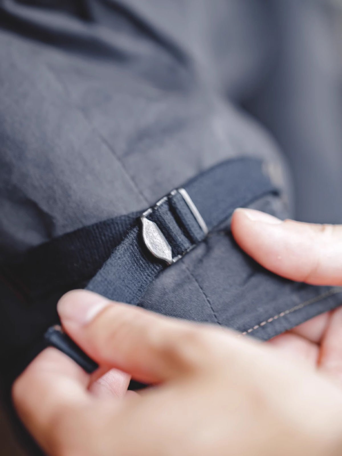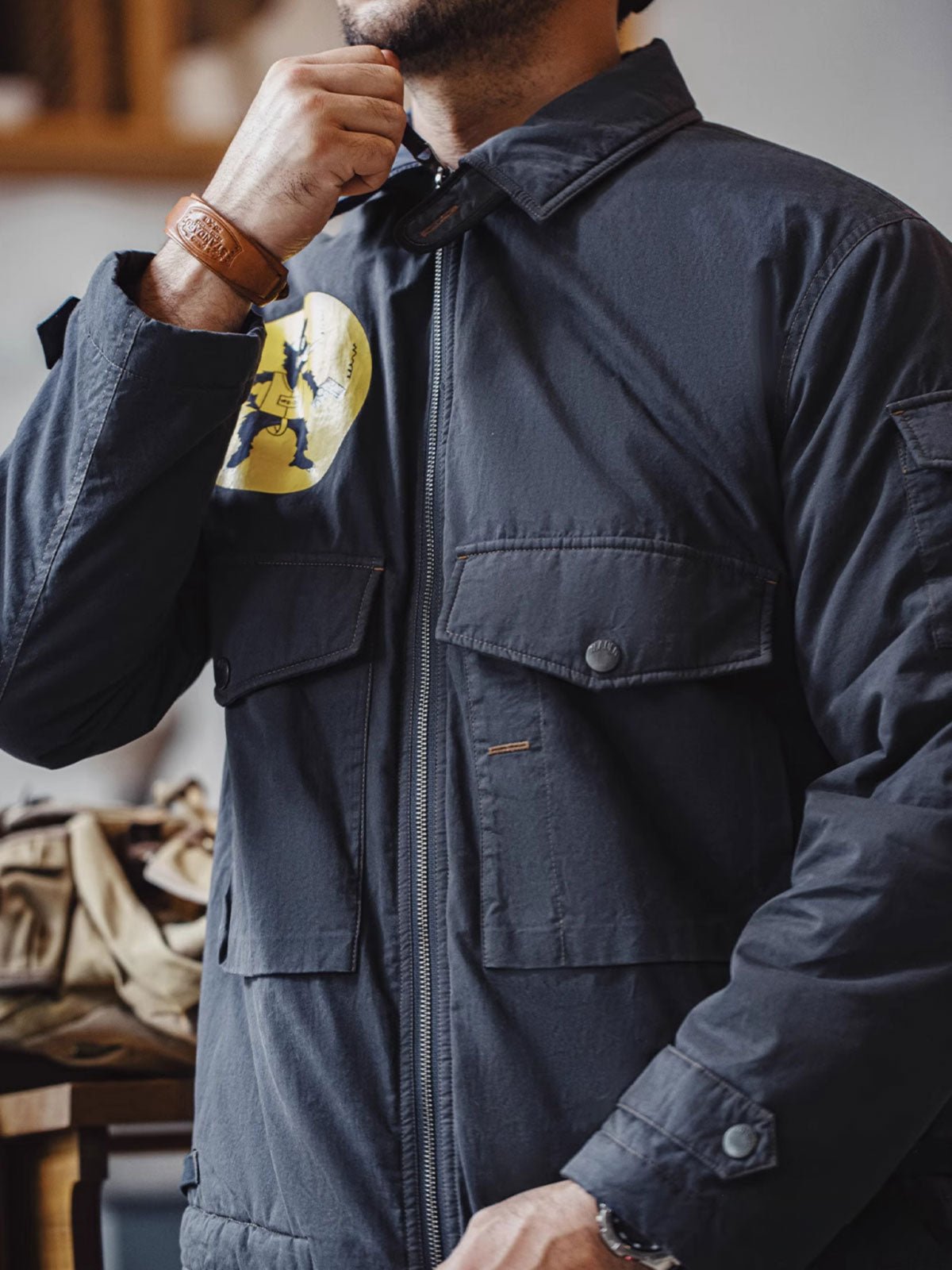 フロントには大きなマチがついたフラップポケットが配され、袖口はストラップとスナップで調整可能。サイドにもストラップが配置され、着用時のシルエット調整が可能です。