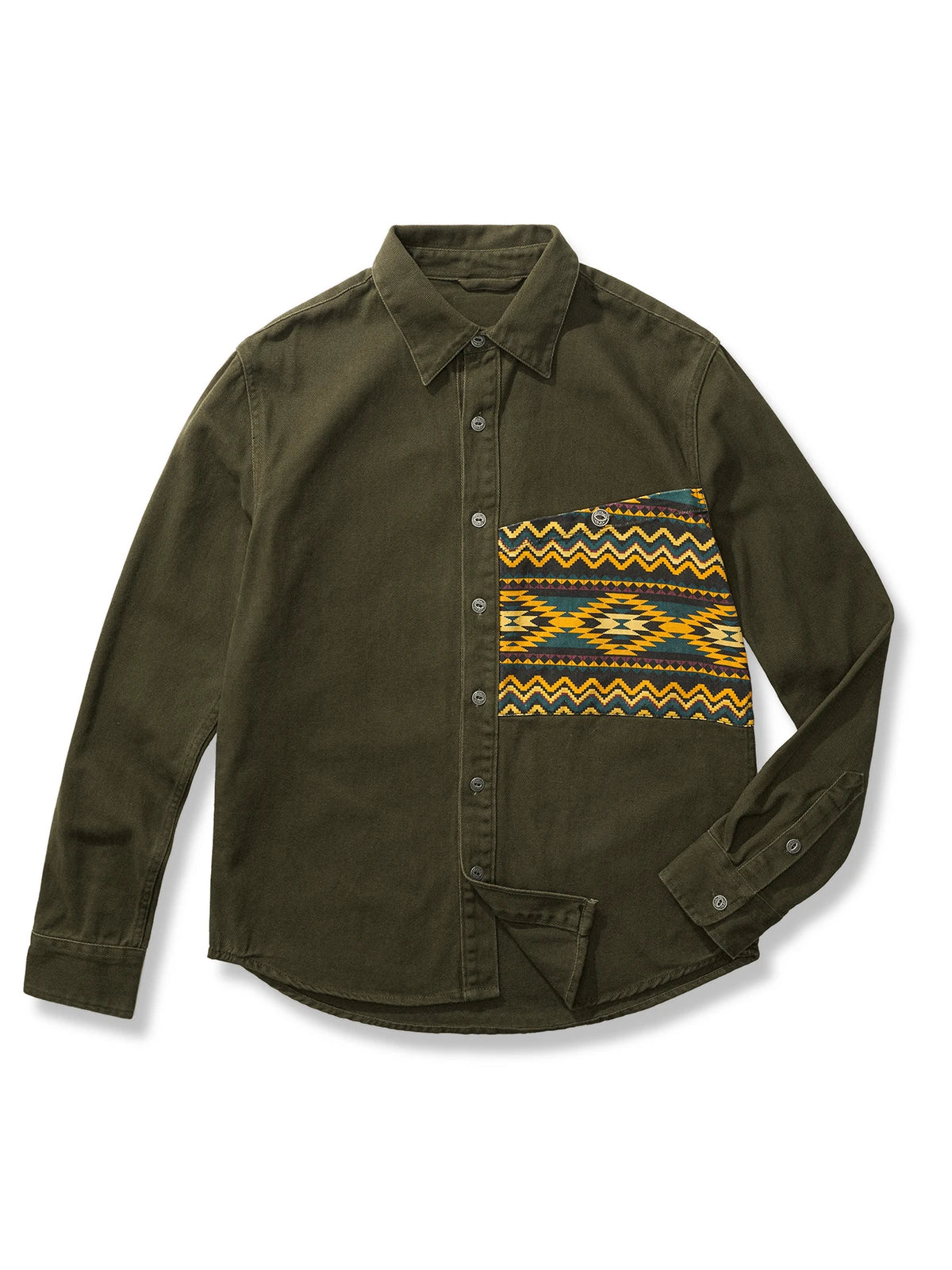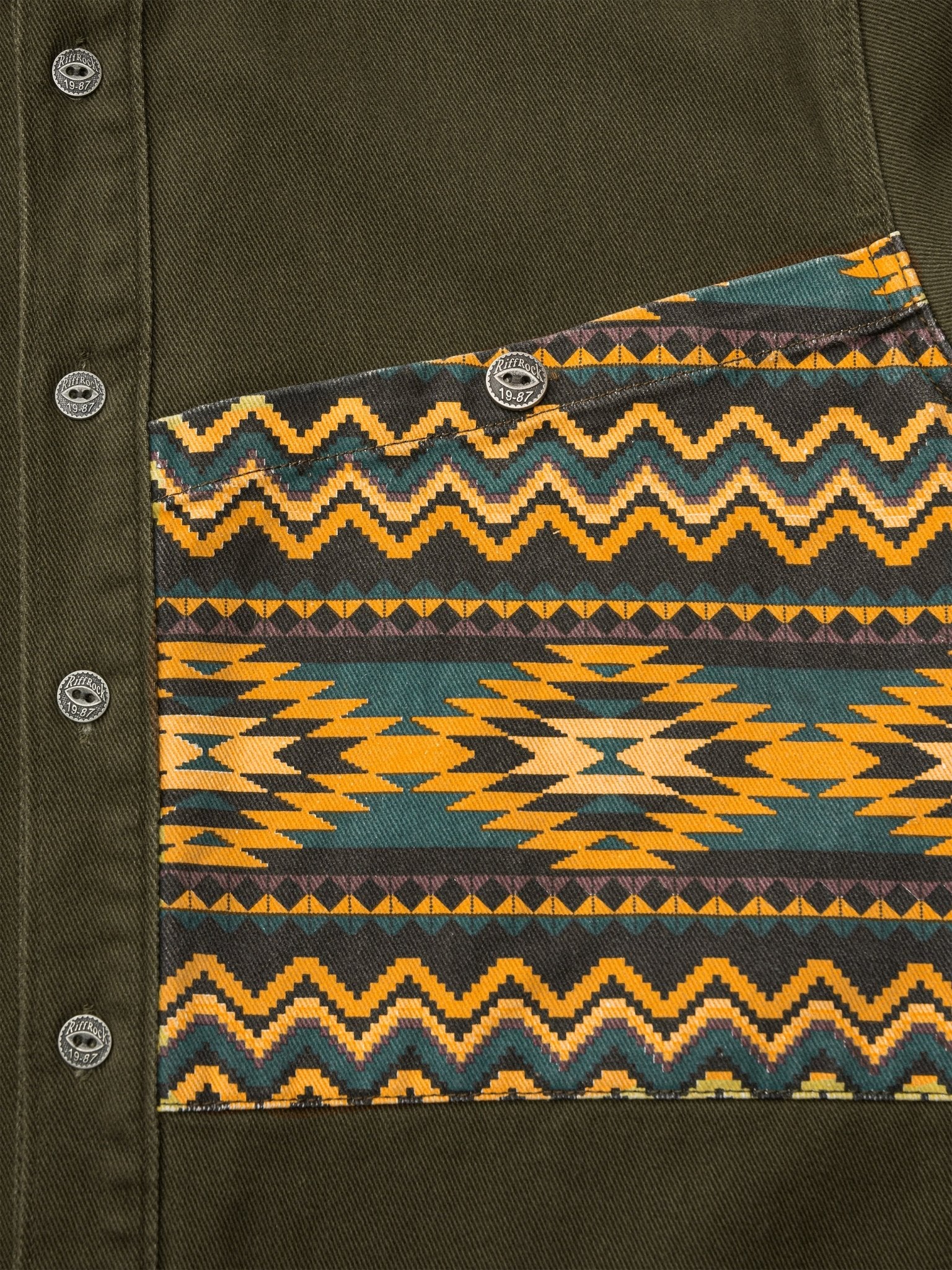 ジオメトリック(幾何学模様)のアメリカンインディアン風のトーテムポケットが付いた、大胆な民族風柄シャツジャケットです。色数を抑えた落ち着いた印象で、シャツアウターや冬アウターのミドルレイヤーとしても活用できます。
