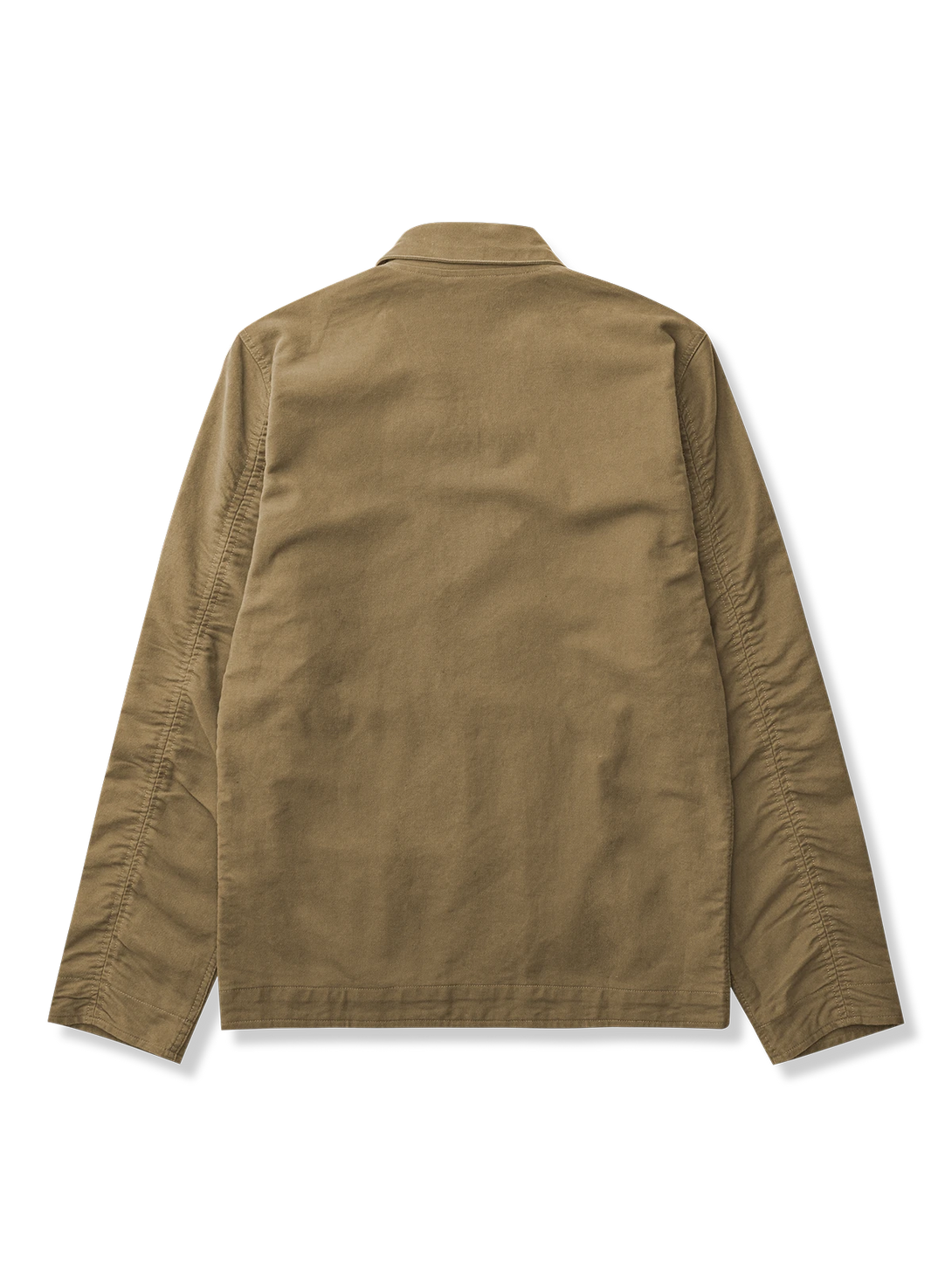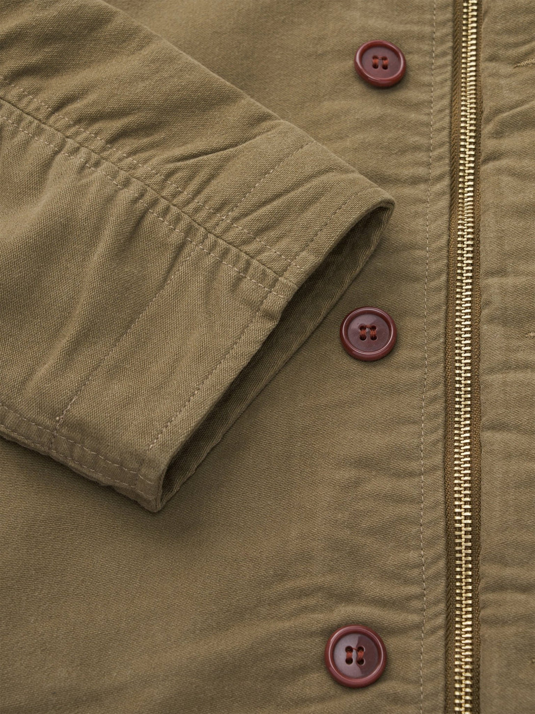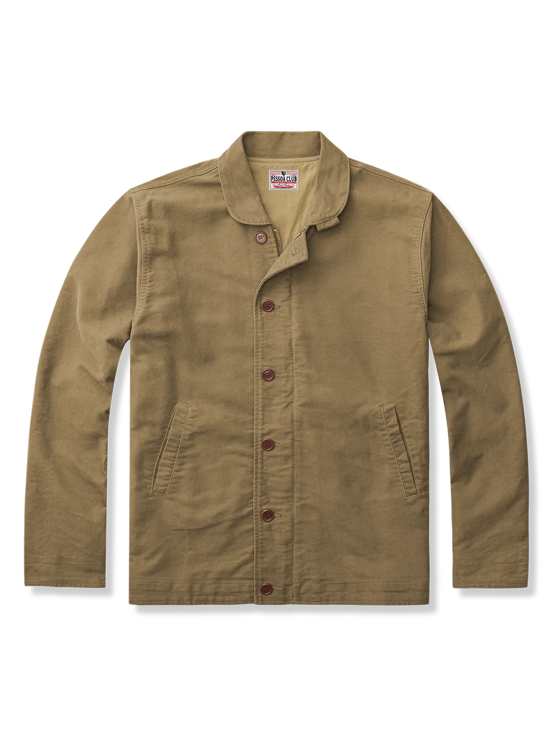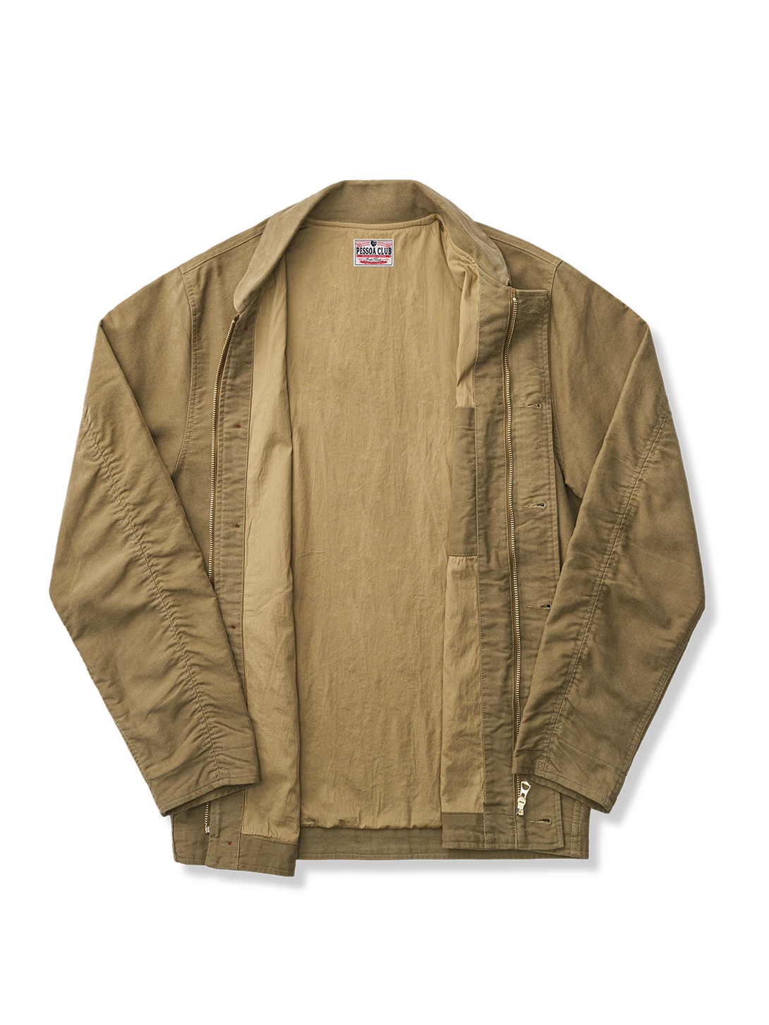 1950年代以前からフランスのワークウェアで使用された、モールスキンという素材を使用しています。厚くてモチっとした肌触りが特徴的で、コットンでできています。光沢があり、経年変化が素晴らしく着込むほど色が褪せていくのが魅力です。