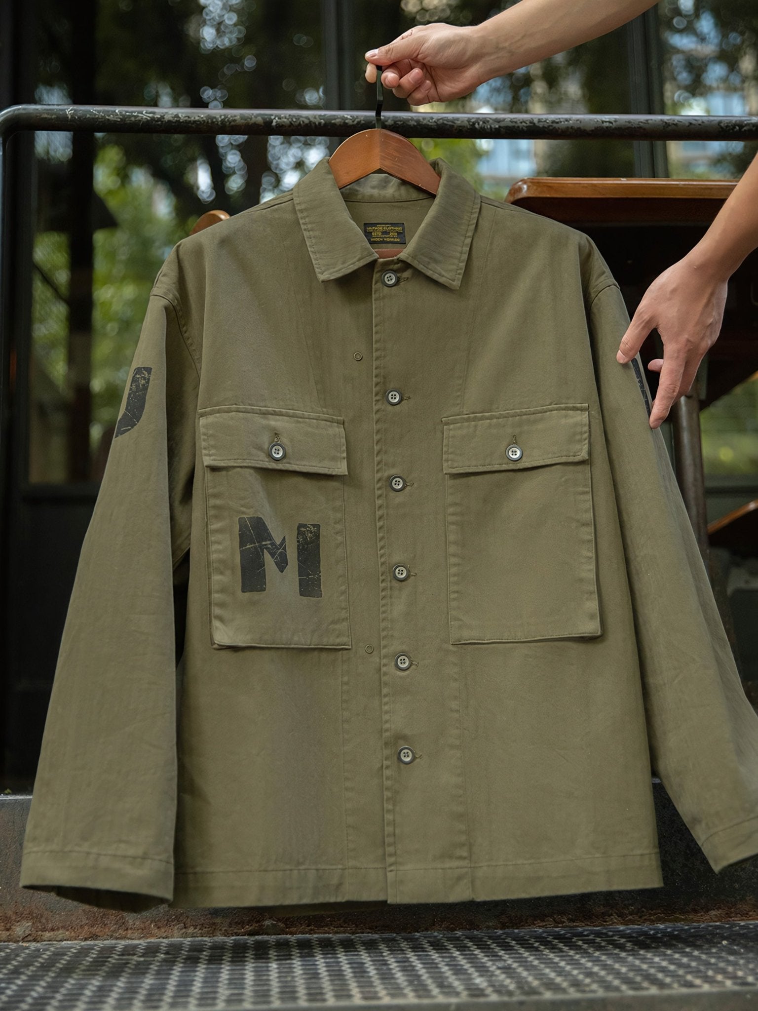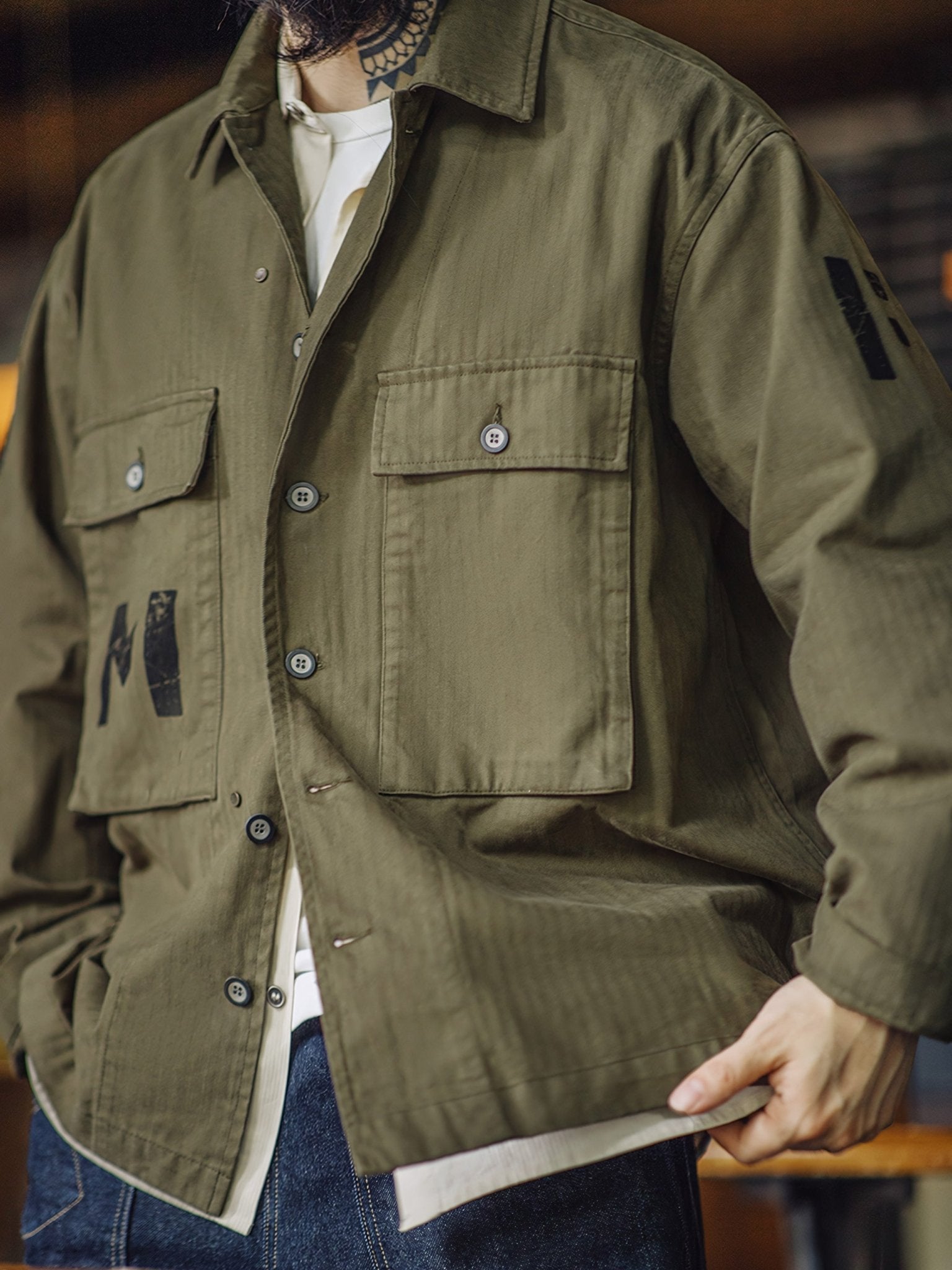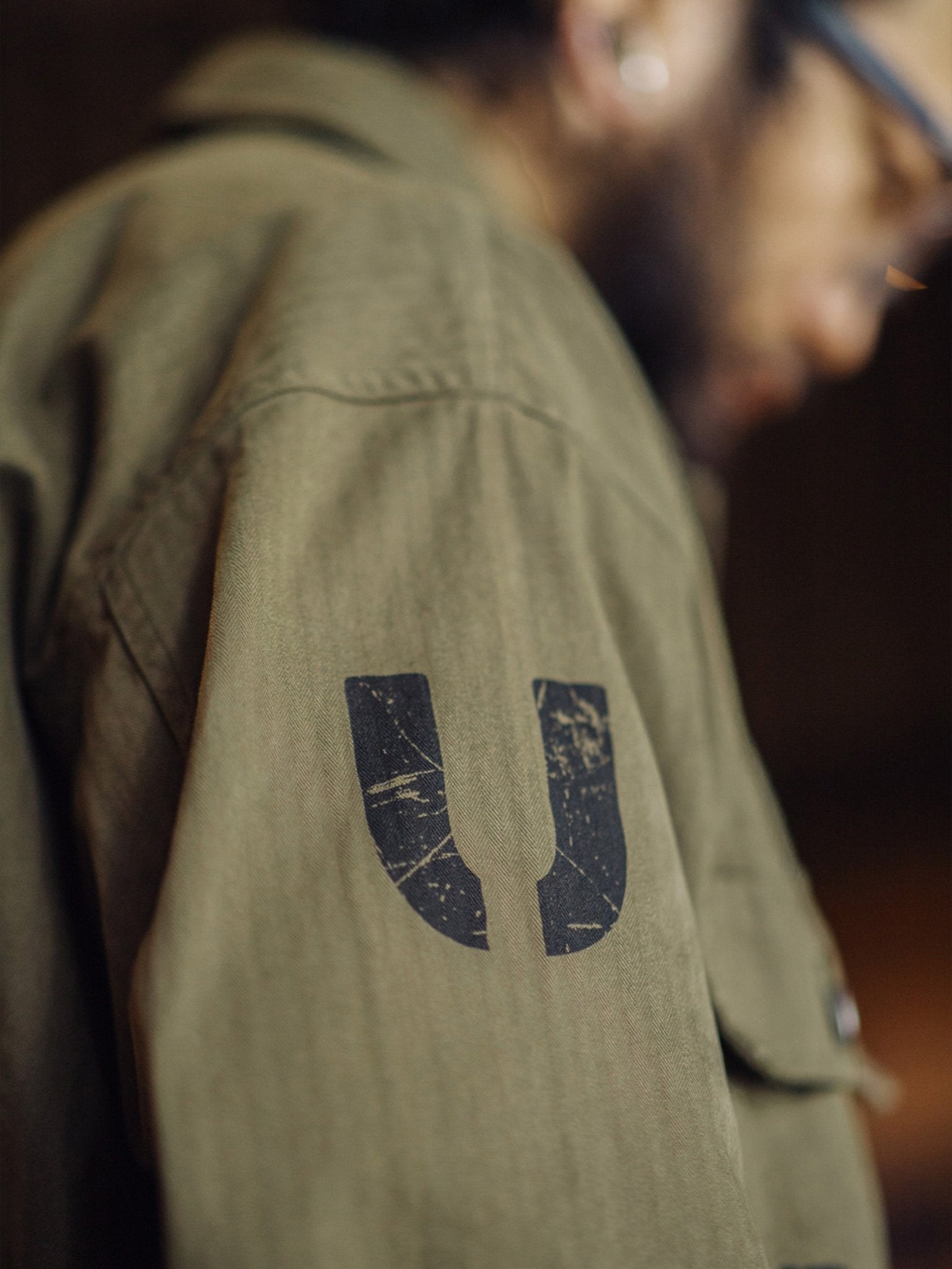 このジャケットのデザインは、軍事スタイルからインスパイアされ、ヘリンボーンワークジャケットをベースにしています。最も際立ったデザイン要素の一つは、軍事スタイルのグラフィティです。これらのグラフィティはジャケットに独自の軍隊風スタイルを与え、制式の装備にある銘文を再現し、全体のデザインに本物の軍隊の雰囲気を加えています。