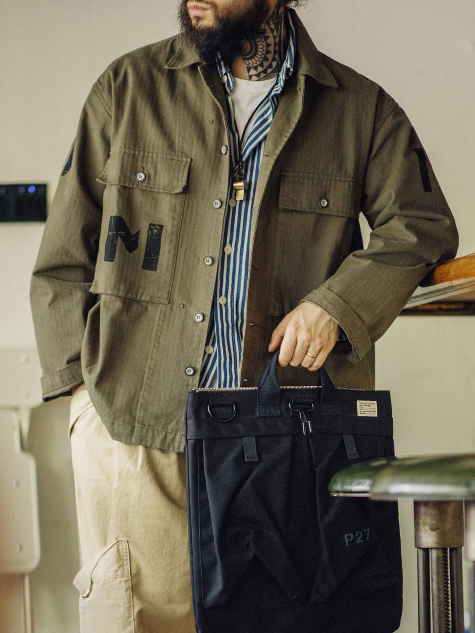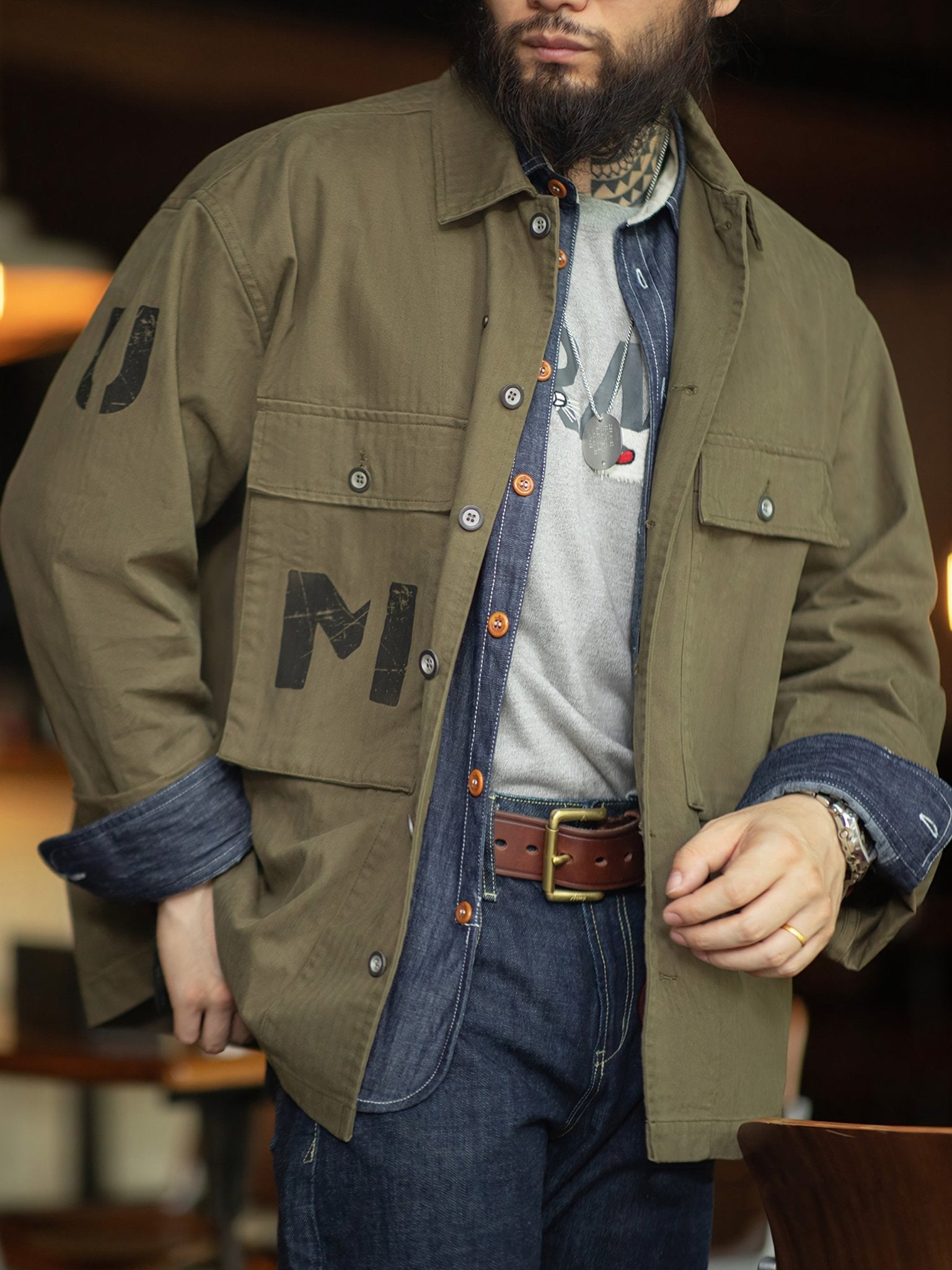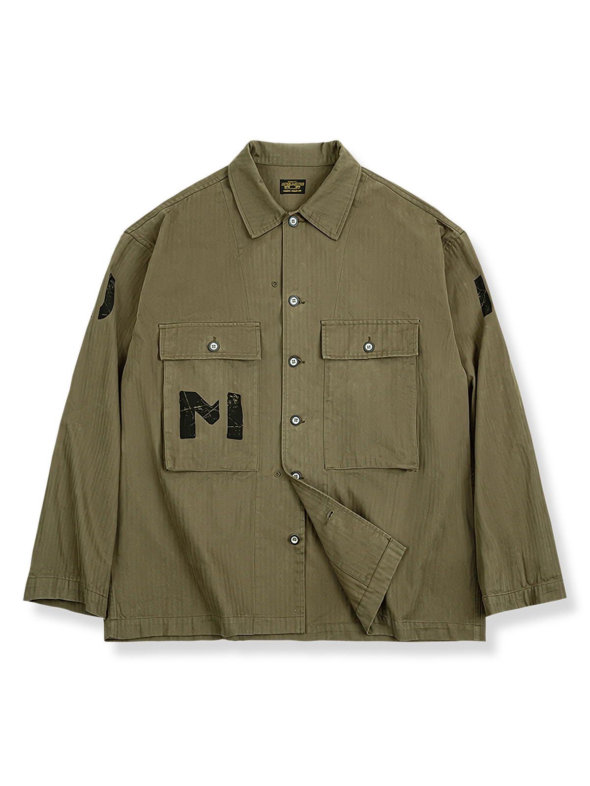 このジャケットのデザインは、軍事スタイルからインスパイアされ、ヘリンボーンワークジャケットをベースにしています。最も際立ったデザイン要素の一つは、軍事スタイルのグラフィティです。これらのグラフィティはジャケットに独自の軍隊風スタイルを与え、制式の装備にある銘文を再現し、全体のデザインに本物の軍隊の雰囲気を加えています。