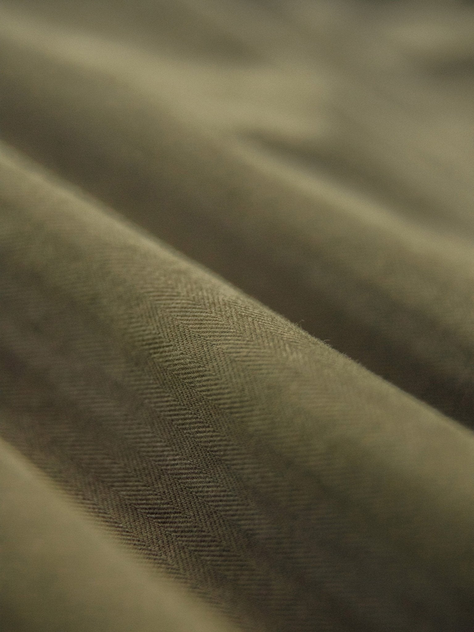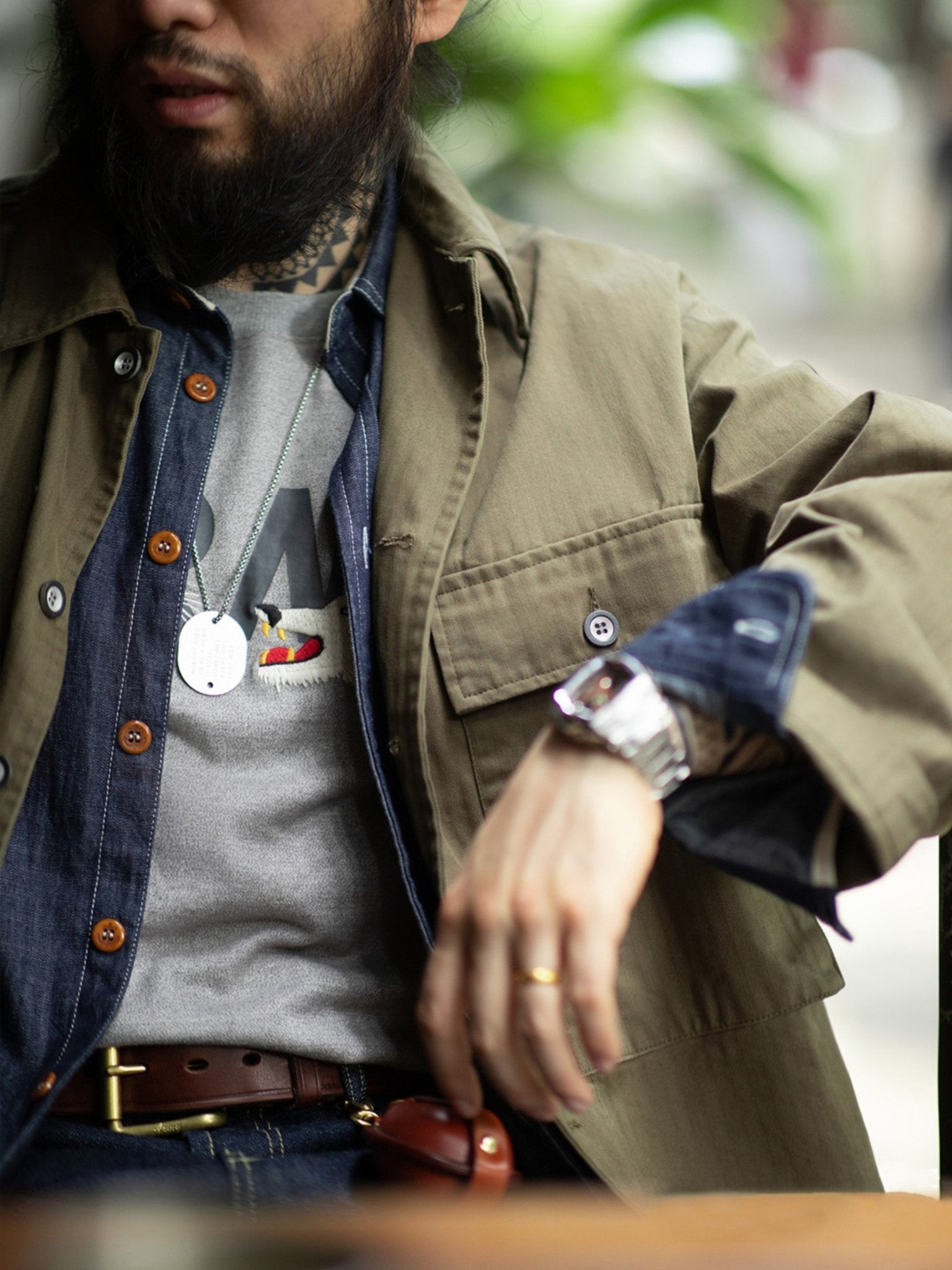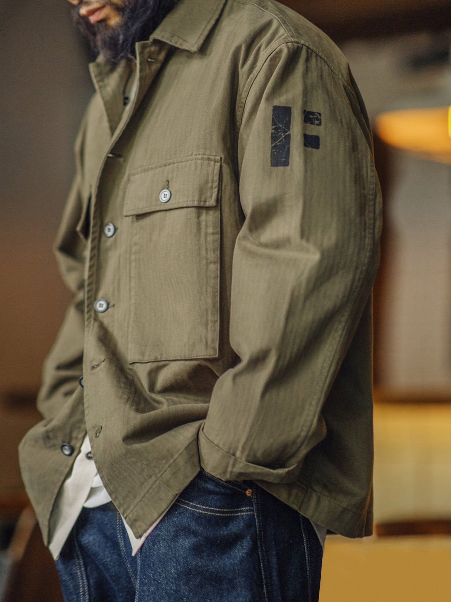 このジャケットはヘリンボーンワークジャケットのシルエットを採用しており、通常はゆったりとしたカットが特徴です。