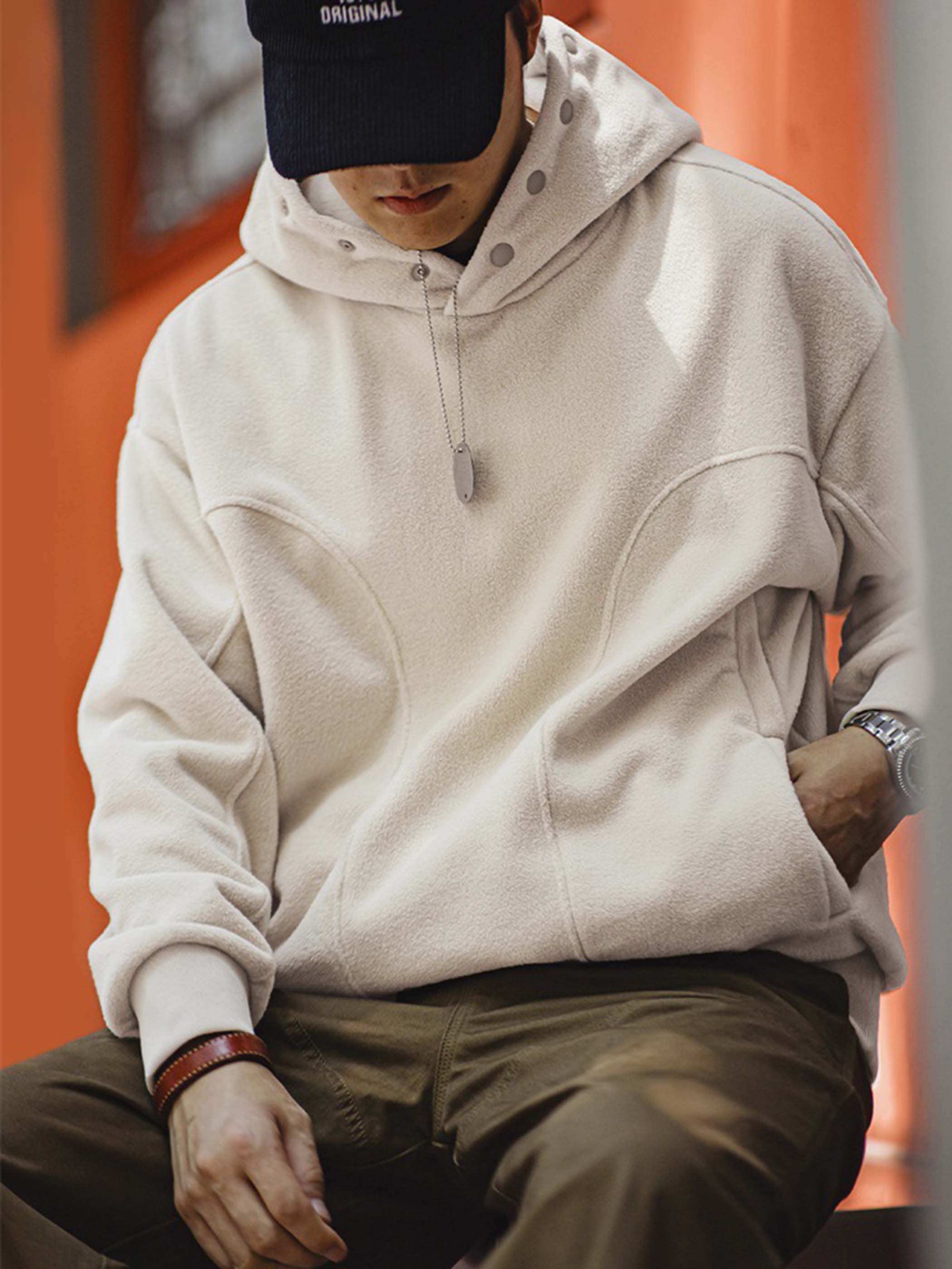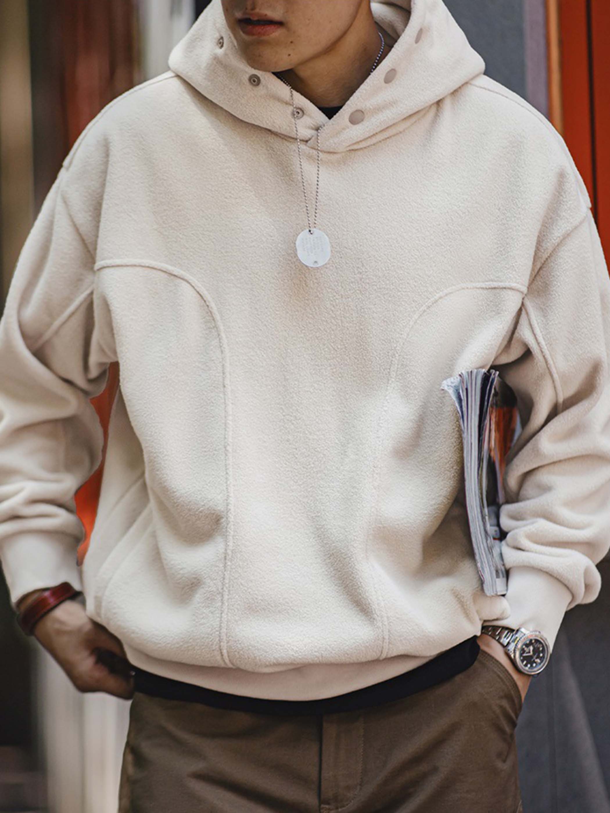 柔らかく保温性に優れた両面フリース素材を採用し、寒い季節でも暖かさをキープ。300gの高密度フリースを使用することで、適度なハリ感と耐久性を持ち、型崩れしにくいのが特徴。フード部分には8つのスナップボタンを搭載し、気温やシーンに応じて開閉の調整が可能。表面にはダブルブラッシュ加工を施し、防風性を高めつつ、肌触りの良さと通気性を両立。袖口と裾には高弾力リブを採用し、しっかりフィットすることで冷気の侵入を防ぐ設計。ルーズフィットシルエットで、カジュアルスタイルやストリートコーデにも馴染みやすく、冬のレイヤードスタイルにも最適。